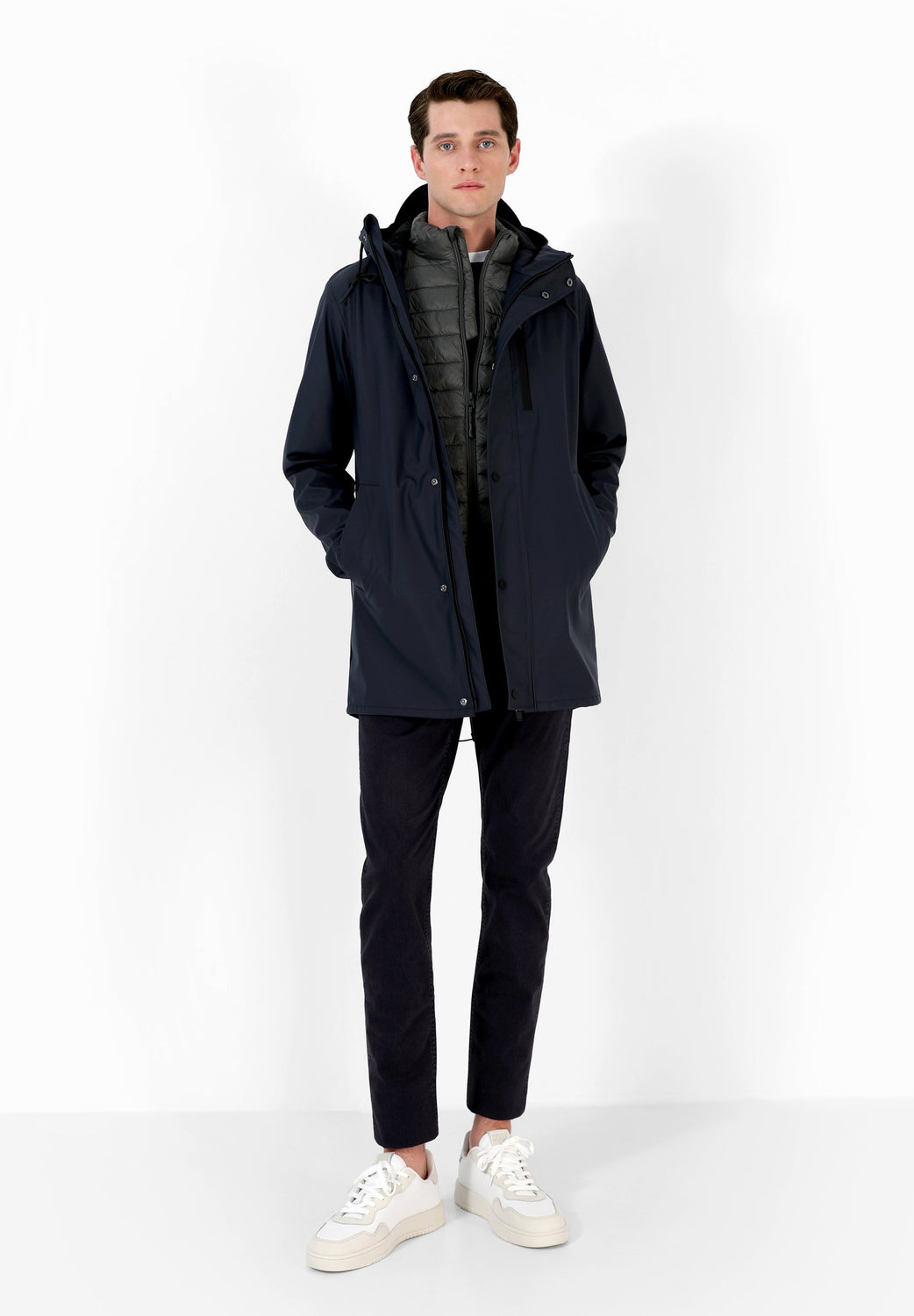 Chaquetón impermeable. Corte Regular Fit, cuello con capucha ajustable y cierre con cremallera de doble carro termosellada y botones automáticos. Manga larga terminada en puño con botones automáticos. Bolsillos de cremallera en pecho e insertados en cintura. Abertura trasera.
