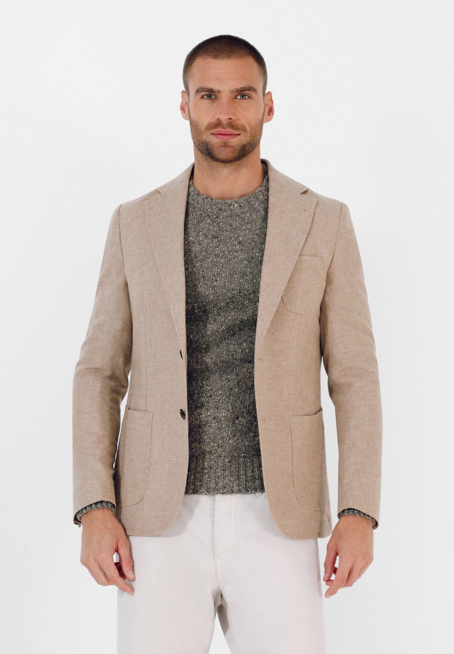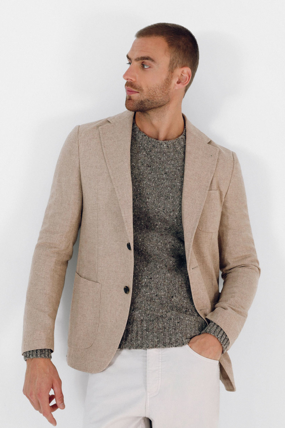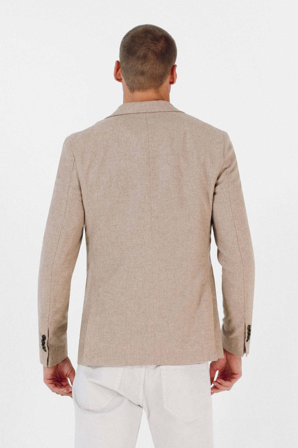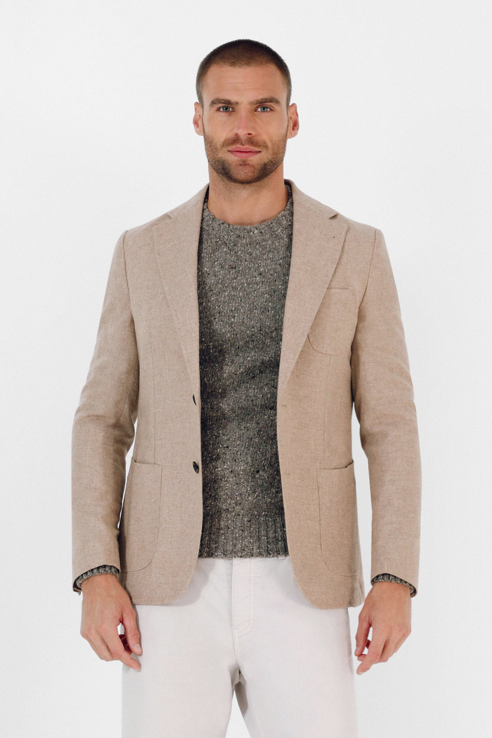 Americana casual confeccionada en tejido mezcla de lana. Corte Regular Fit, cuello con solapa y cierre con botones. Manga larga terminada en puño con botones y bolsillos laterales de plastrón.