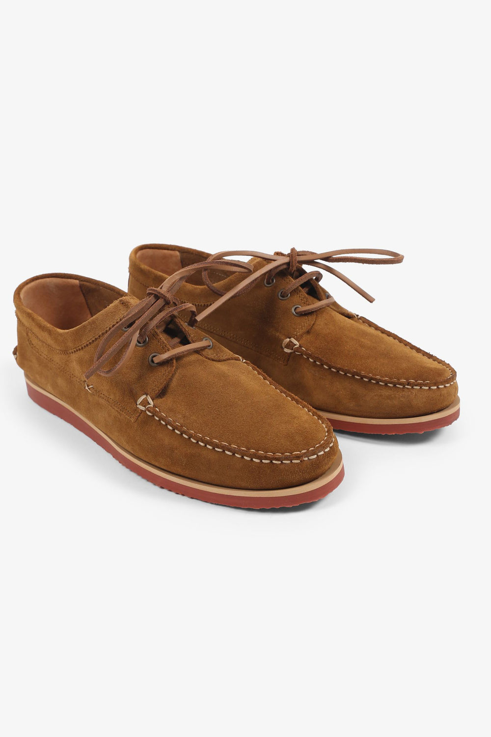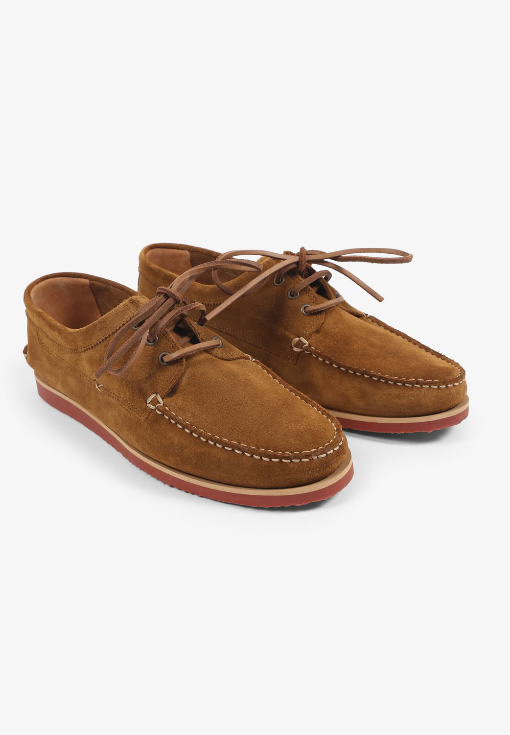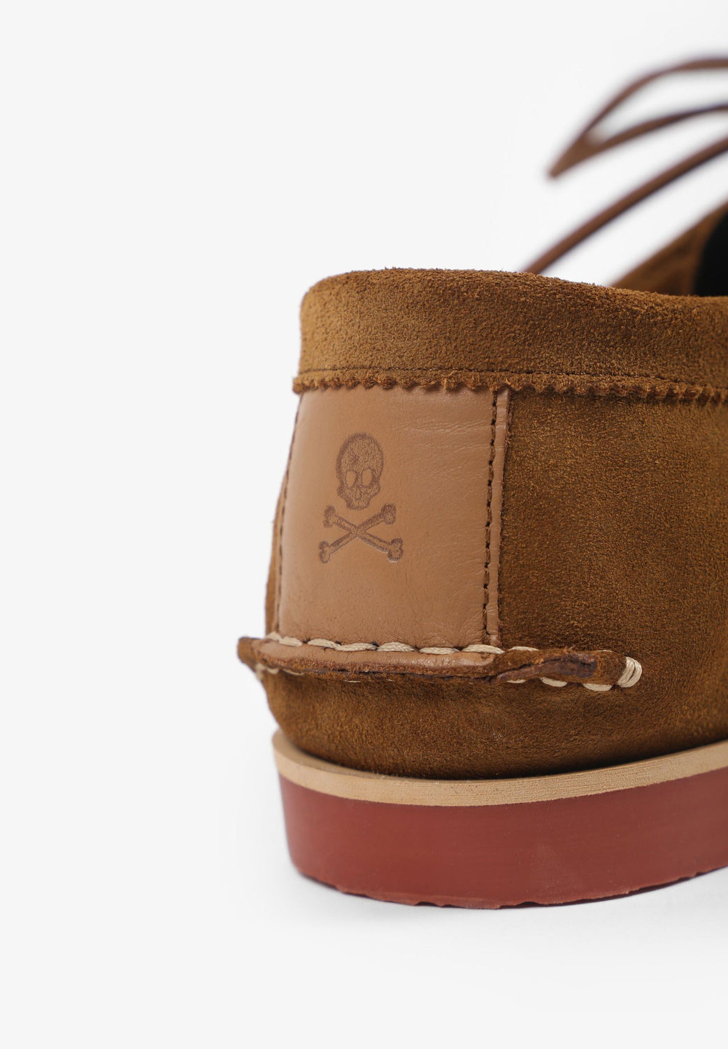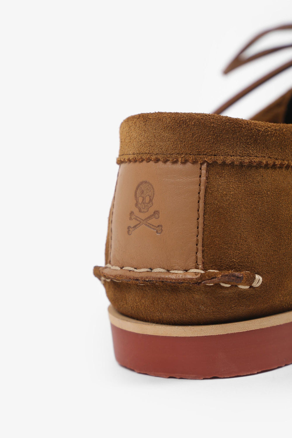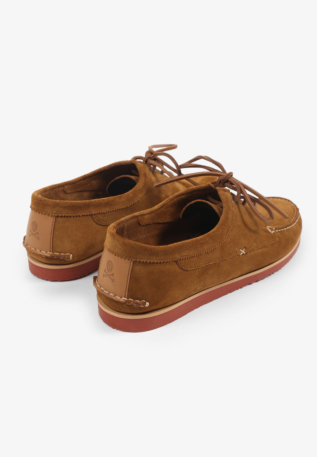 Zapatos confeccionados en piel de cerdo con acabado en ante. Cierre con cordones y suela de goma. Detalle de pespuntes y logo calavera en el talón.