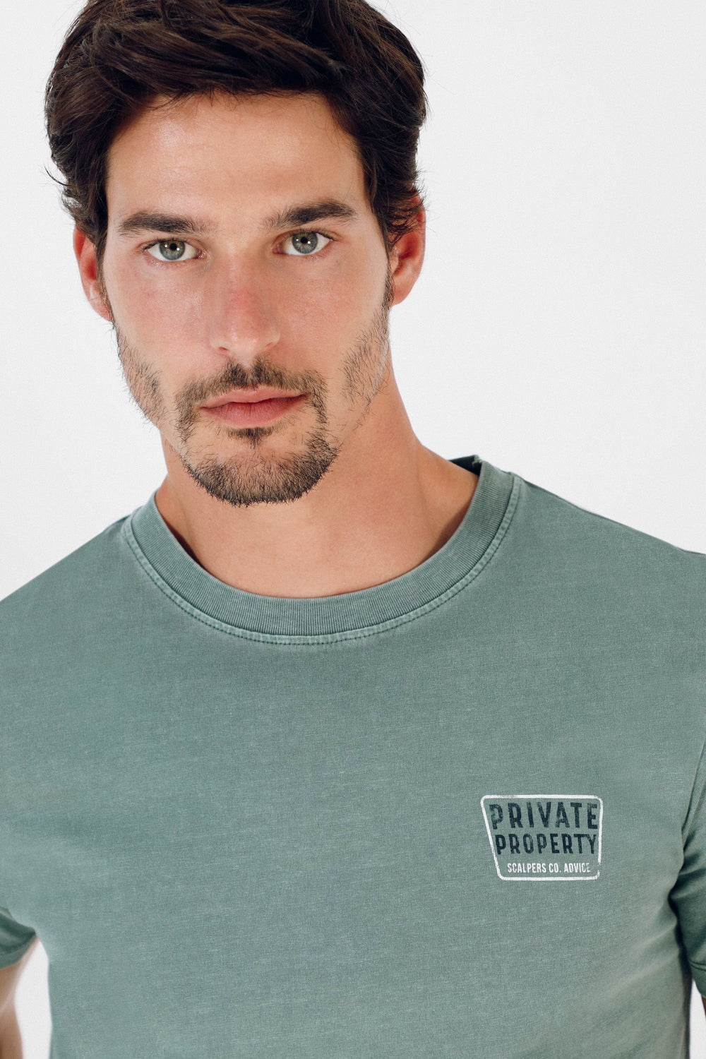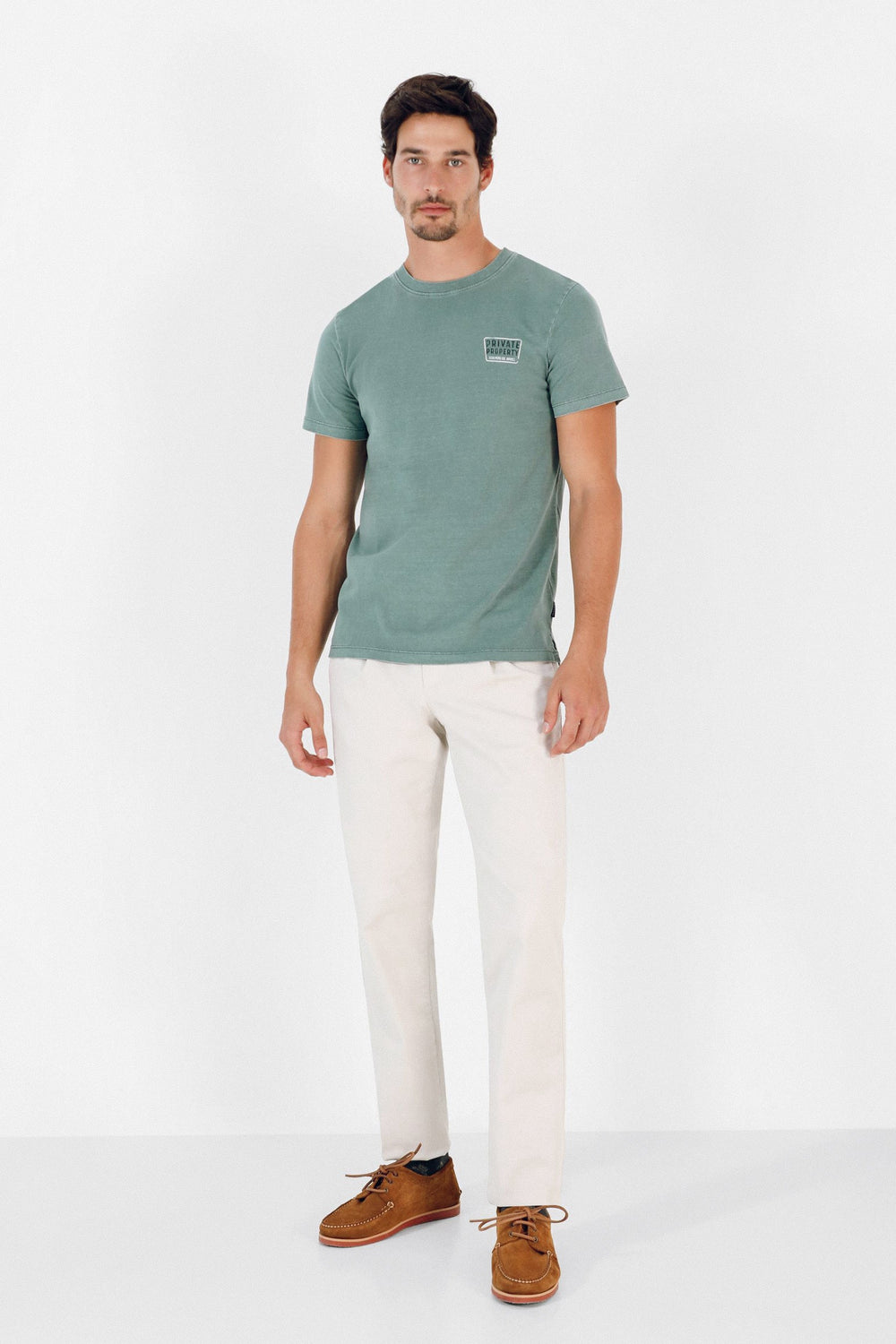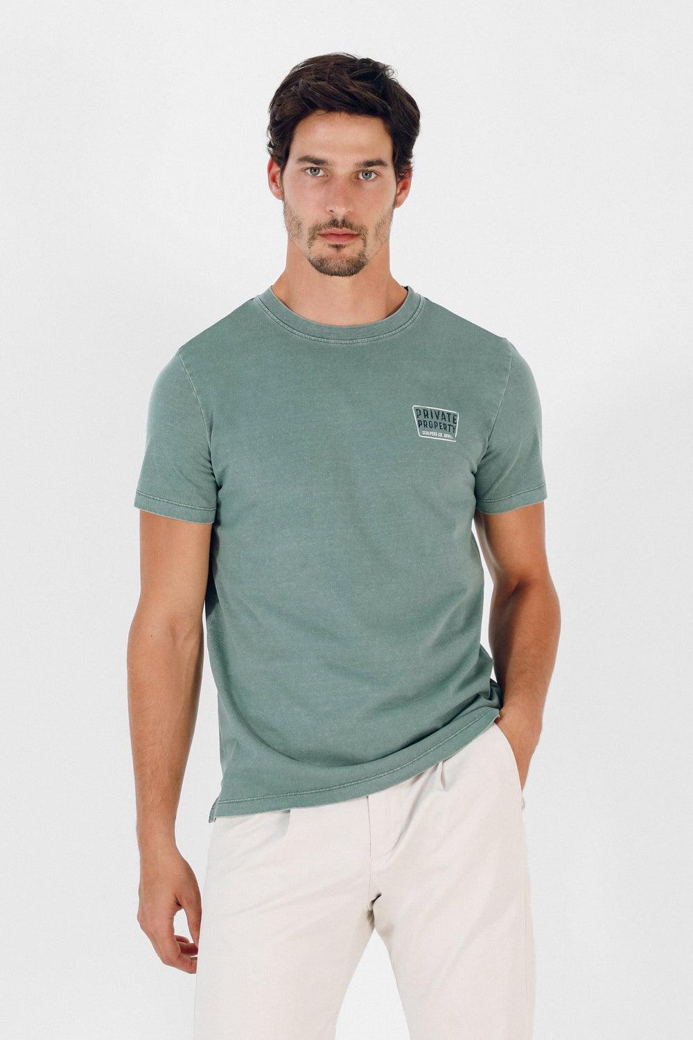 Camiseta confeccionada en tejido garment dyed 100% algodón orgánico. Corte Regular Fit, cuello redondo y manga corta. Detalle de parche en el pecho y print trasero.