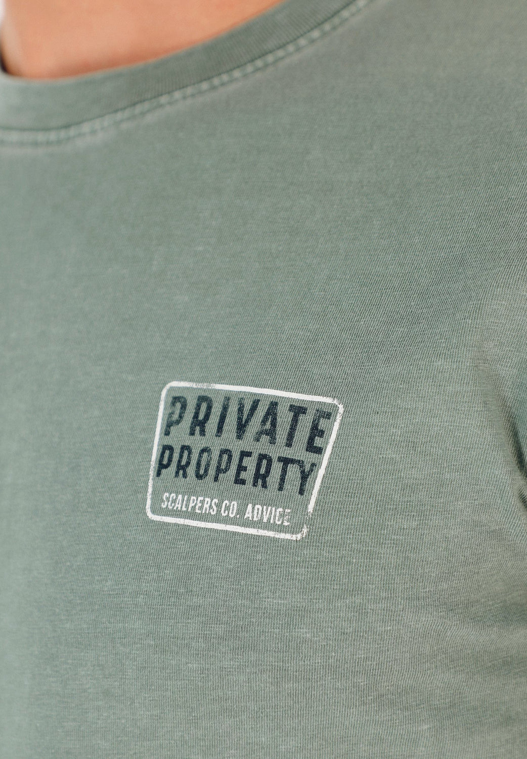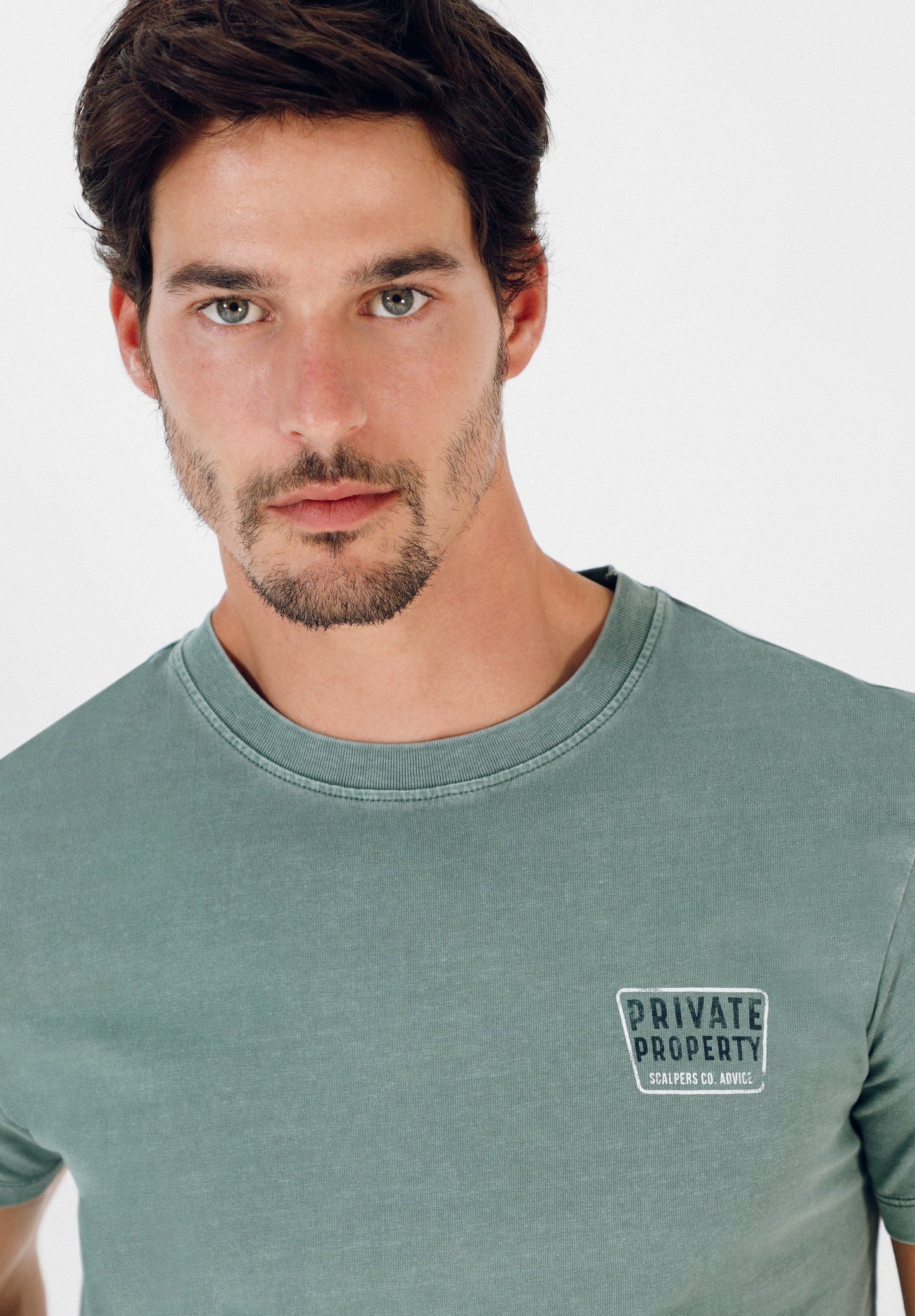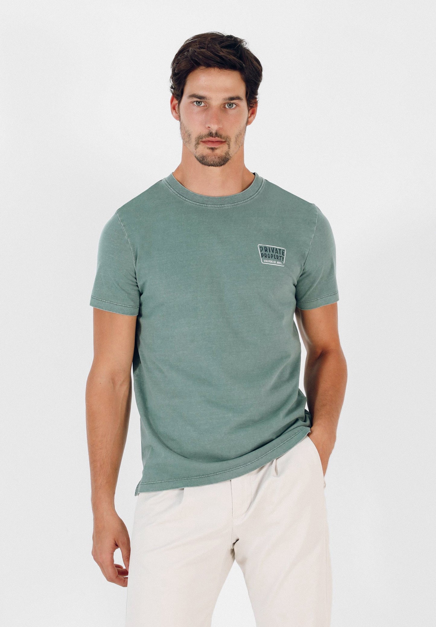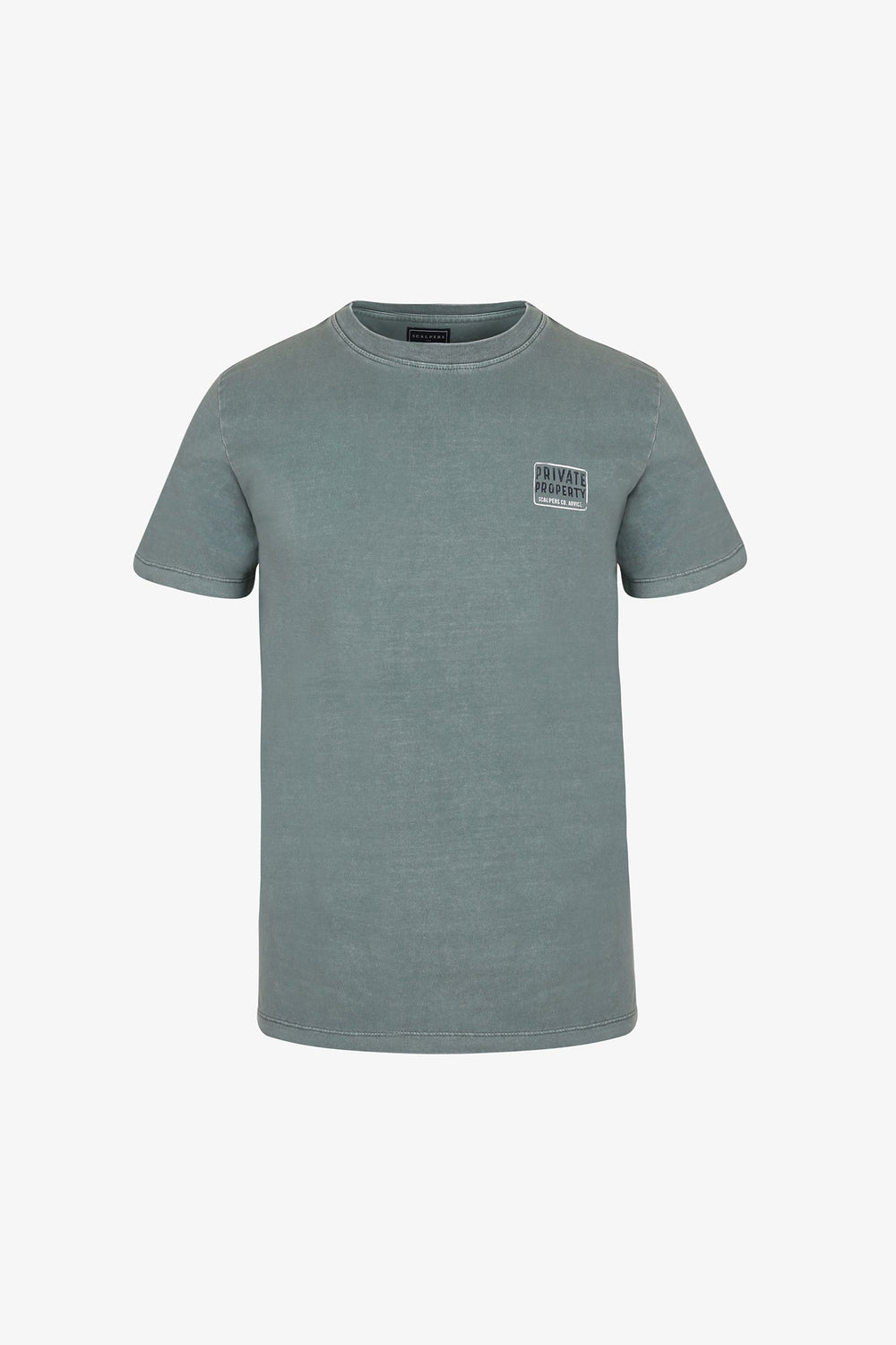 Camiseta confeccionada en tejido garment dyed 100% algodón orgánico. Corte Regular Fit, cuello redondo y manga corta. Detalle de parche en el pecho y print trasero.