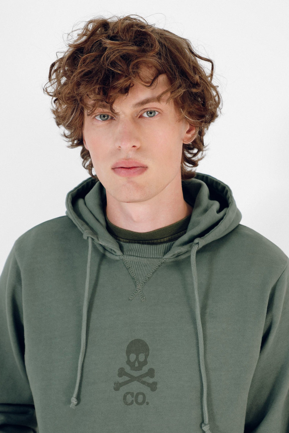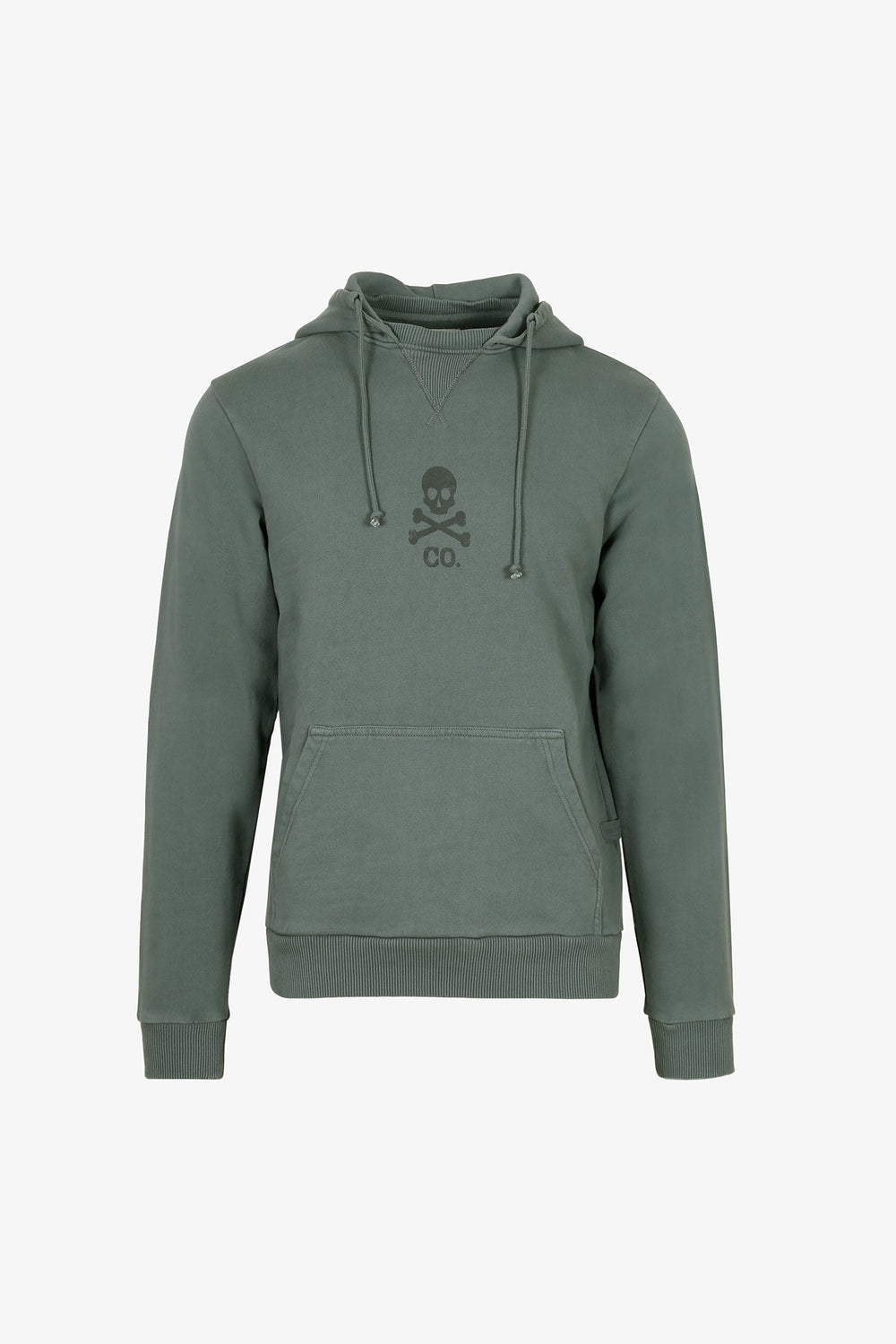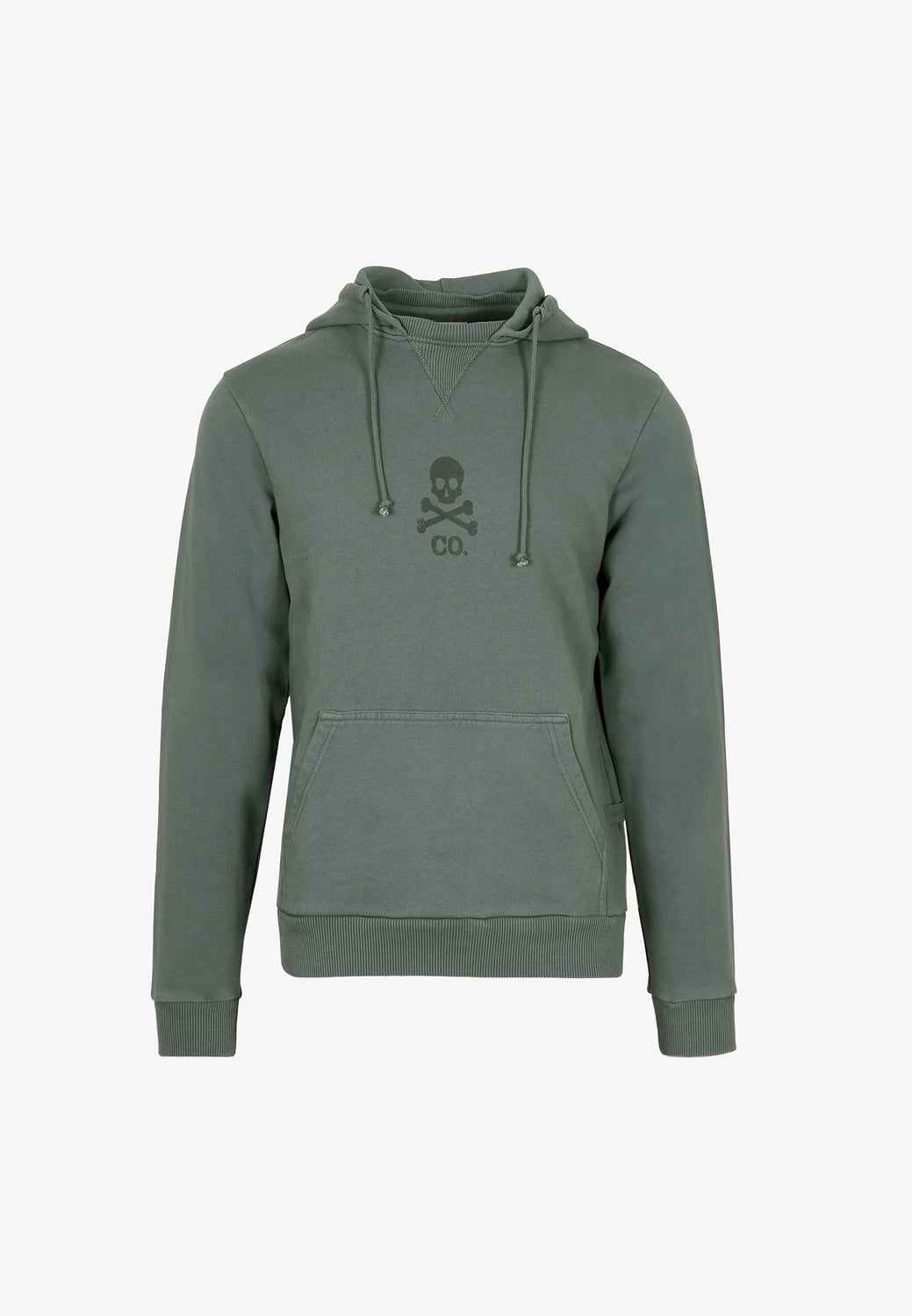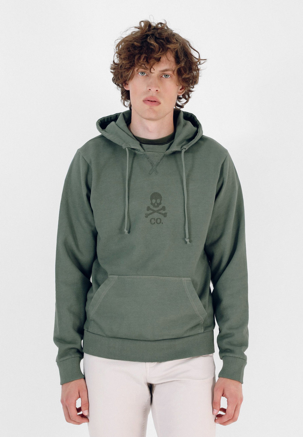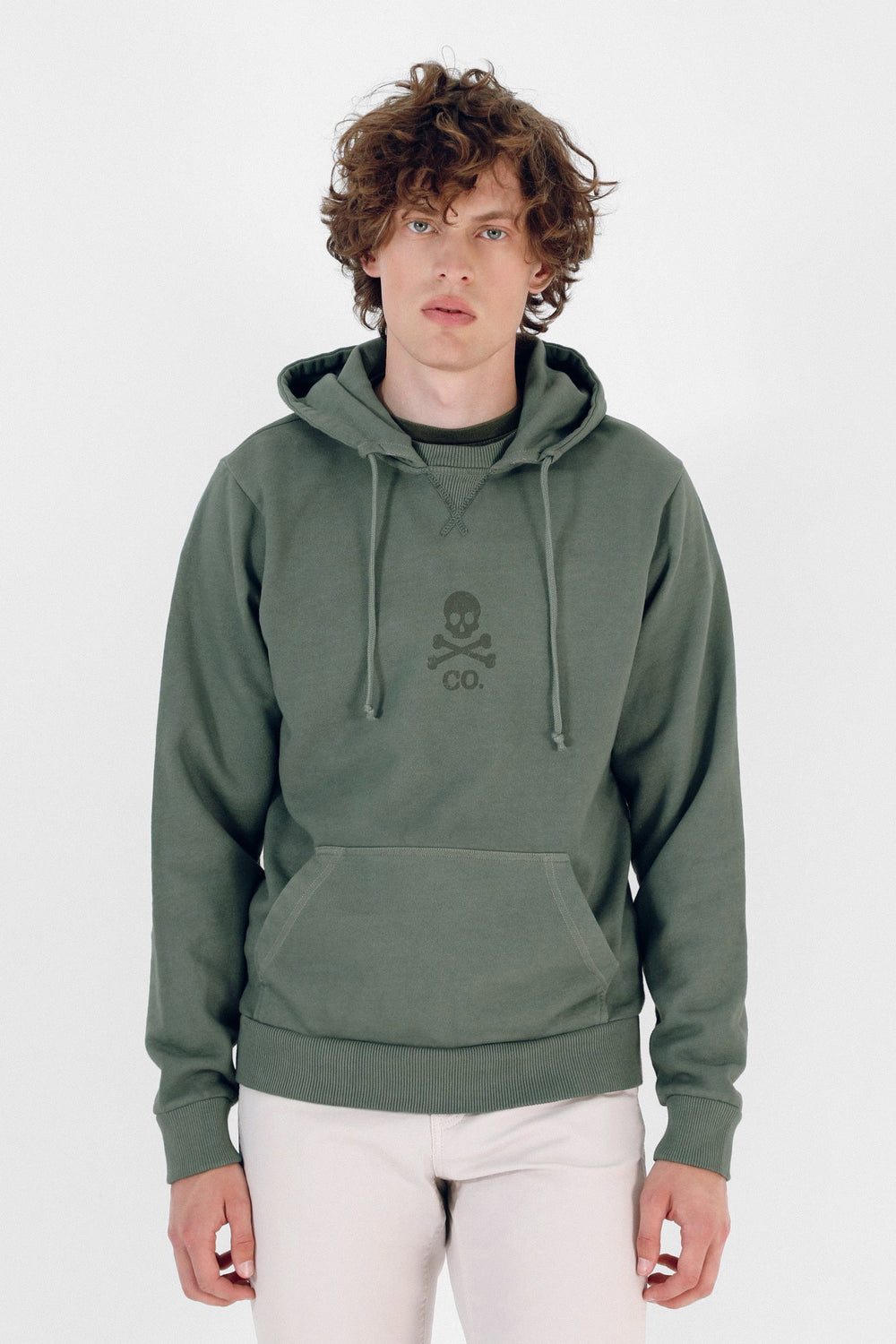 Sudadera confeccionada en tejido 100% algodón orgánico. Corte Regular Fit, cuello con capucha y ajustadores. Manga larga y bolsillo delantero tipo canguro. Detalle de print de calavera delantero.