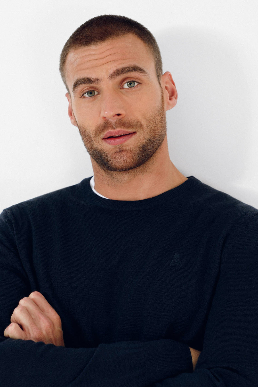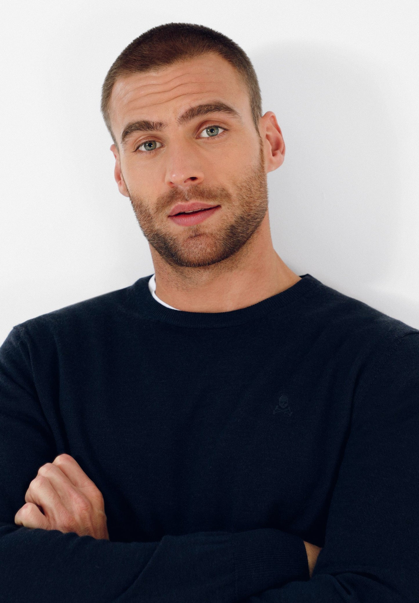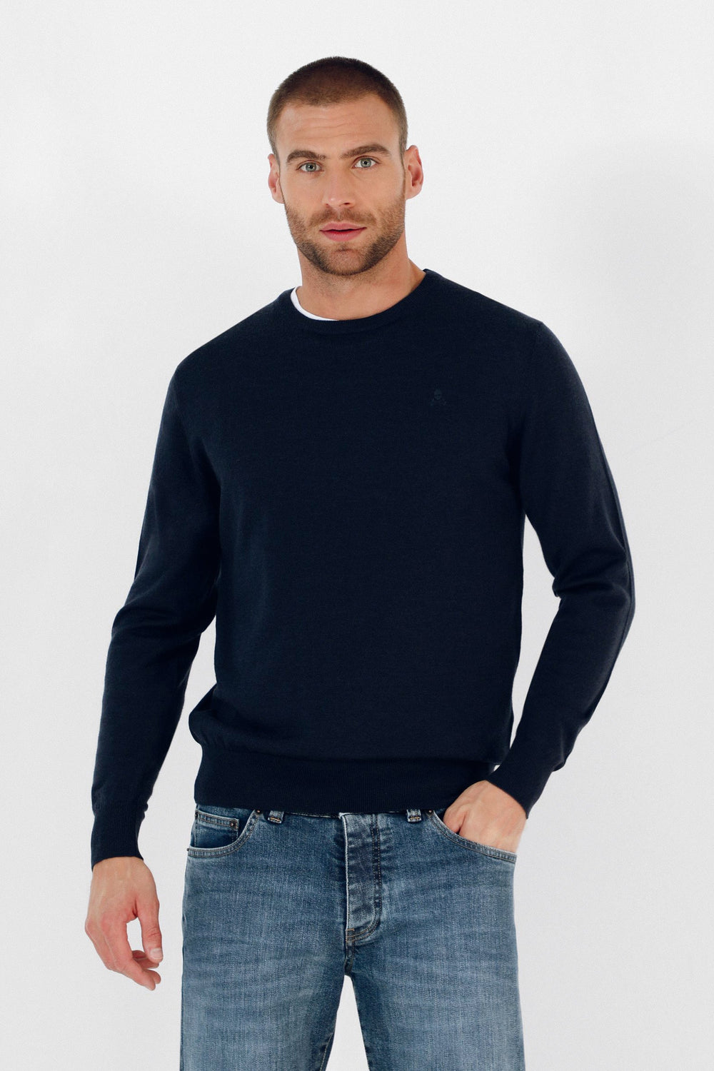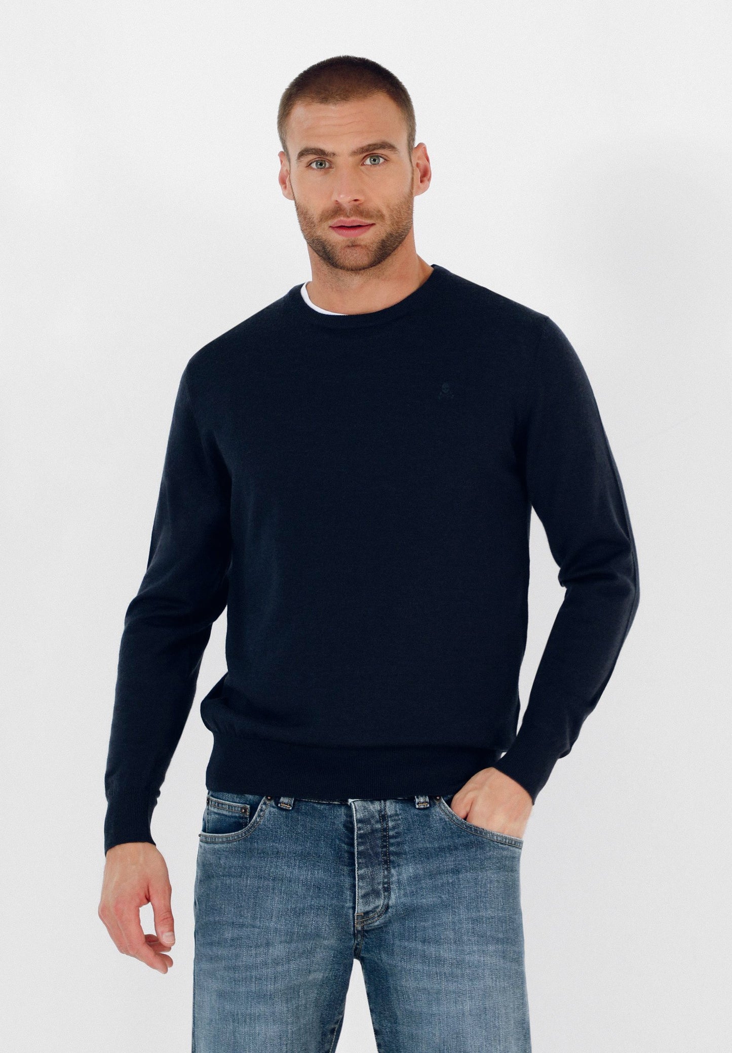 Jersey confeccionado en tejido 100% lana merino. Corte Regular Fit, cuello redondo y manga larga. Detalle de calavera a tono en el pecho.