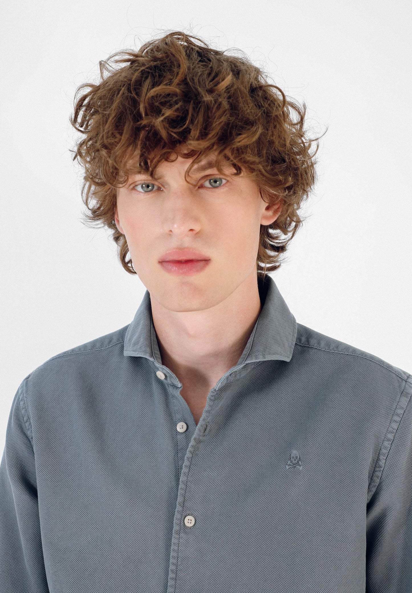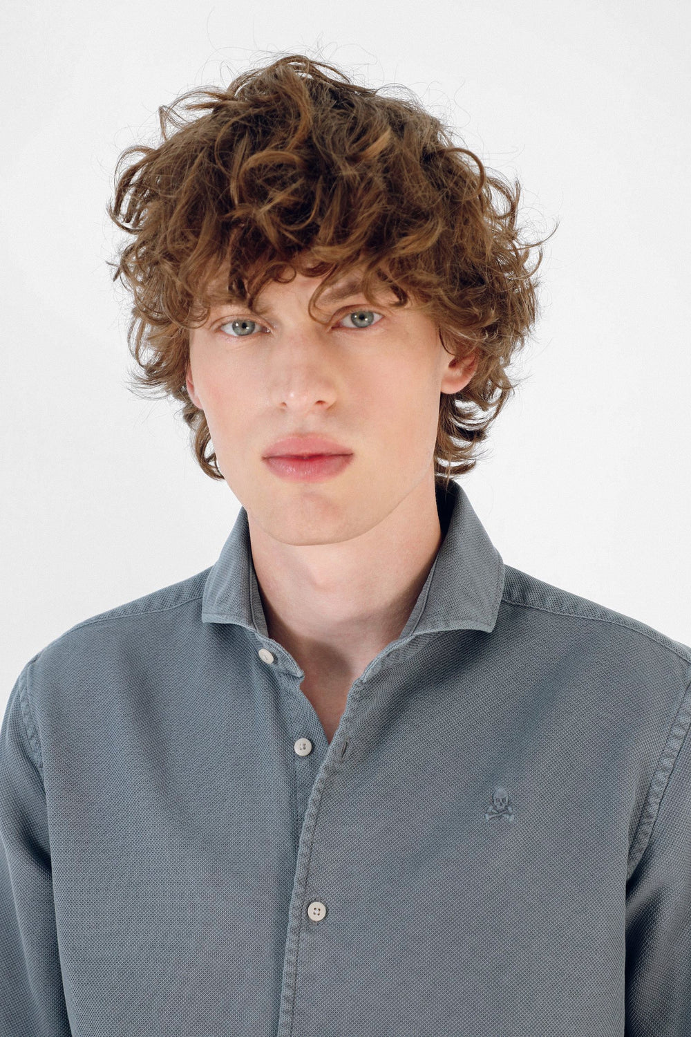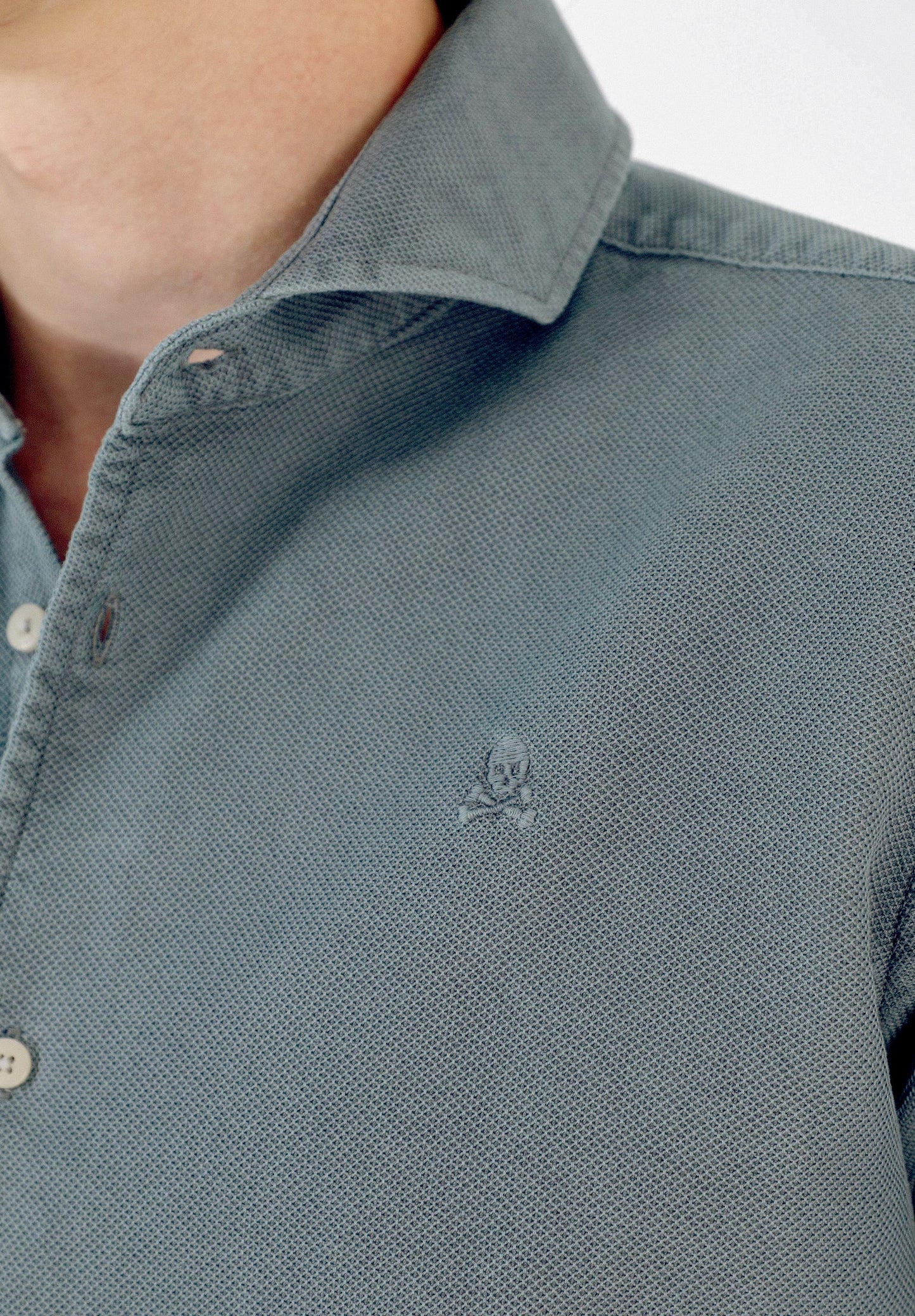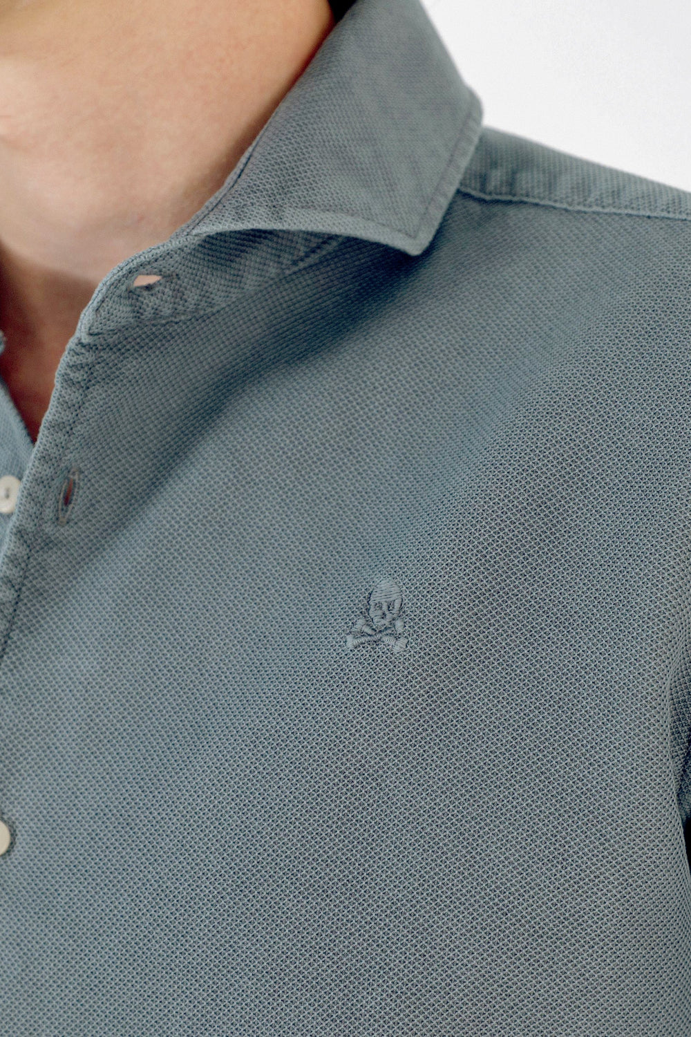 Camisa confeccionada en tejido 100% algodón orgánico tipo polo. Corte Regular Fit, cuello cutaway y cierre con botones. Detalle de calavera a tono.