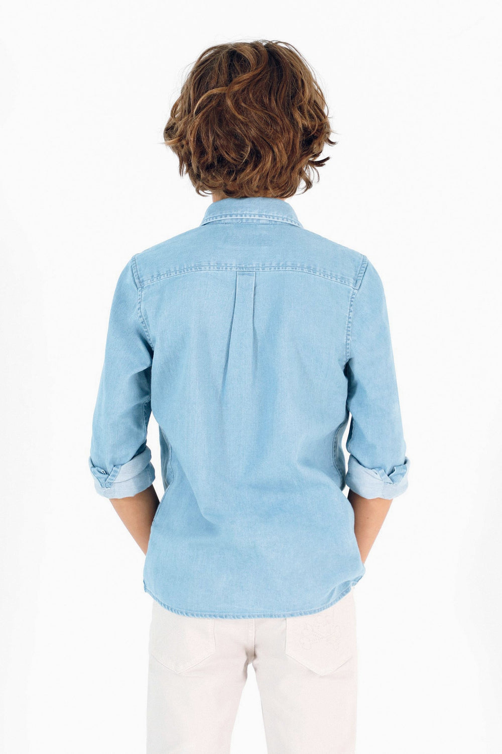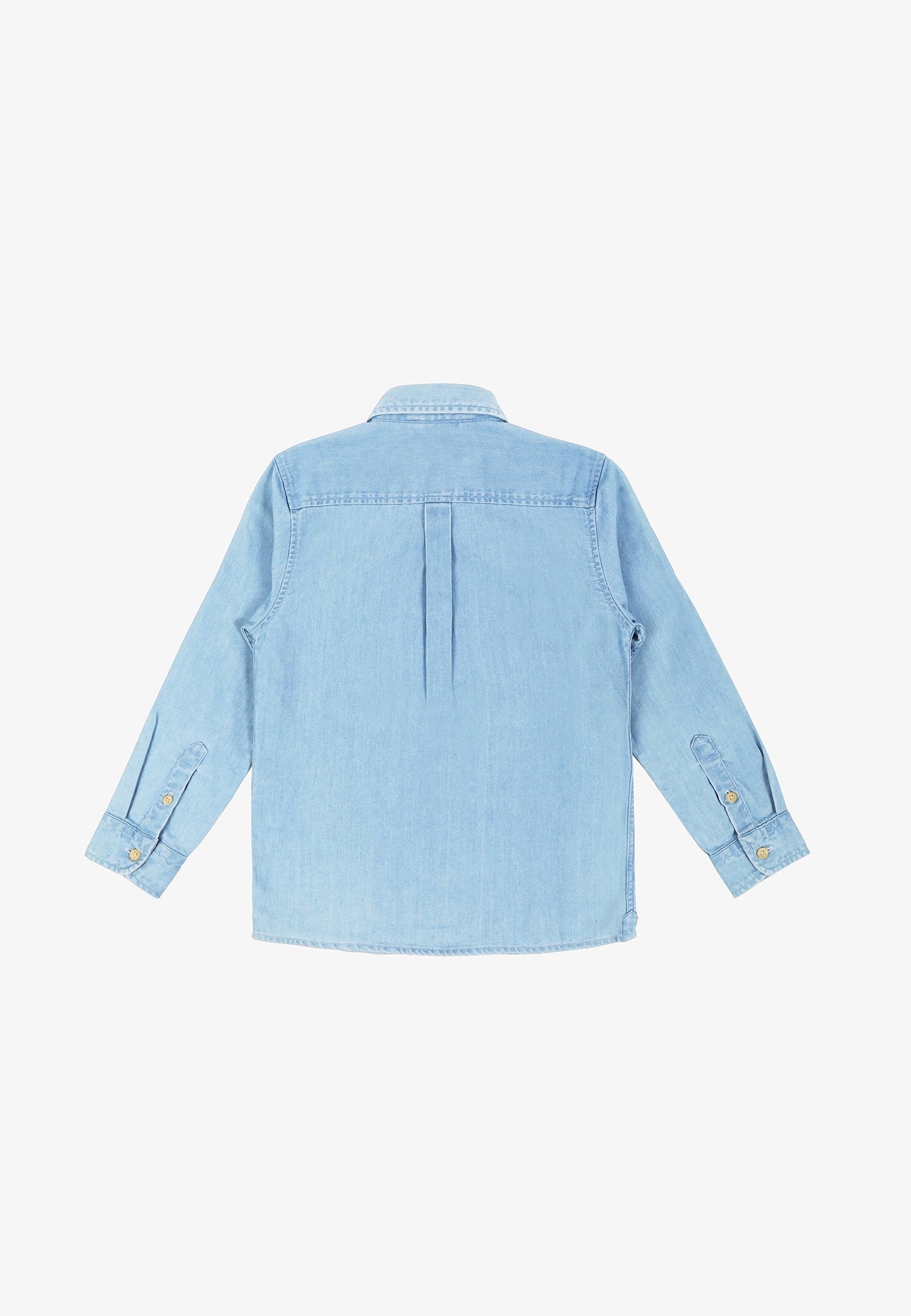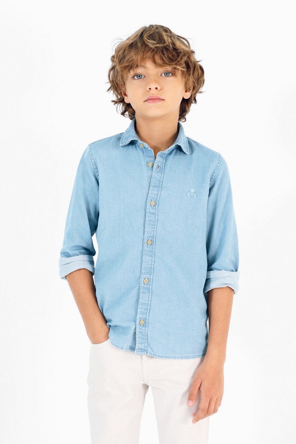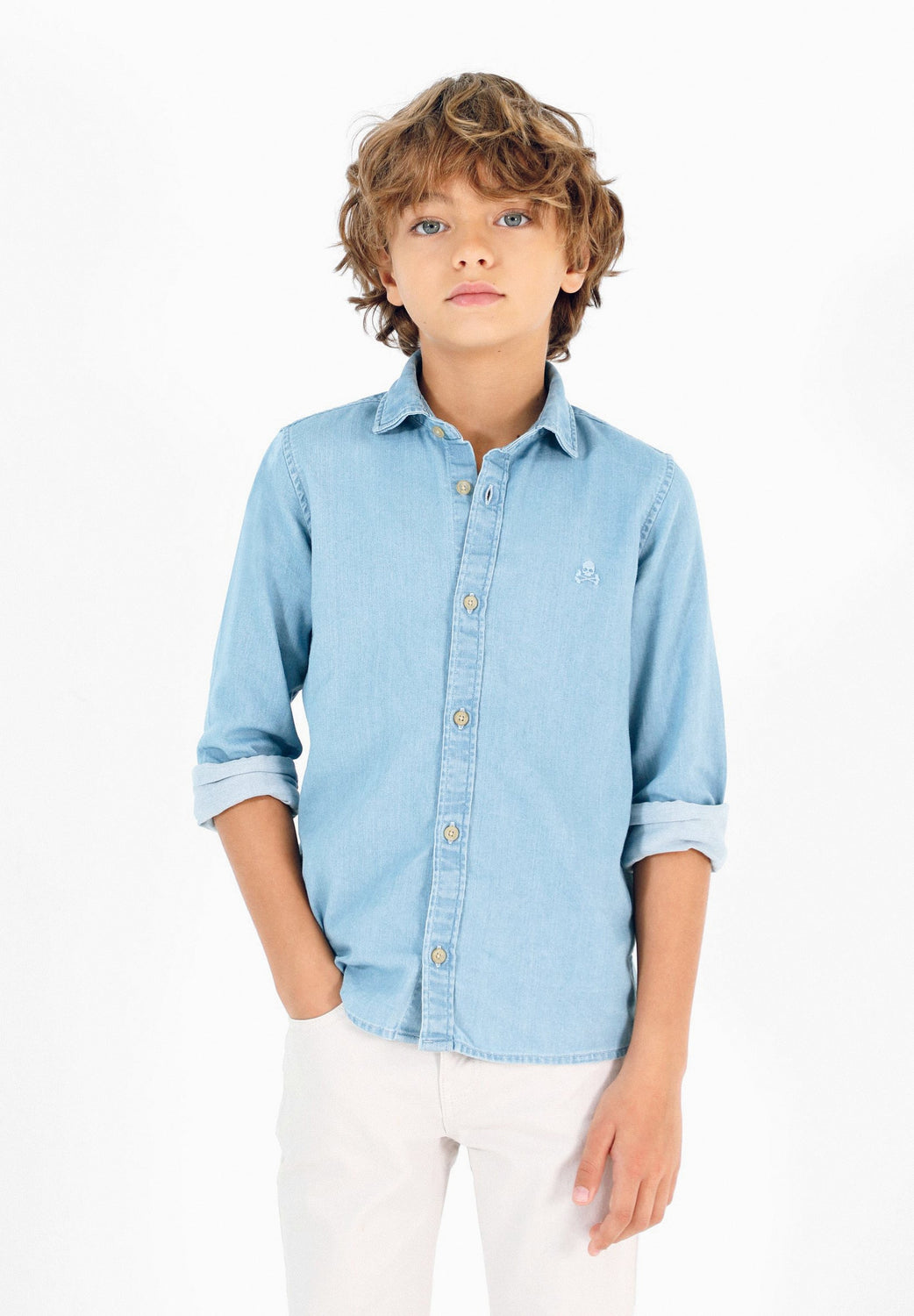 Camisa denim confeccionada en tejido 100% algodón BCI. Corte Regular Fit, cuello italiano y cierre con botones. Manga larga terminada en puño con dos botones y detalle de calavera bordada.