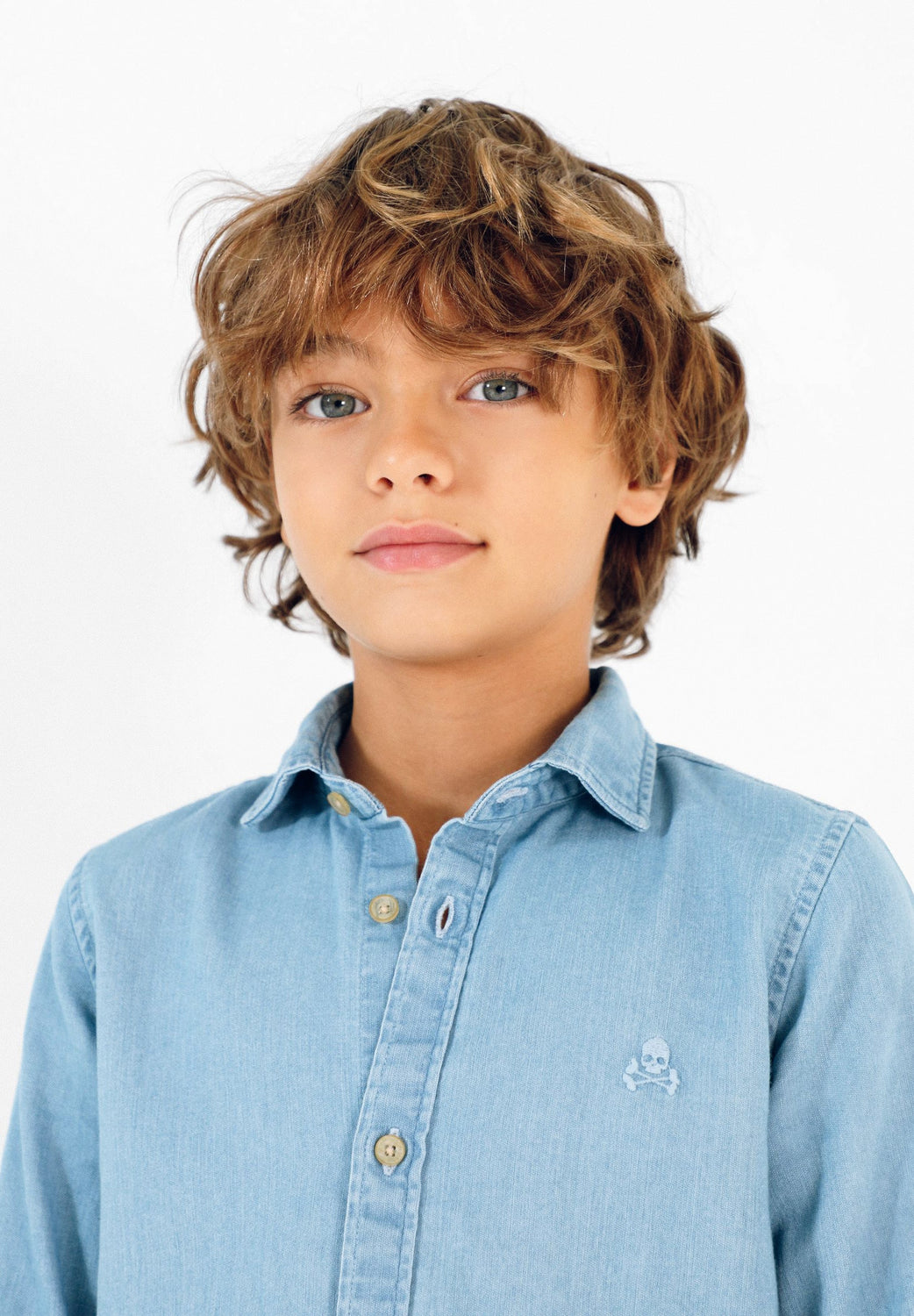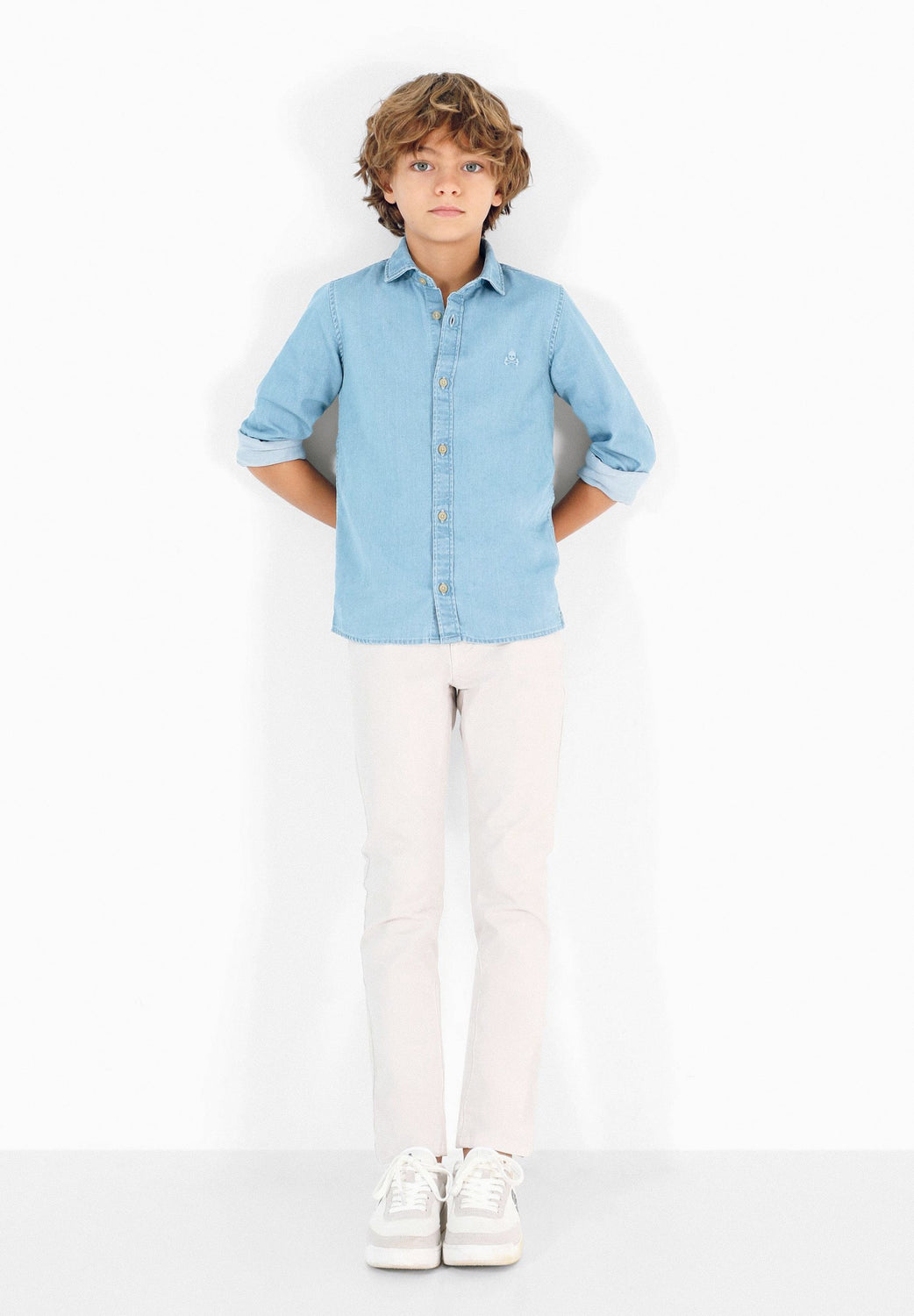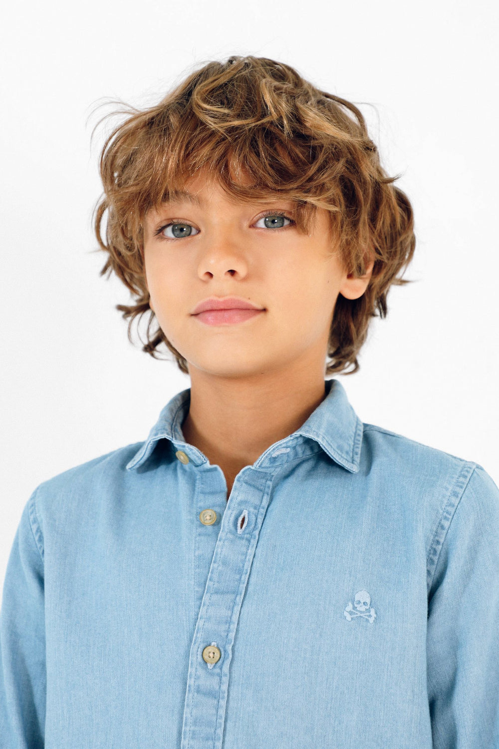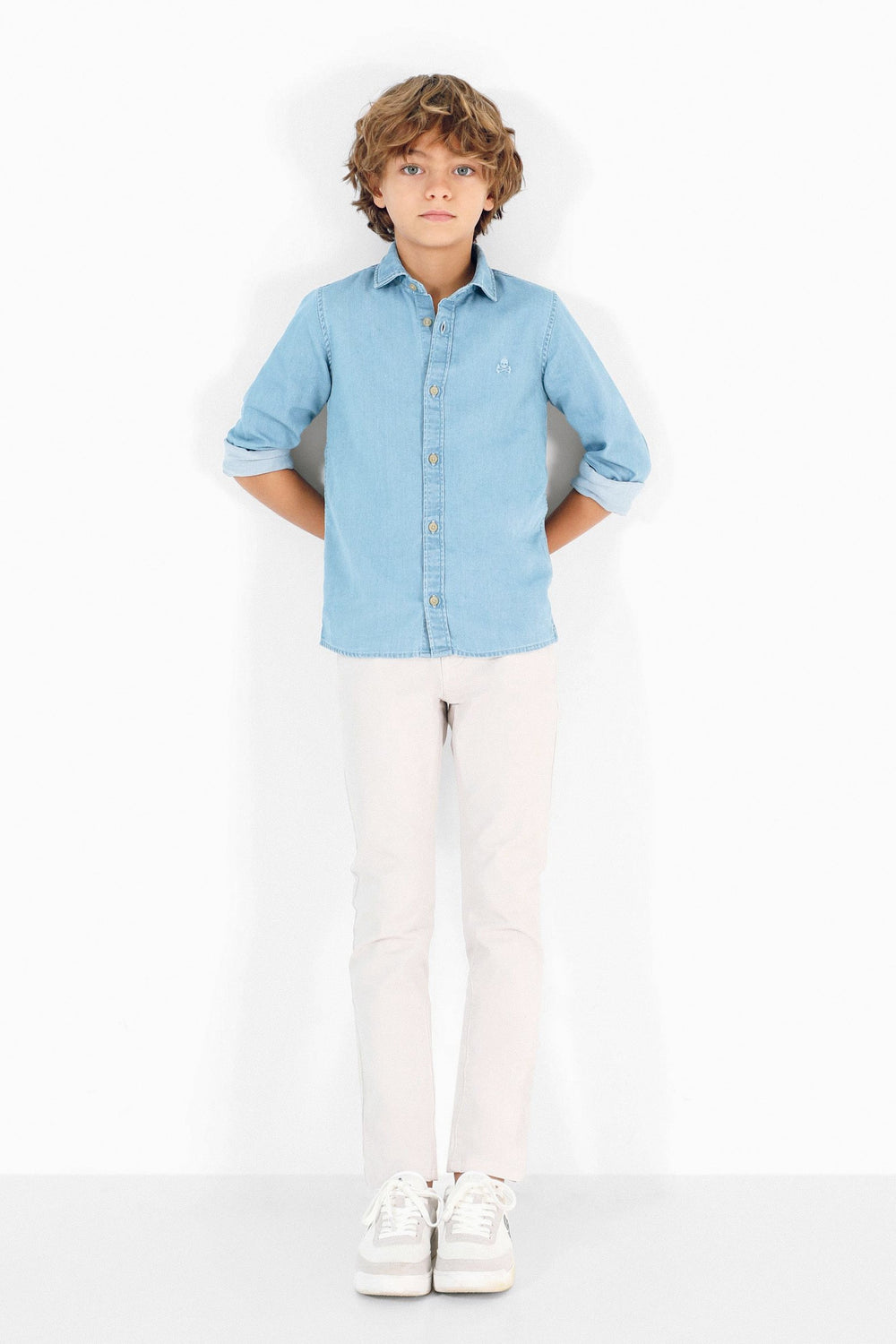 Camisa denim confeccionada en tejido 100% algodón BCI. Corte Regular Fit, cuello italiano y cierre con botones. Manga larga terminada en puño con dos botones y detalle de calavera bordada.