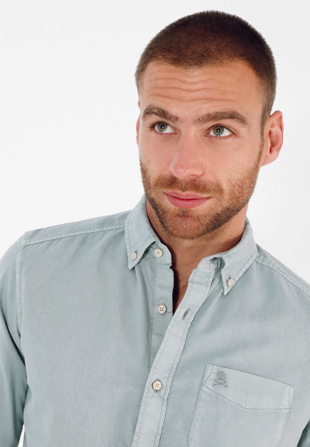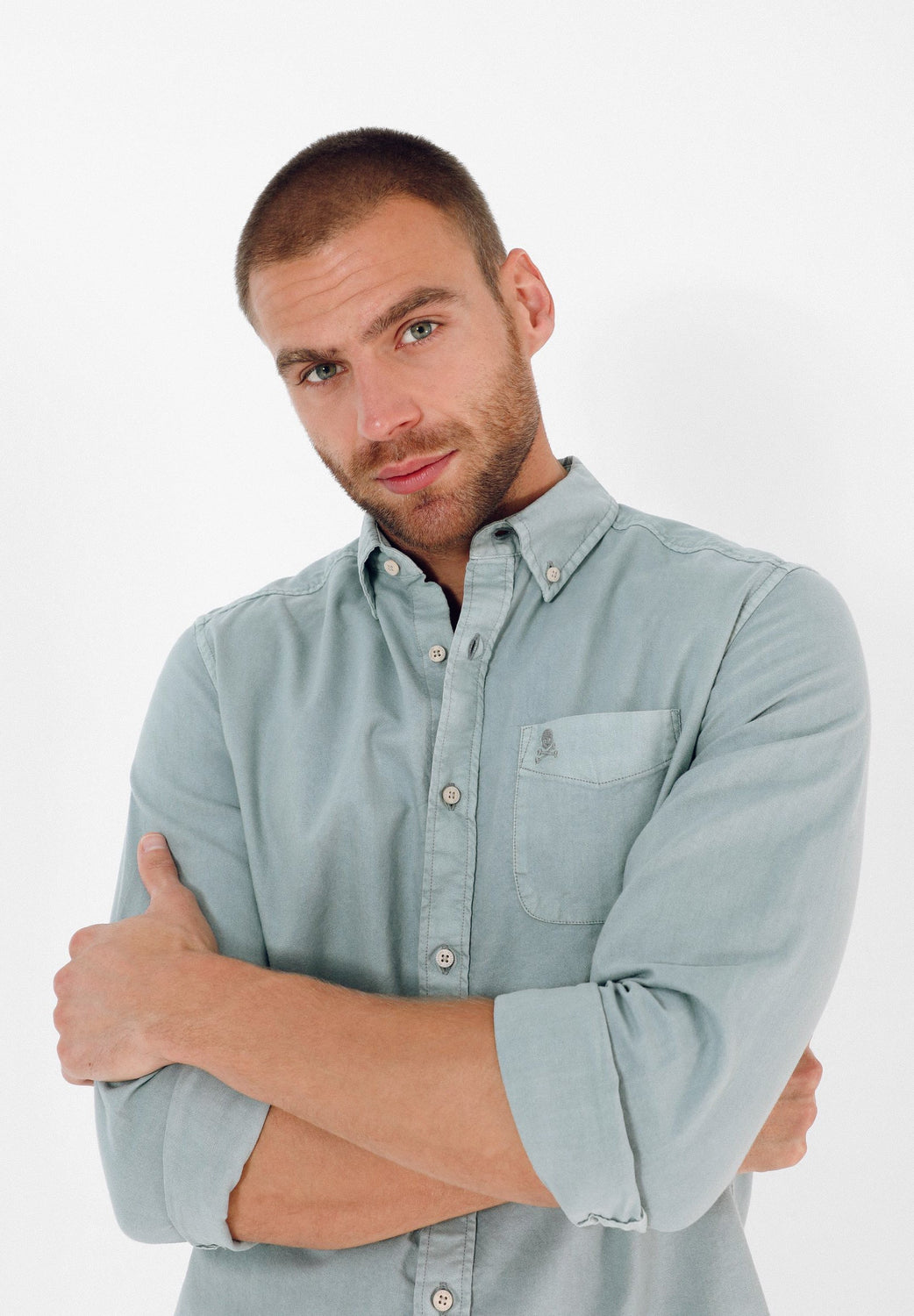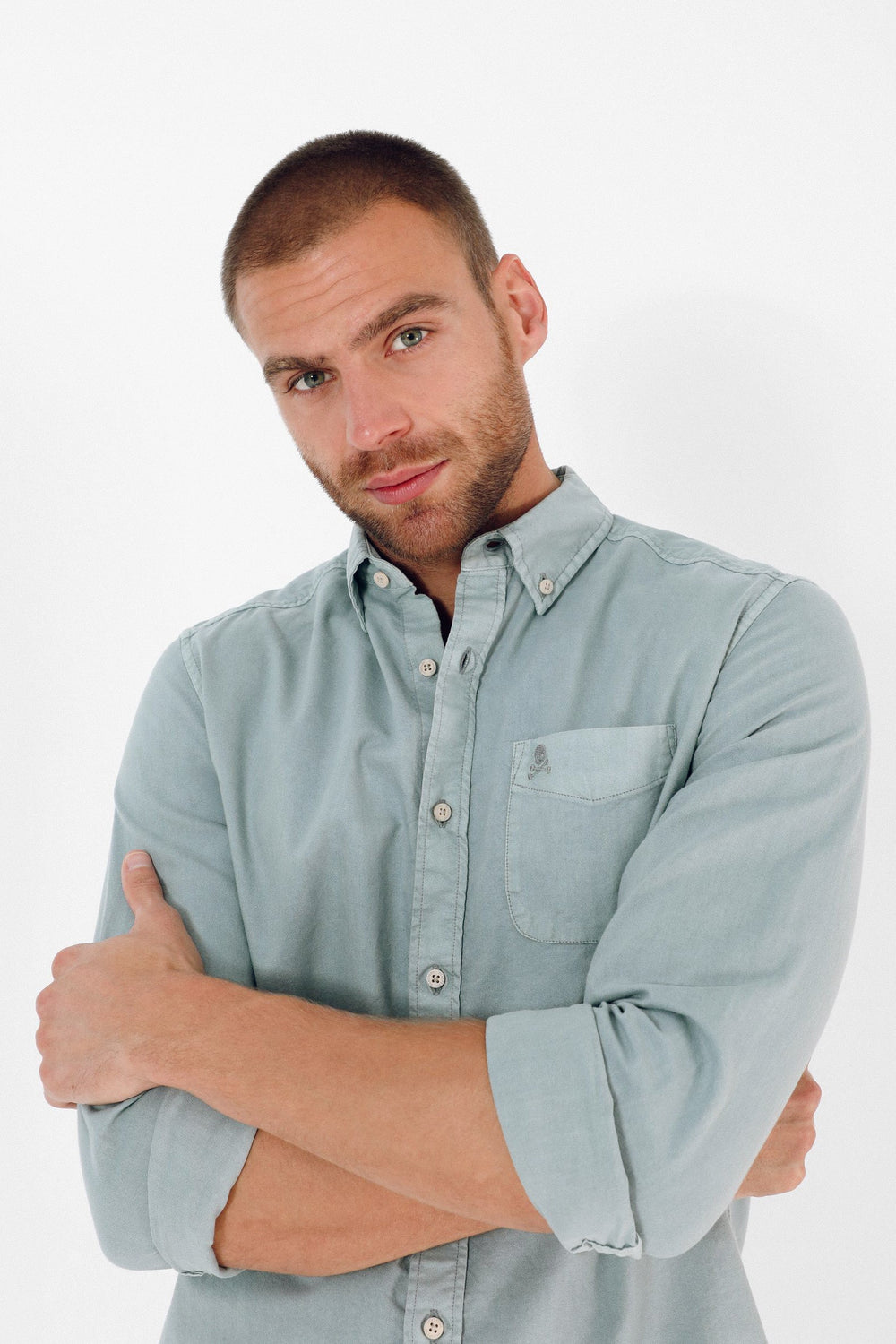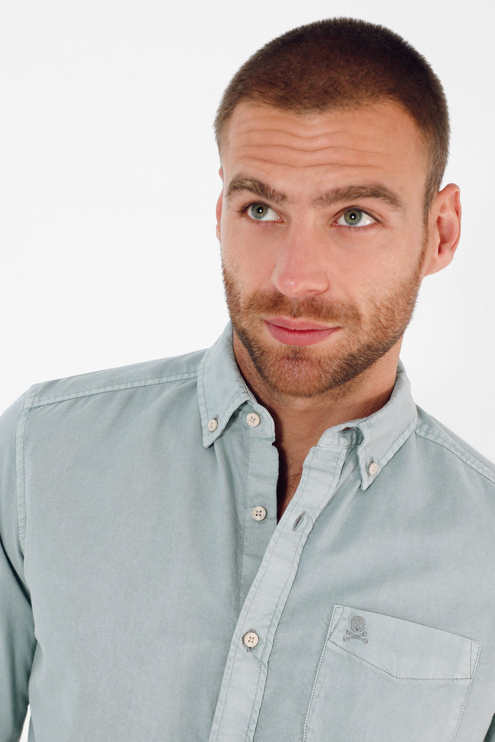 Camisa confeccionada en tejido 100% algodón orgánico. Corte Regular Fit, cuello con botones y cierre con botones. Manga larga terminada en puño con botones y bolsillo en el pecho con detalle de calavera.