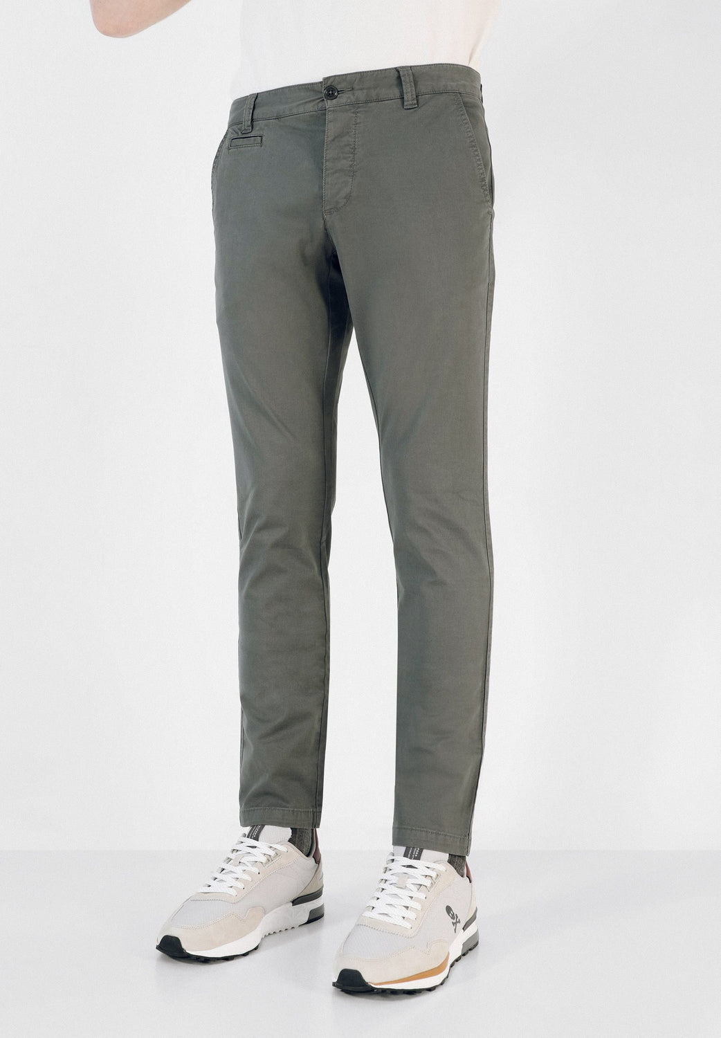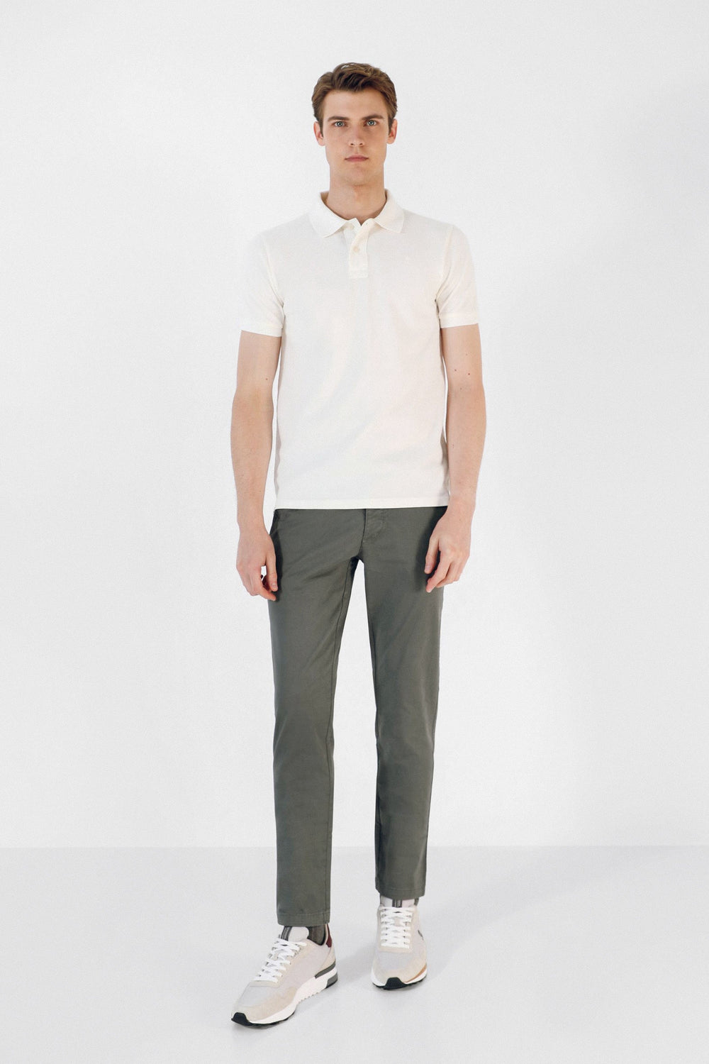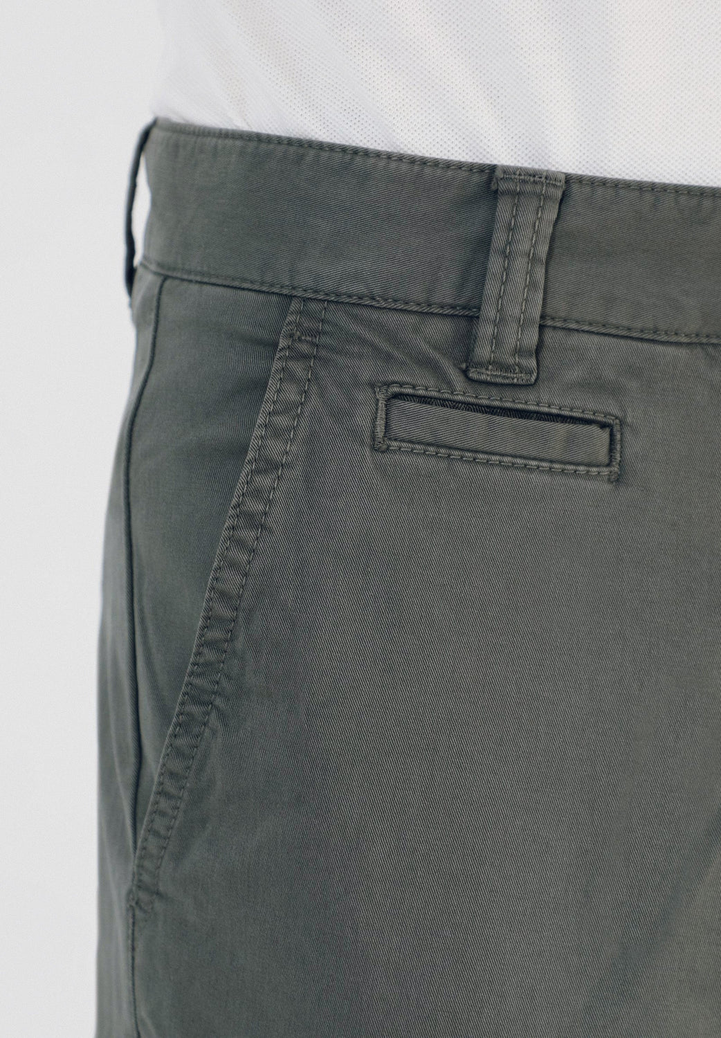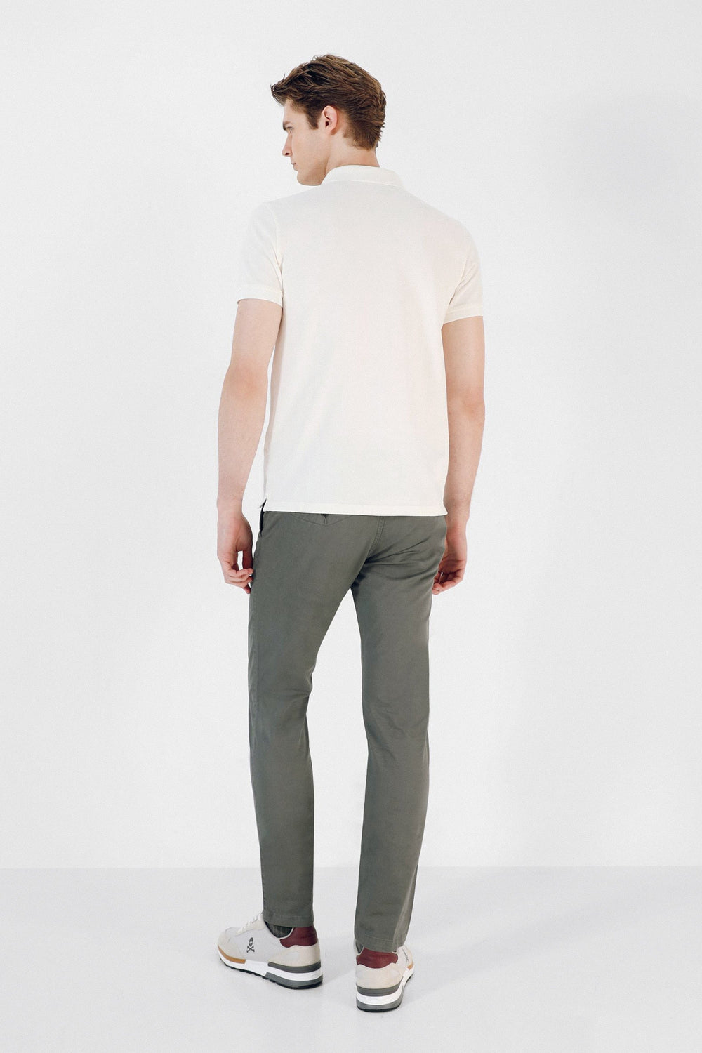 Pantalón chino confeccionado en tejido de algodón garment dyed. Corte Regular Fit, cierre mediante botones ocultos por tapeta y botón. Bolsillos delanteros y traseros con botón y trabillas para el cinturón.