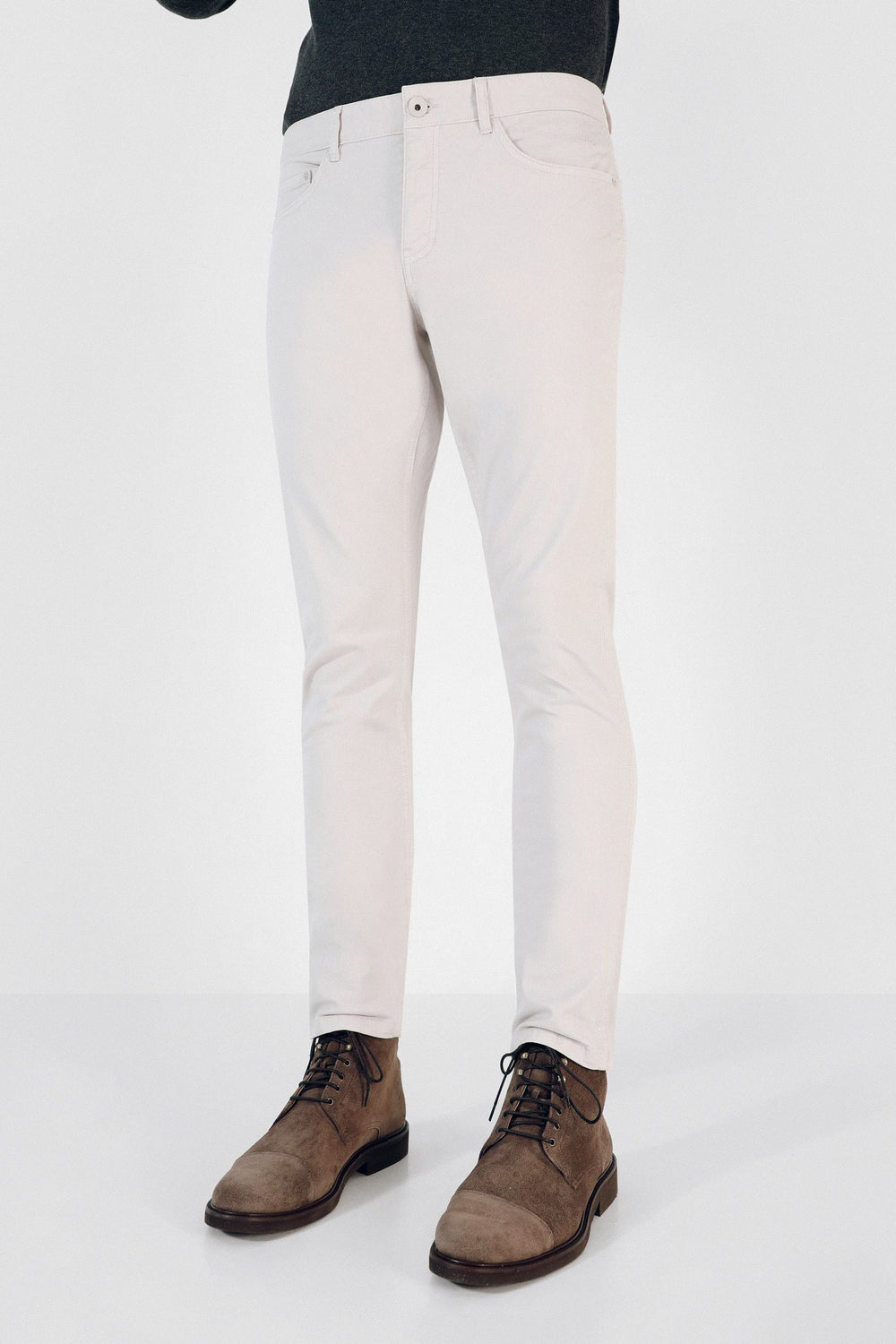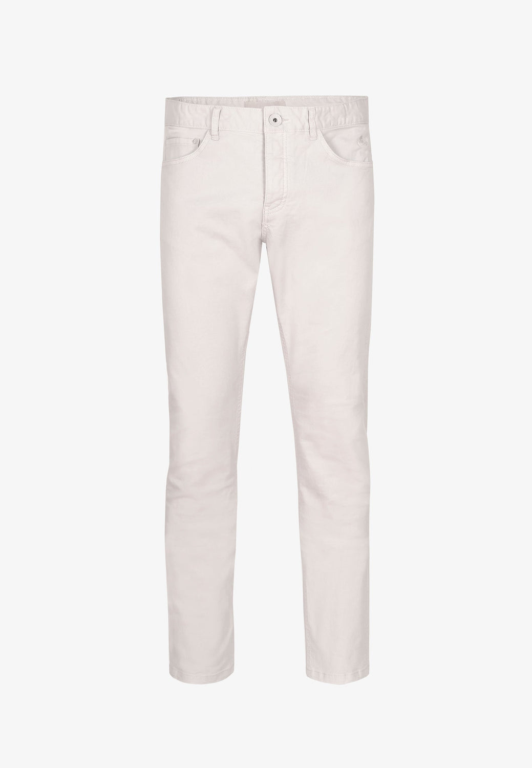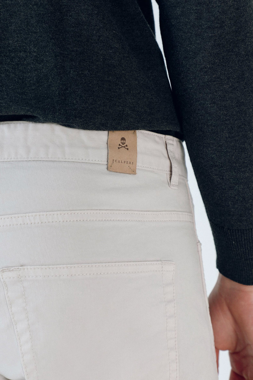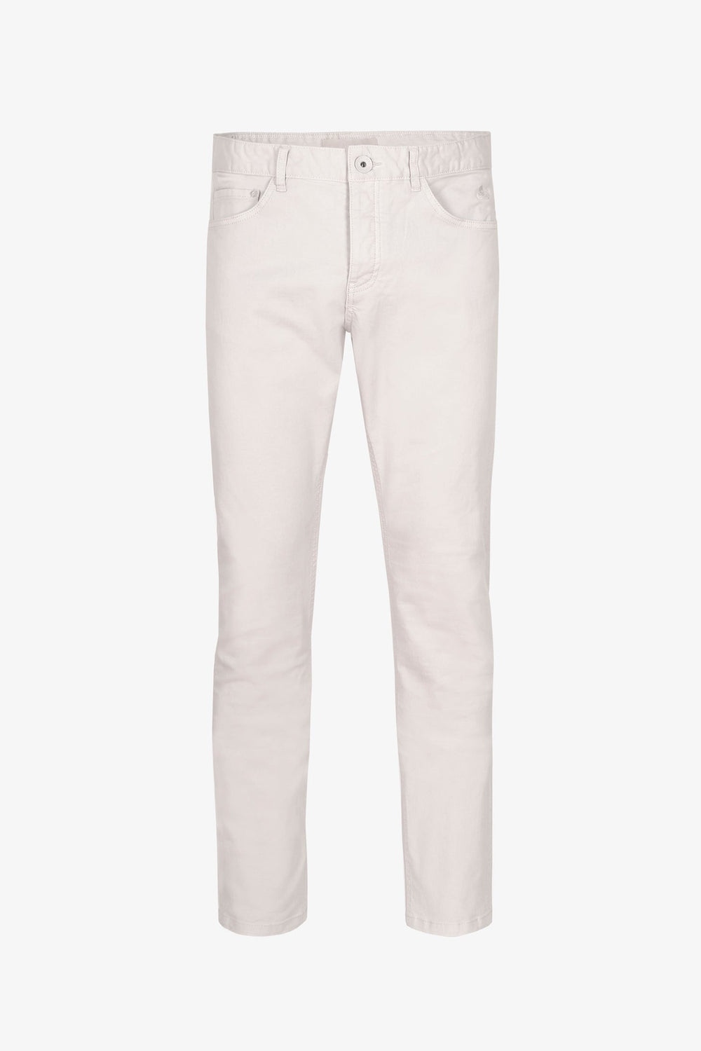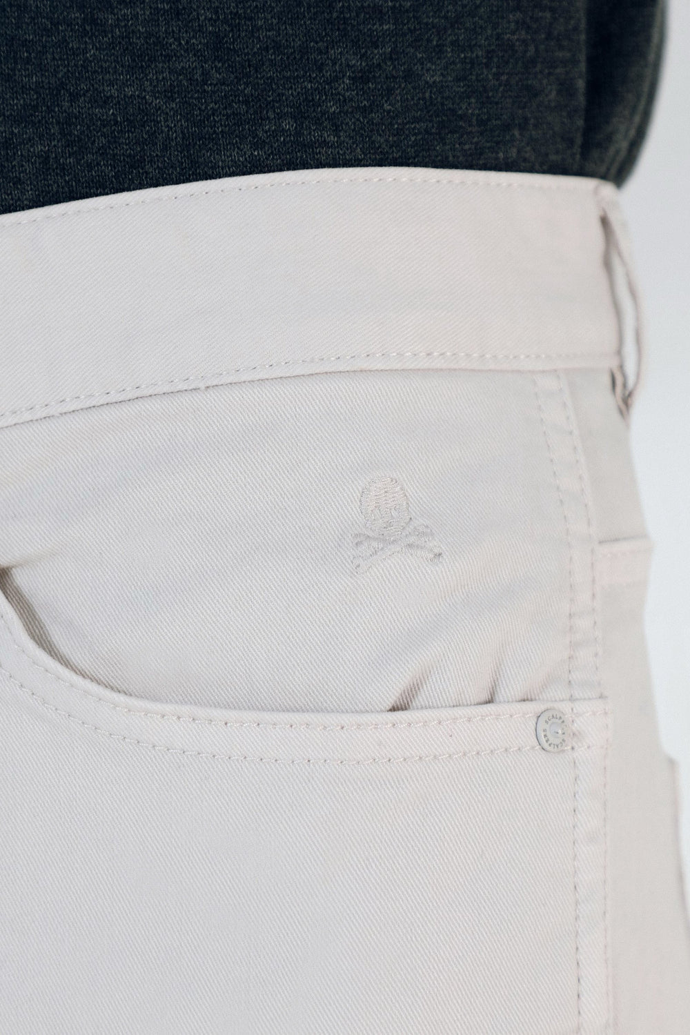 Pantalón confeccionado en tejido de algodón garment dyed. Corte Slim Fit, cierre con botón y cremallera. Cinco bolsillos y trabillas Logo bordado en el bolsillo.