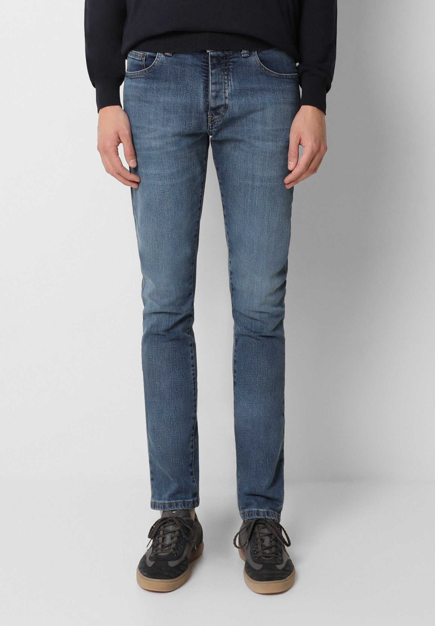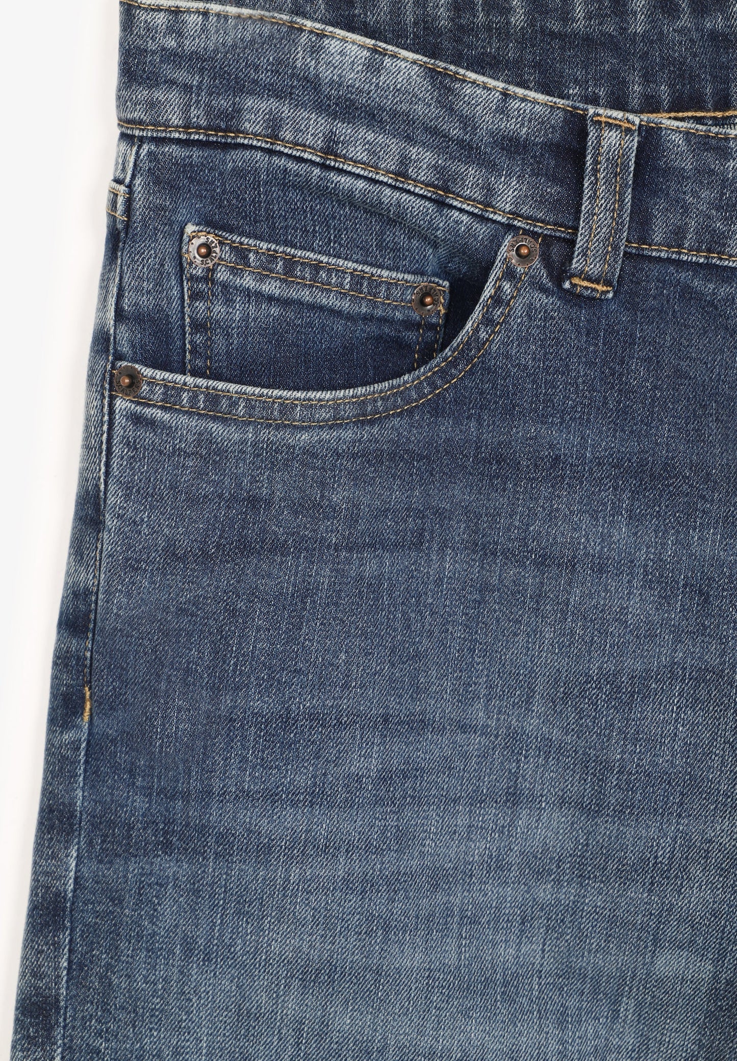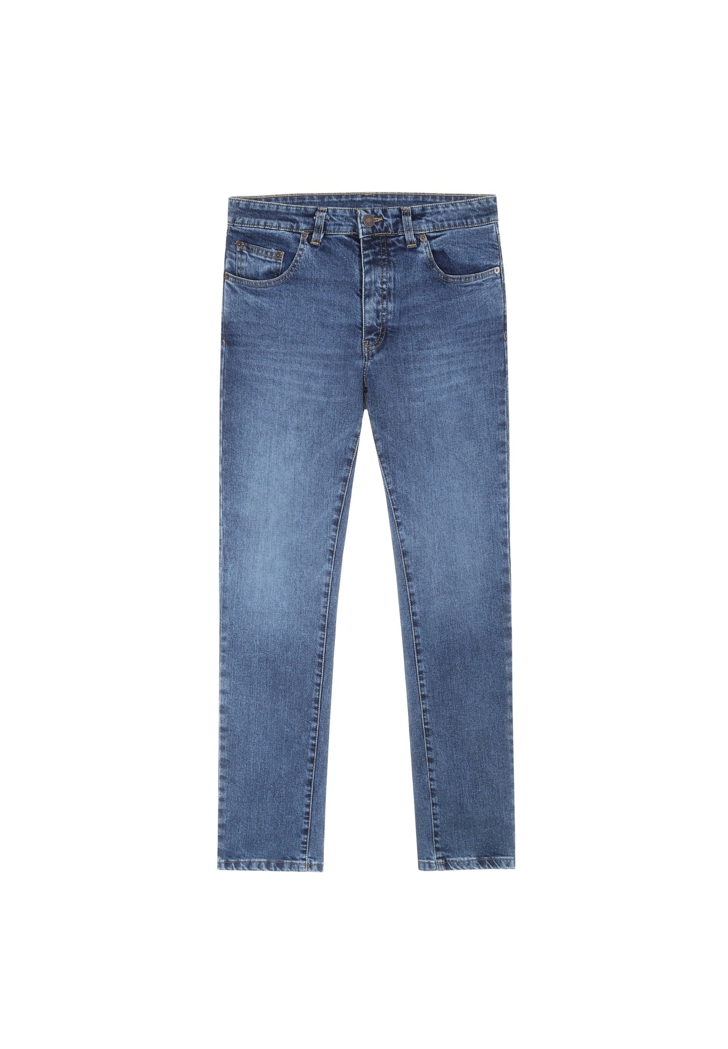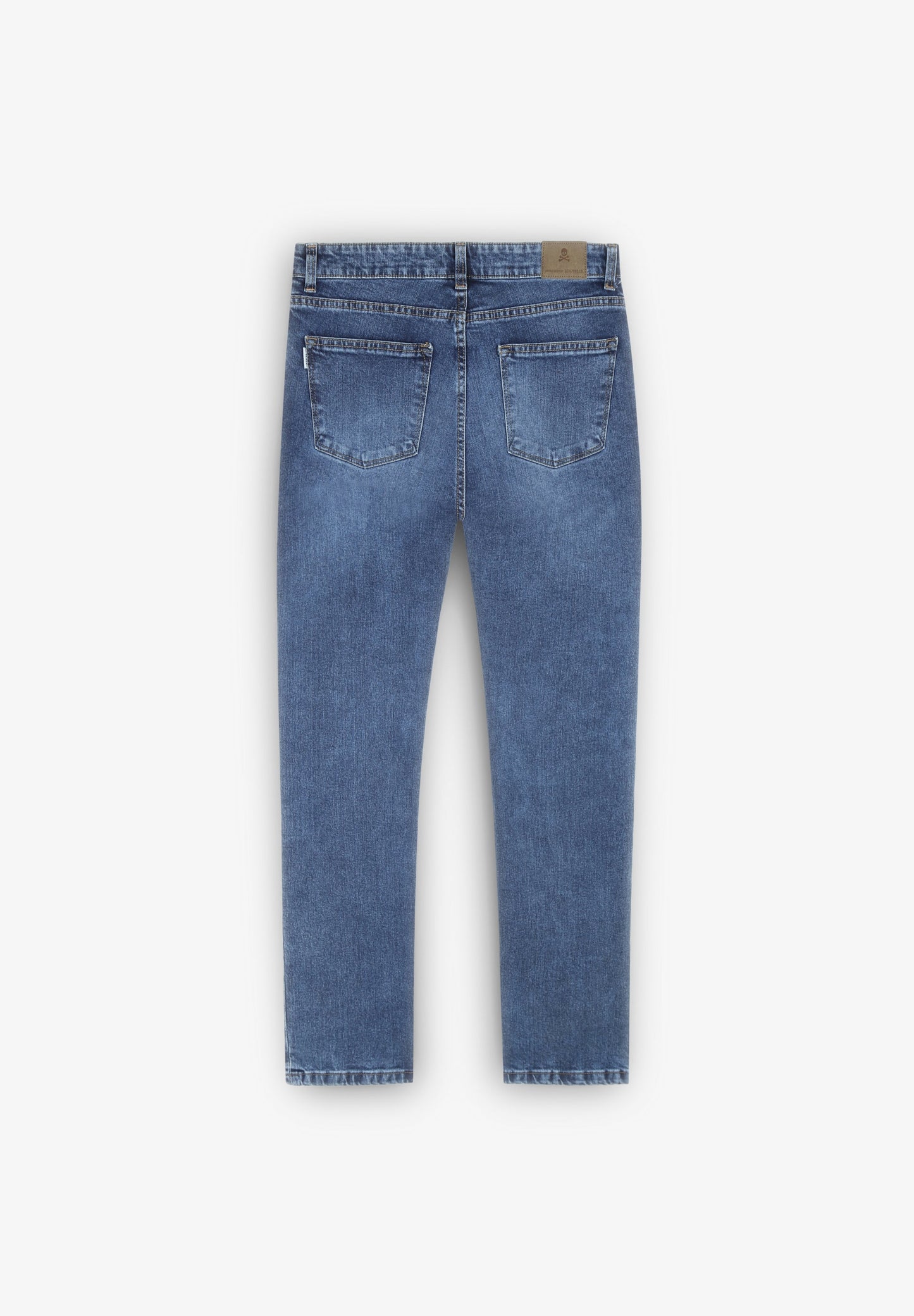 Pantalón vaquero efecto lavado. Corte Slim Fit, cierre con botones ocultos por tapeta y cinco bolsillos. Tiene trabillas. Detalle de bordado en el bolsillo trasero.