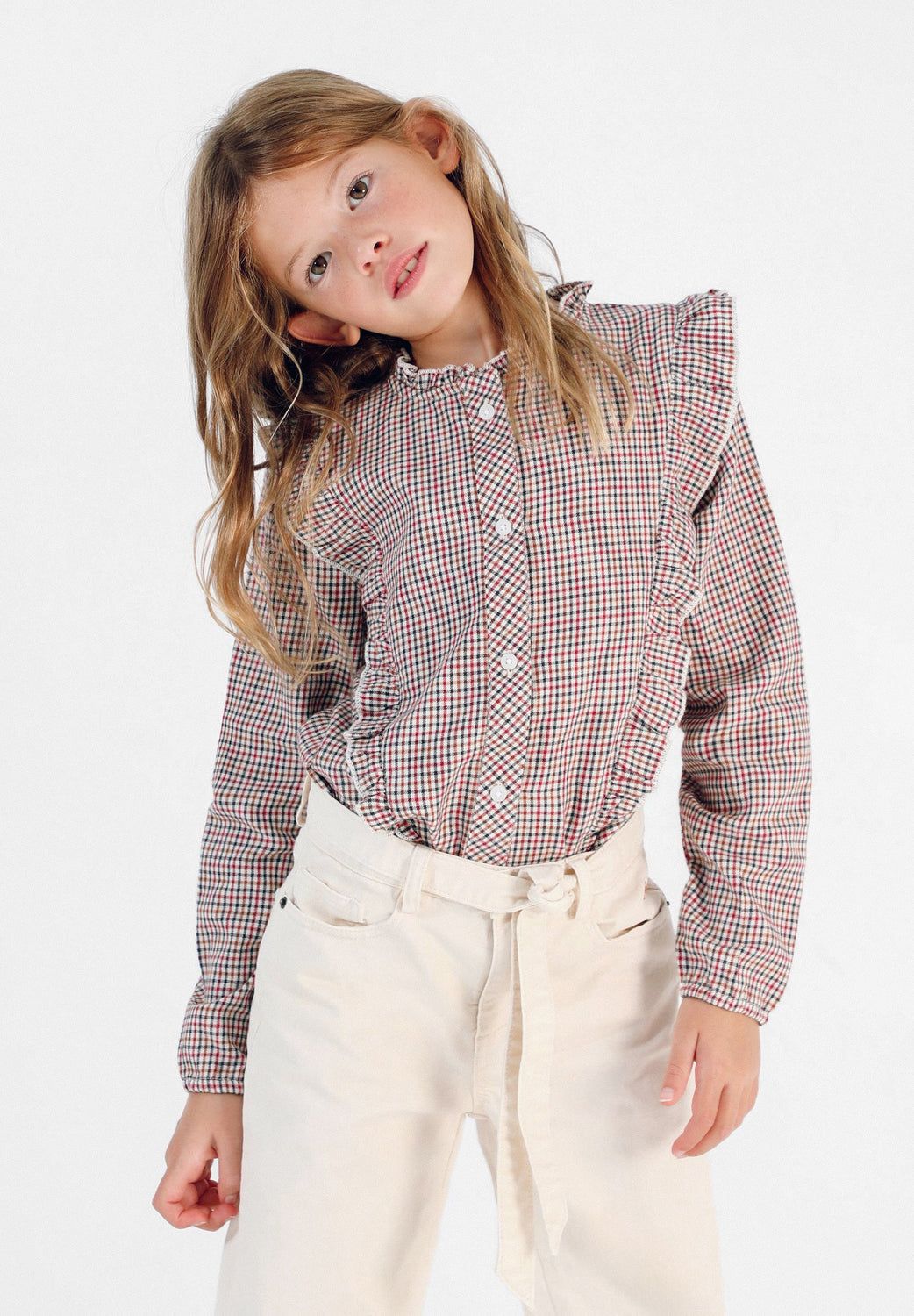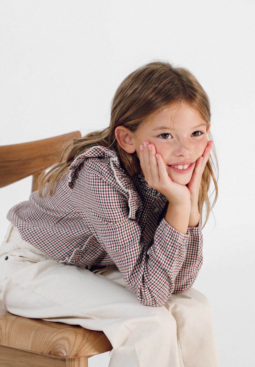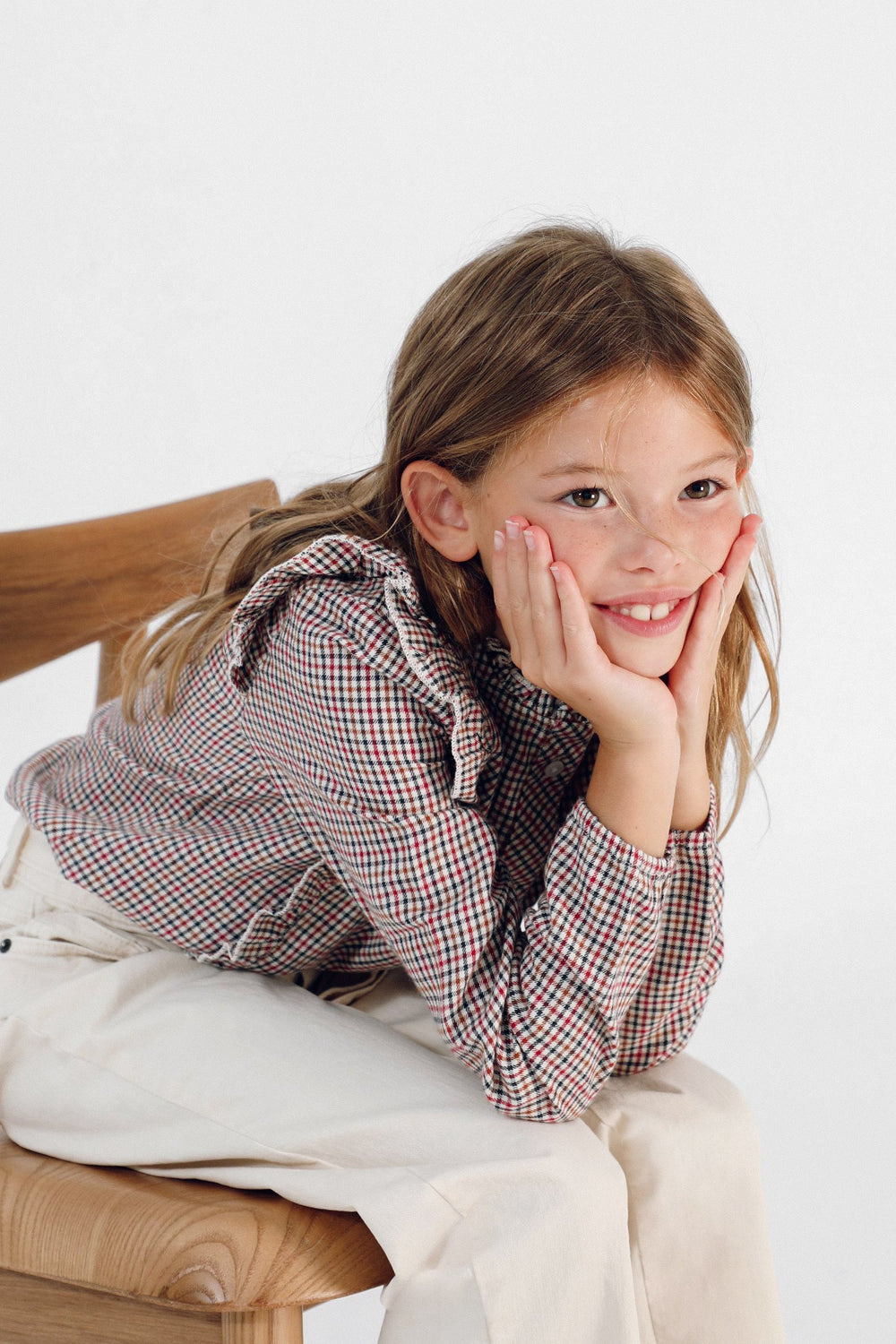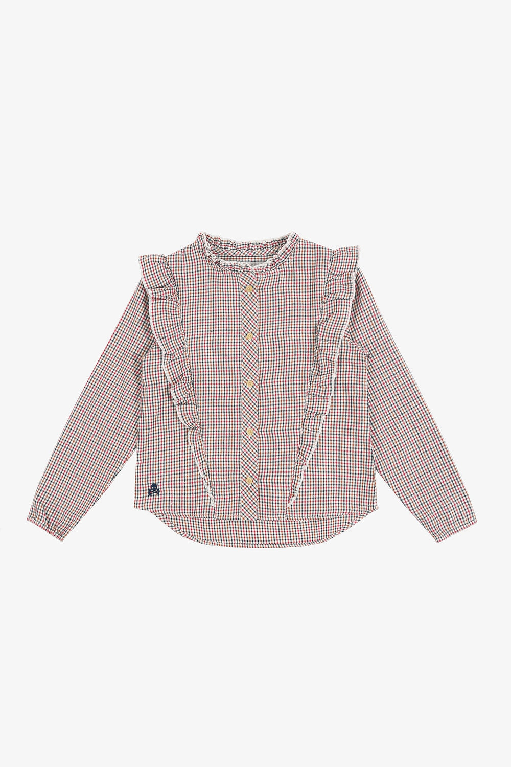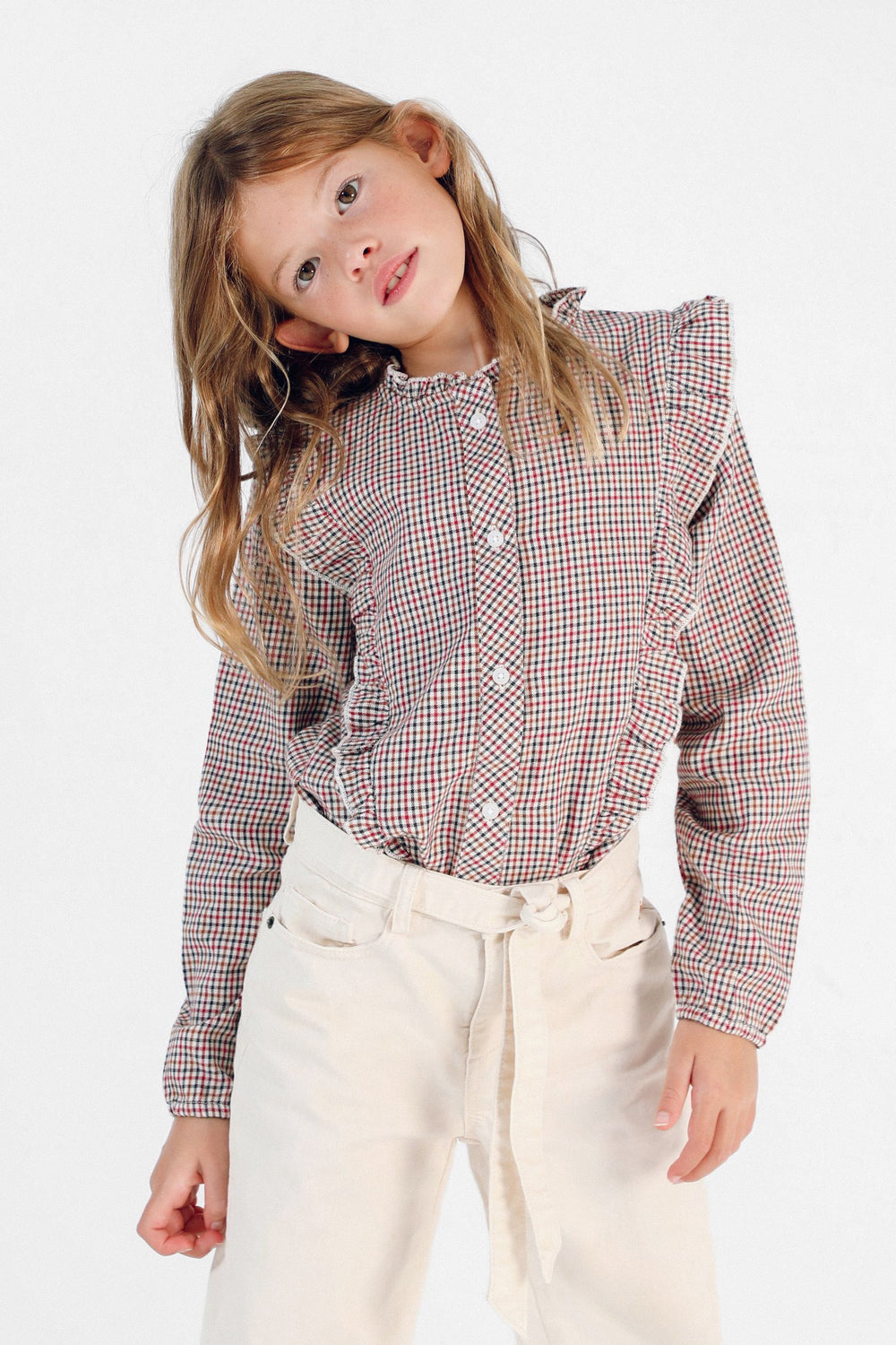 Blusa confeccionada en tejido 100% algodón. Corte Regular Fit, cuello con volante y cierre con botones en tapeta. Manga larga terminada en elástico y detalle de volantes a los lados.