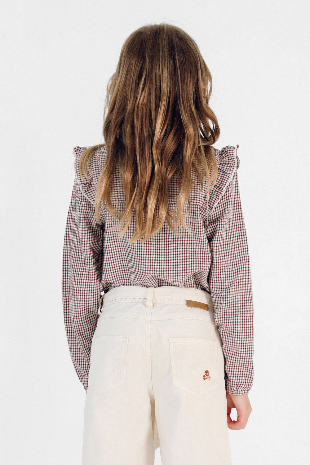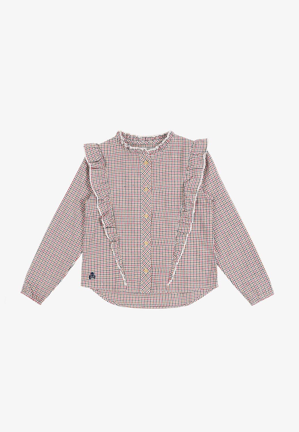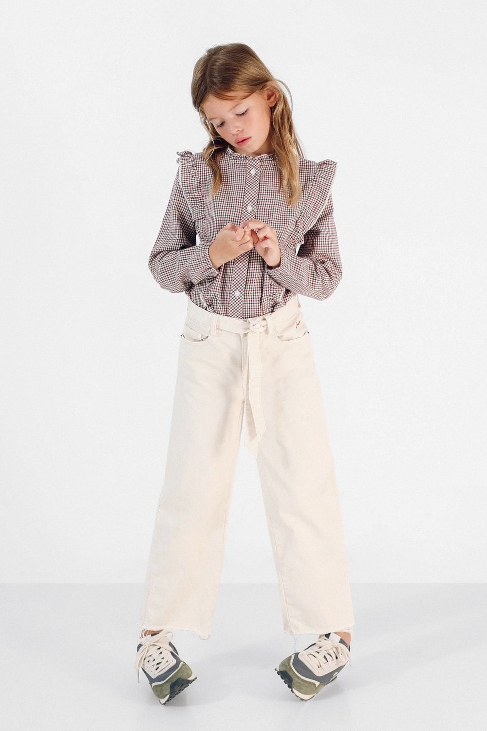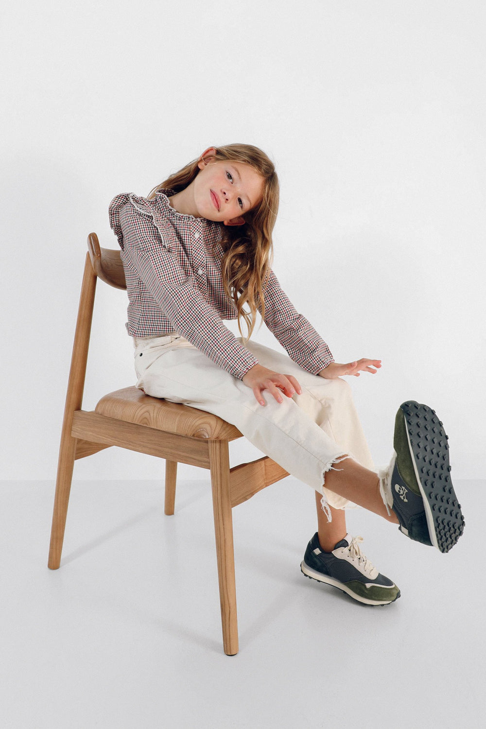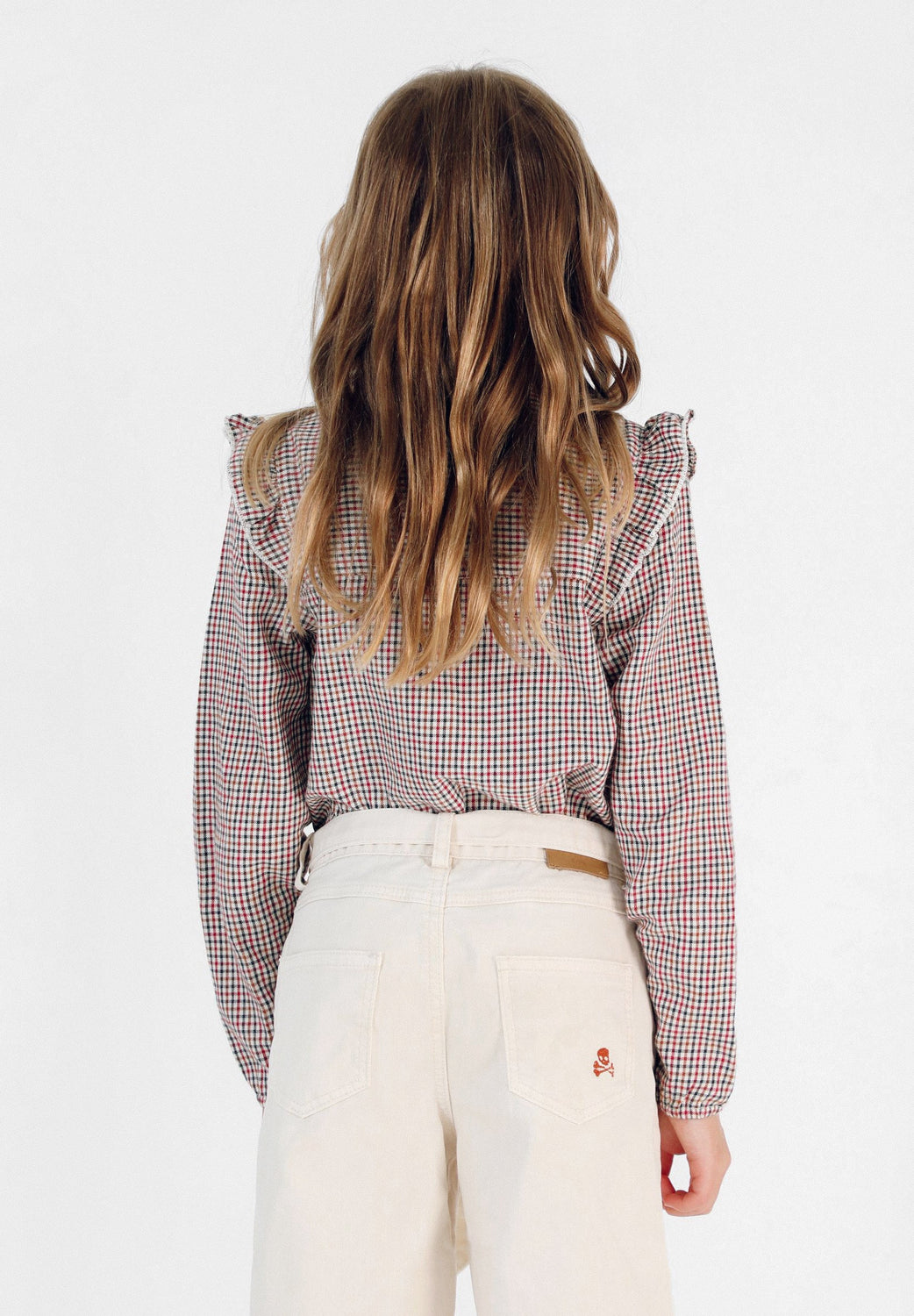 Blusa confeccionada en tejido 100% algodón. Corte Regular Fit, cuello con volante y cierre con botones en tapeta. Manga larga terminada en elástico y detalle de volantes a los lados.