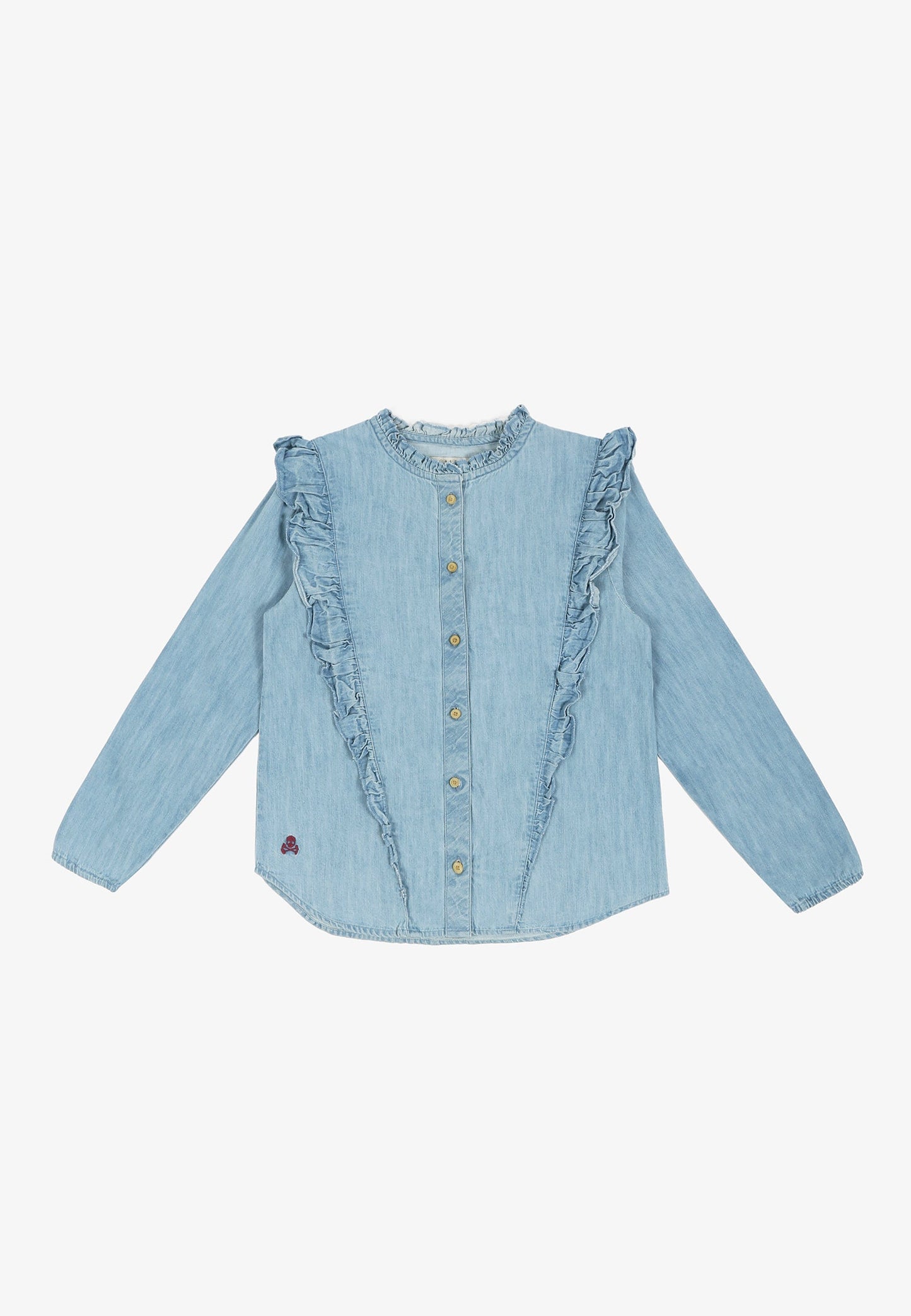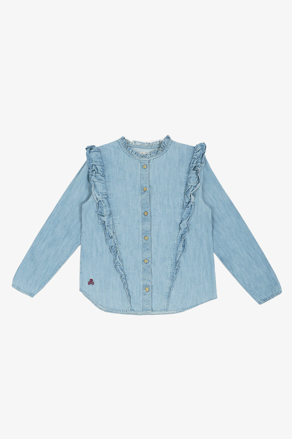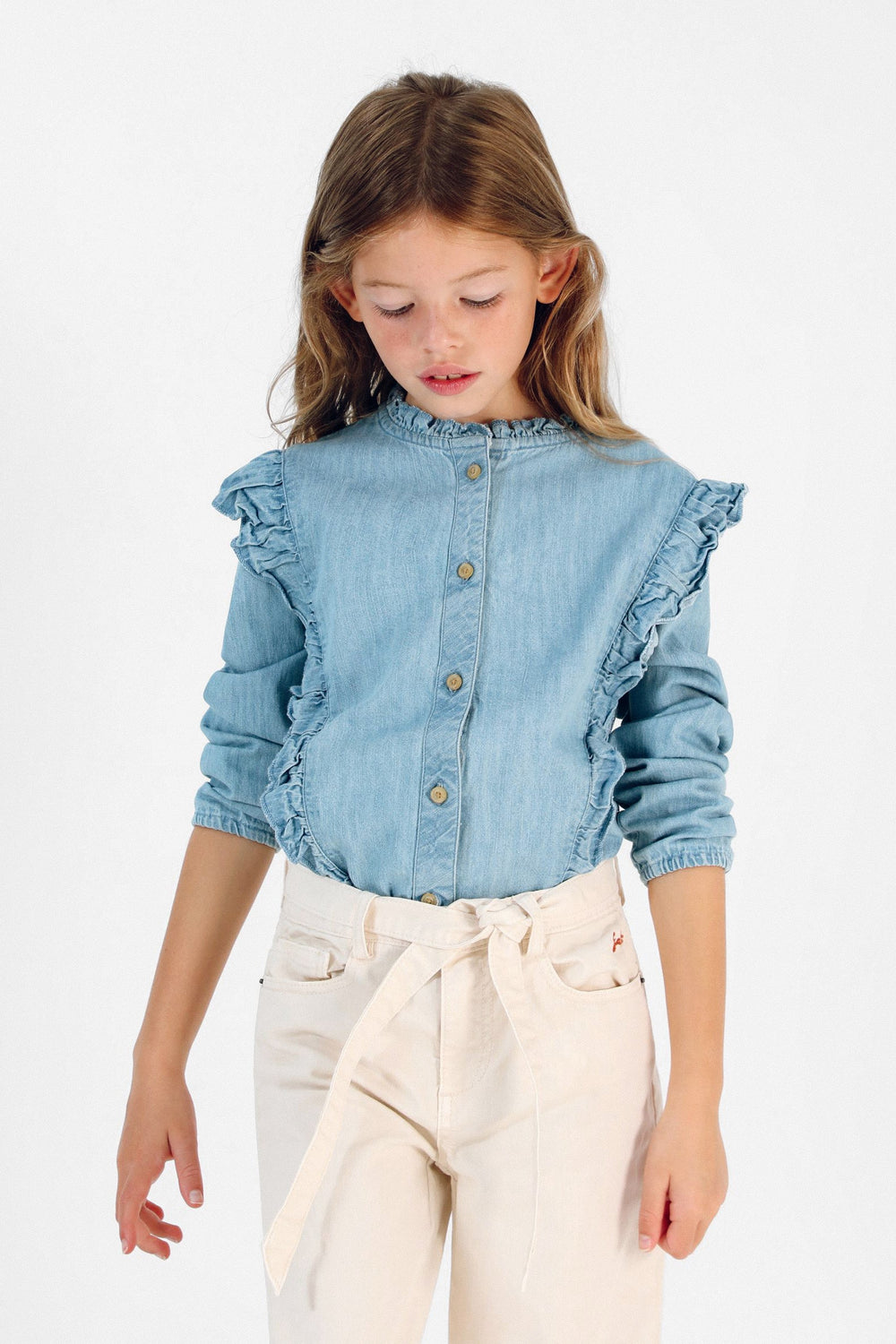 Blusa denim confeccionada en tejido 100% algodón. Corte Regular Fit, cuello con volante y cierre con botones en tapeta. Manga larga terminada en elástico y detalle de volantes a los lados.