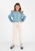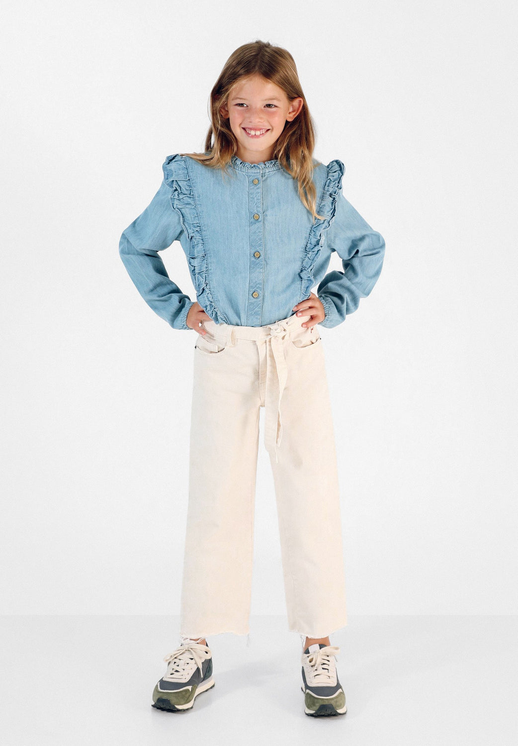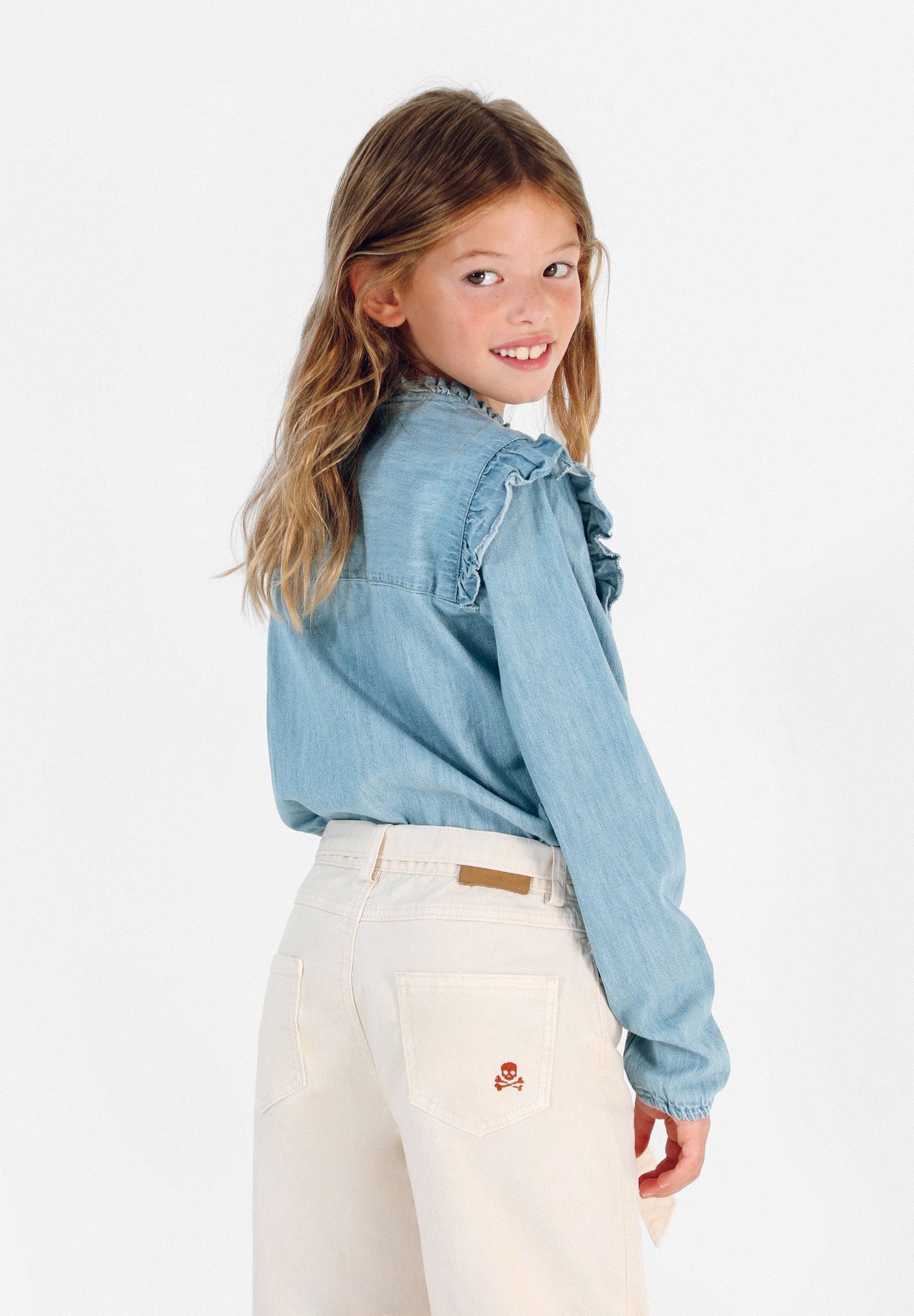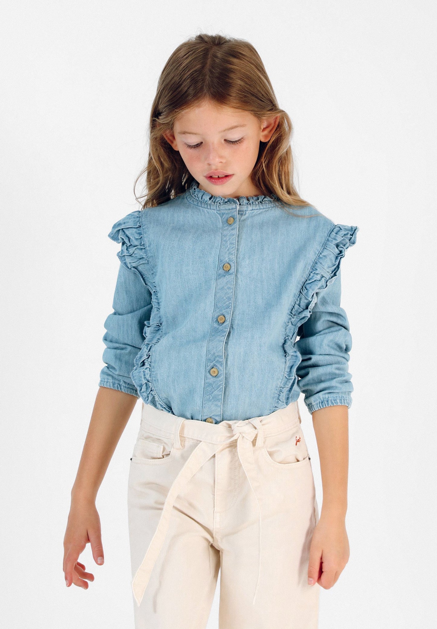 Blusa denim confeccionada en tejido 100% algodón. Corte Regular Fit, cuello con volante y cierre con botones en tapeta. Manga larga terminada en elástico y detalle de volantes a los lados.