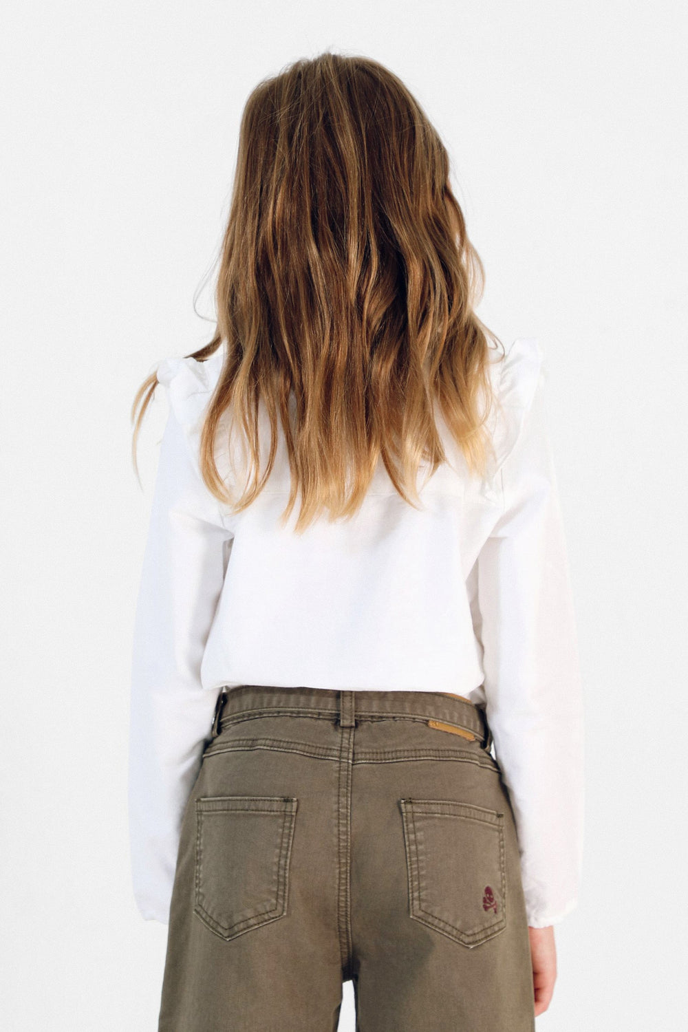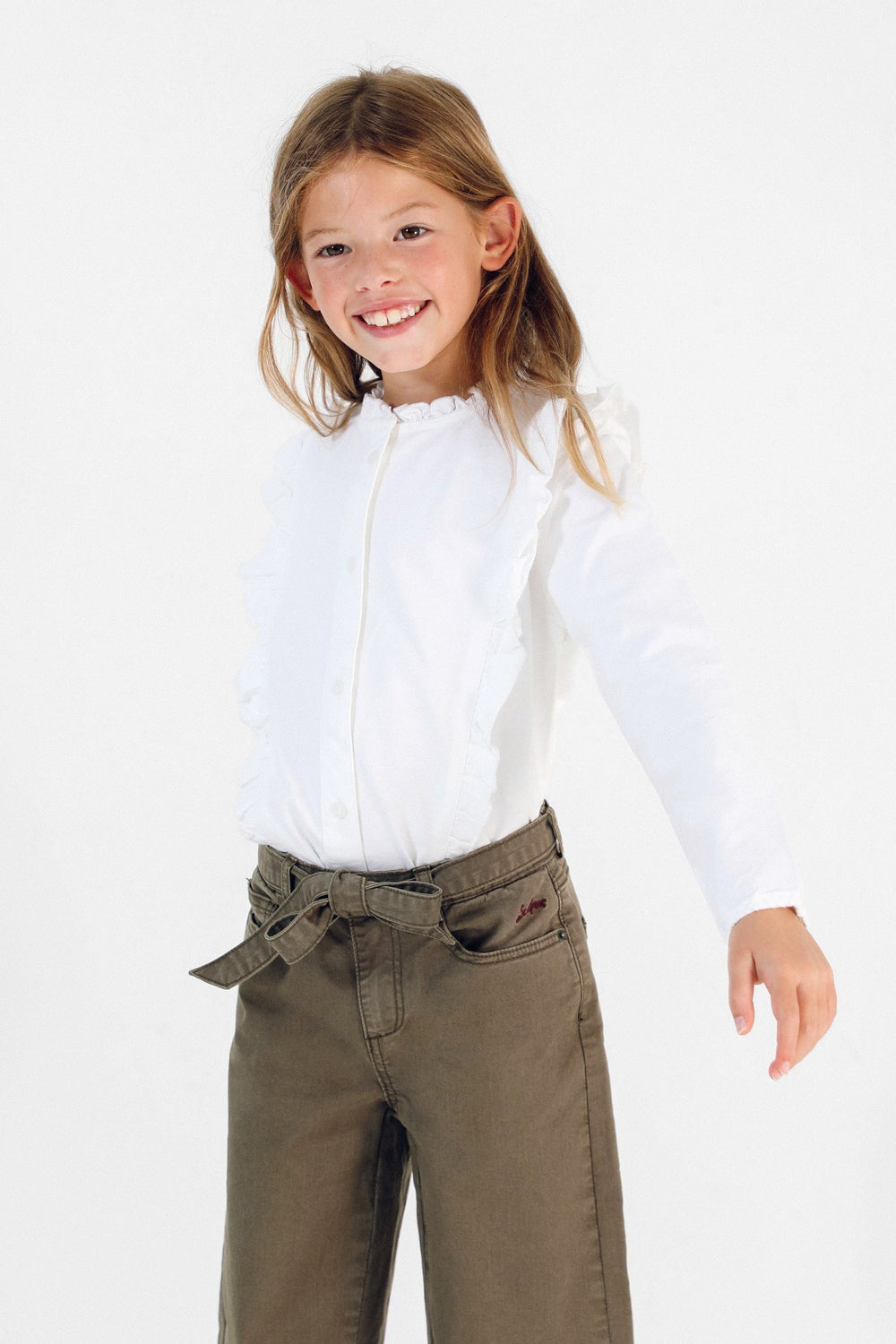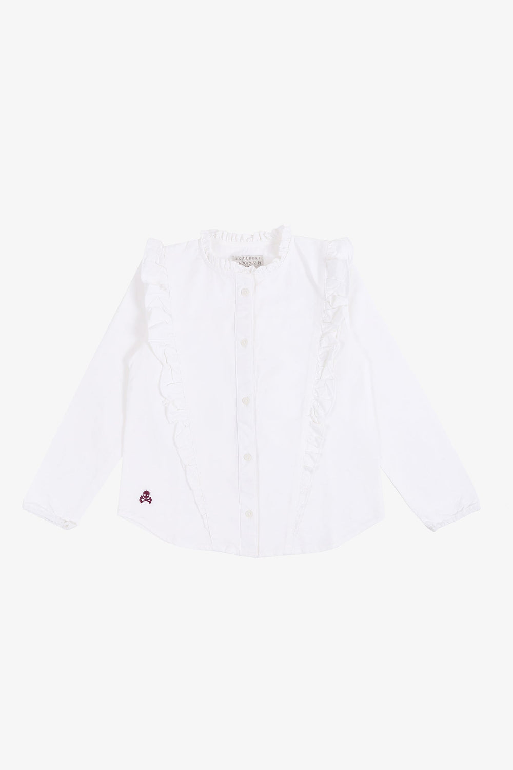 Blusa confeccionada en tejido 100% algodón. Corte Regular Fit, cuello con volante y cierre con botones en tapeta. Manga larga terminada en elástico y detalle de volantes a los lados.
