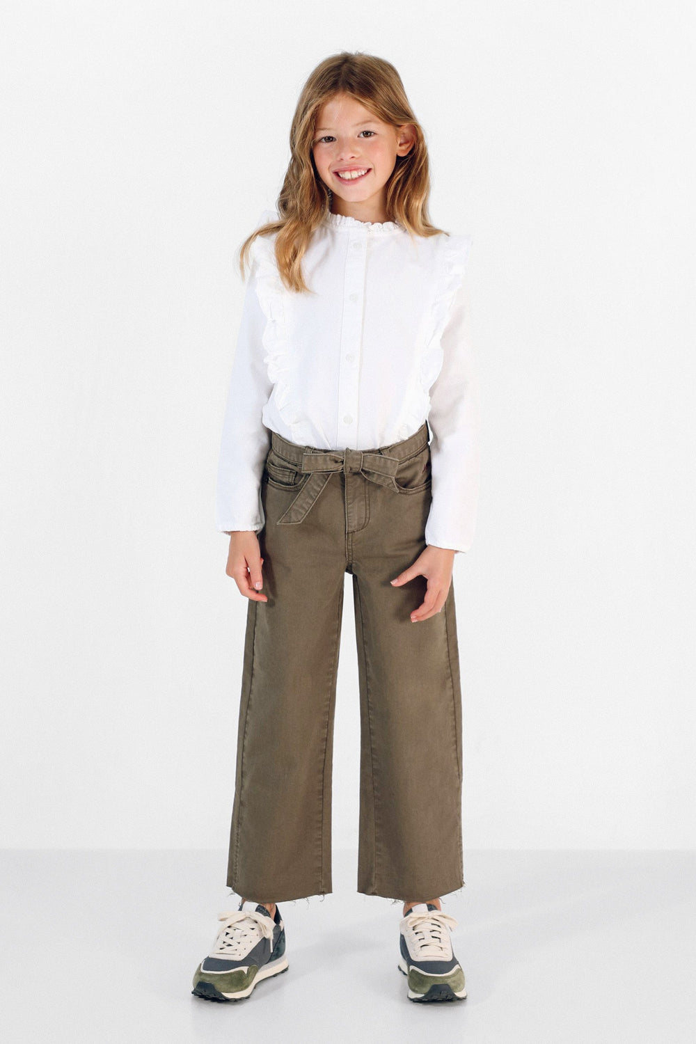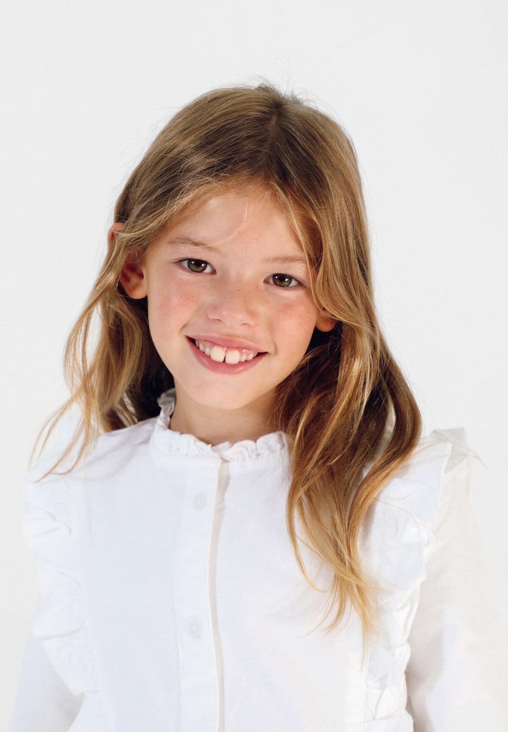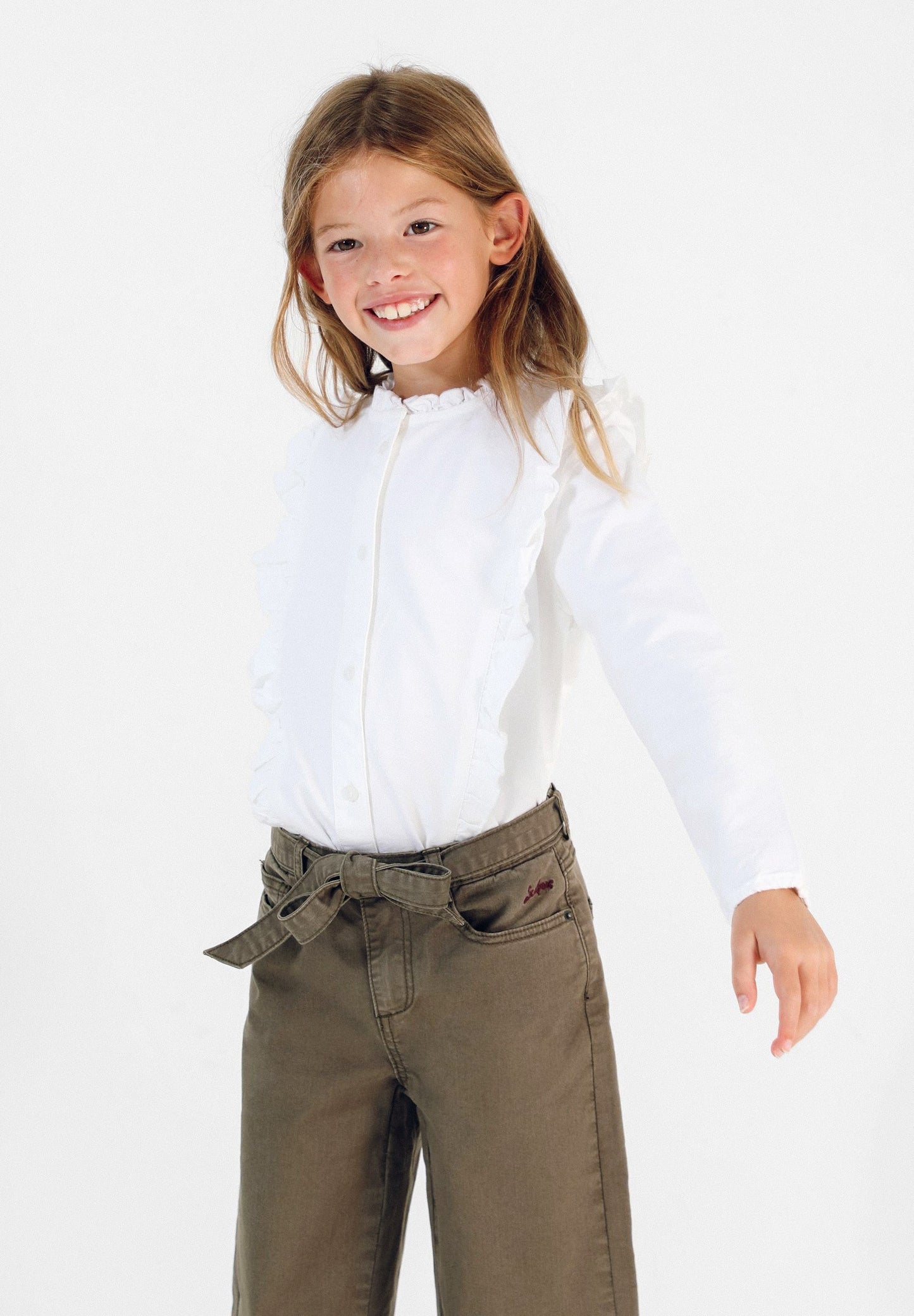 Blusa confeccionada en tejido 100% algodón. Corte Regular Fit, cuello con volante y cierre con botones en tapeta. Manga larga terminada en elástico y detalle de volantes a los lados.