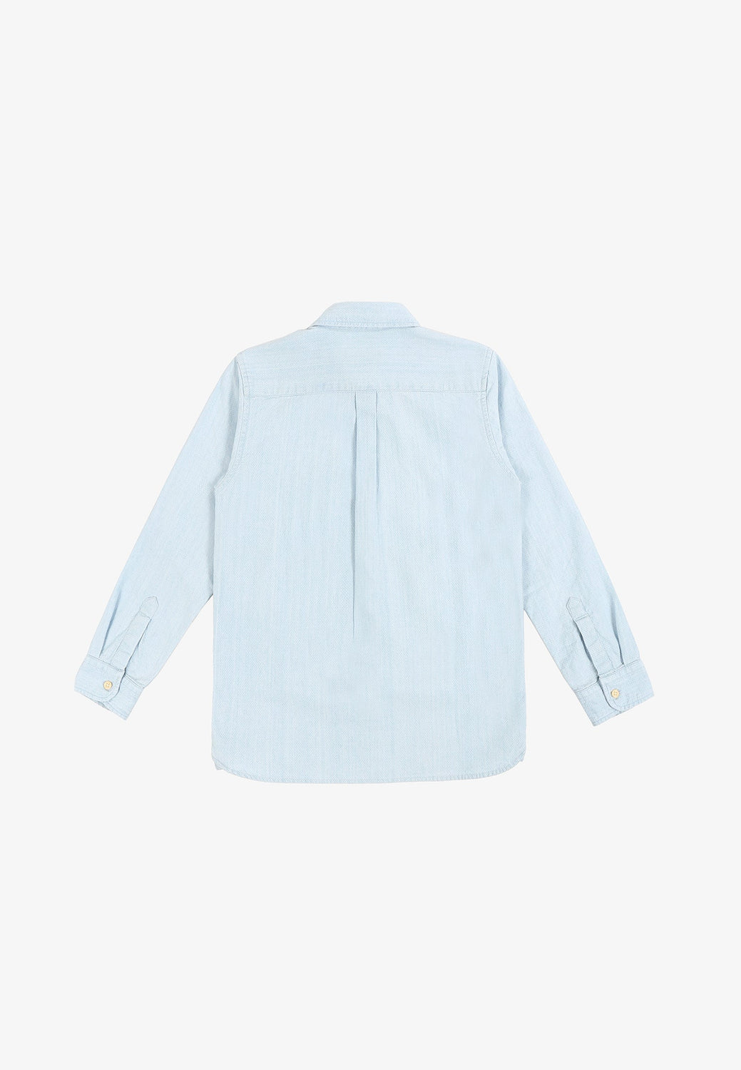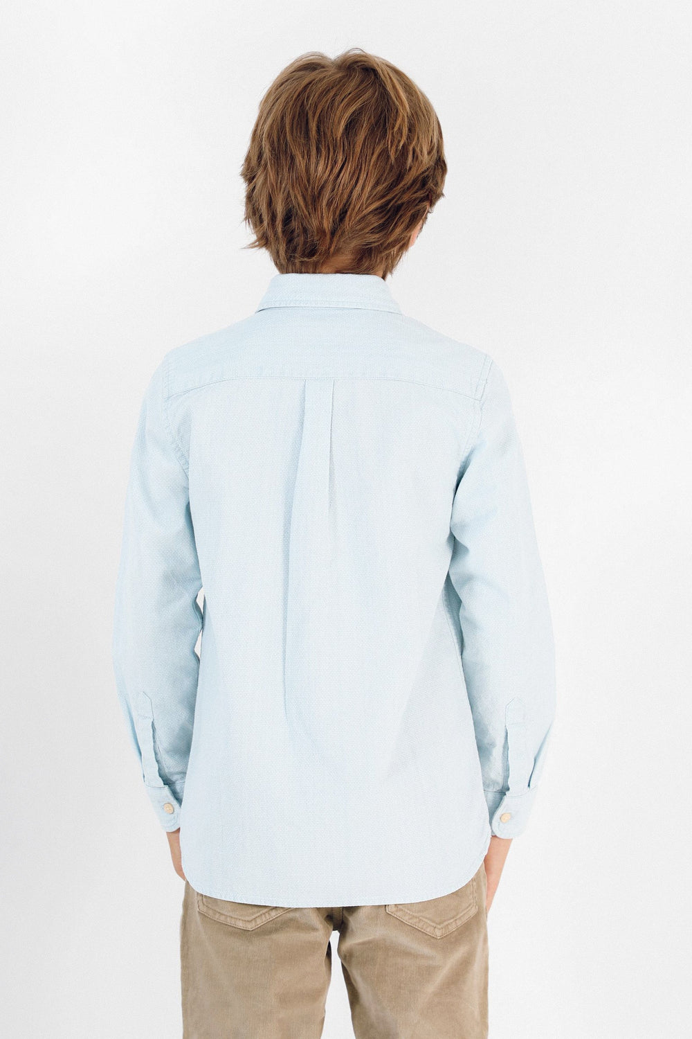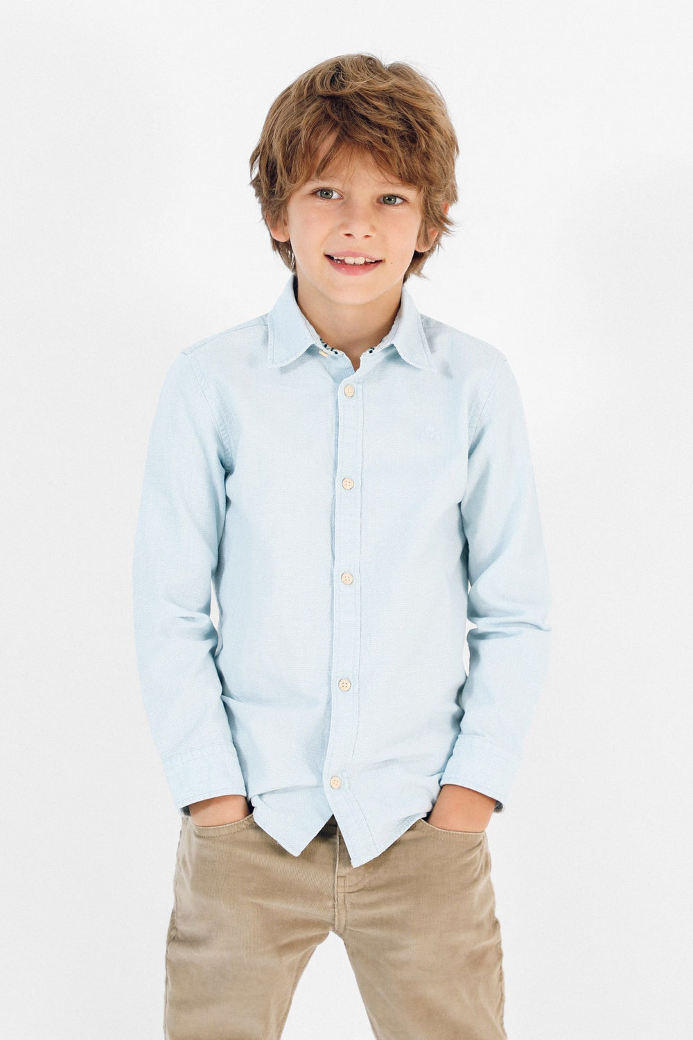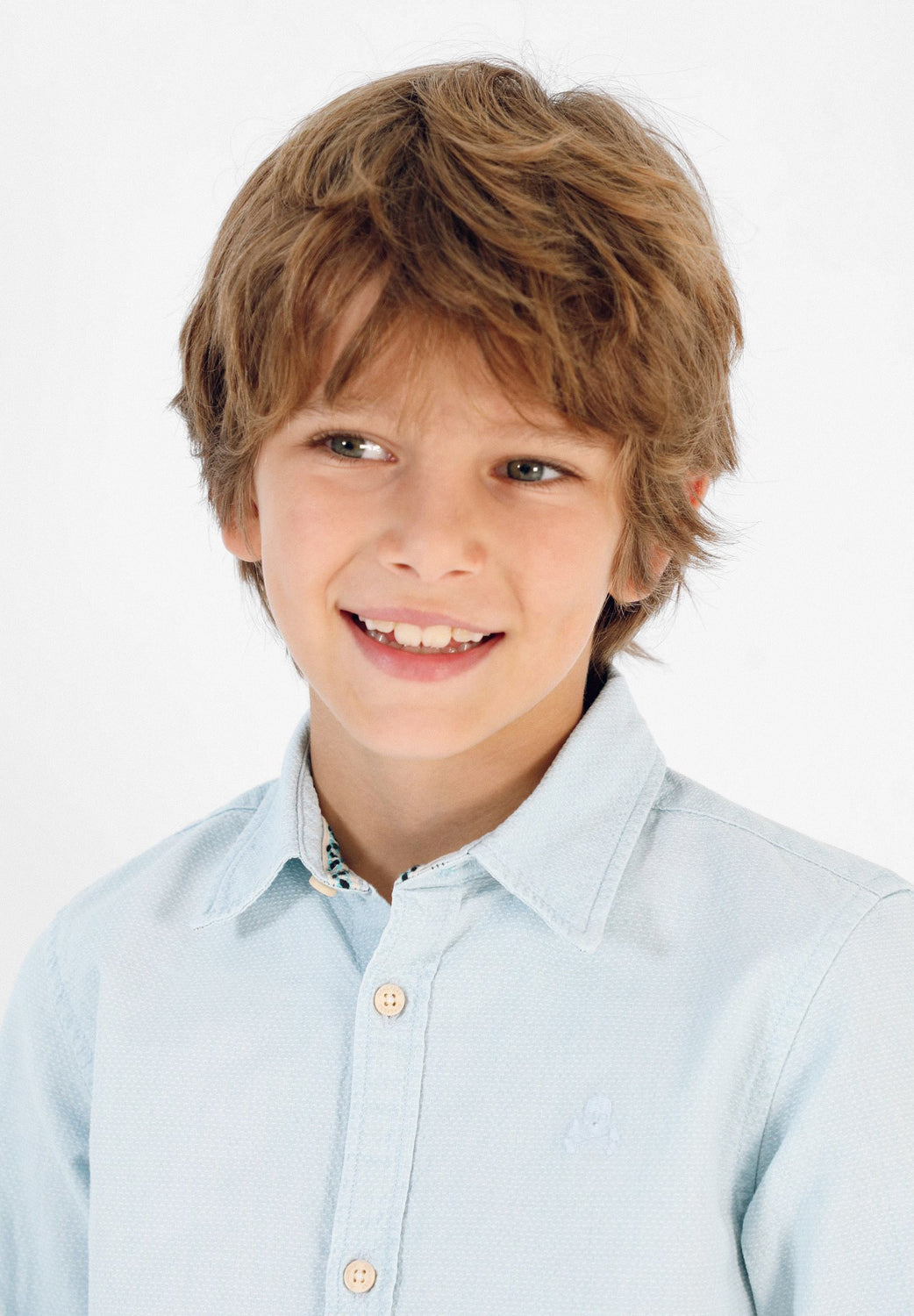 Camisa confeccionada en tejido 100% algodón orgánico. Corte Regular Fit, cuello italiano y cierre con botones. Manga larga terminada en puño y detalle de calavera bordada a tono.