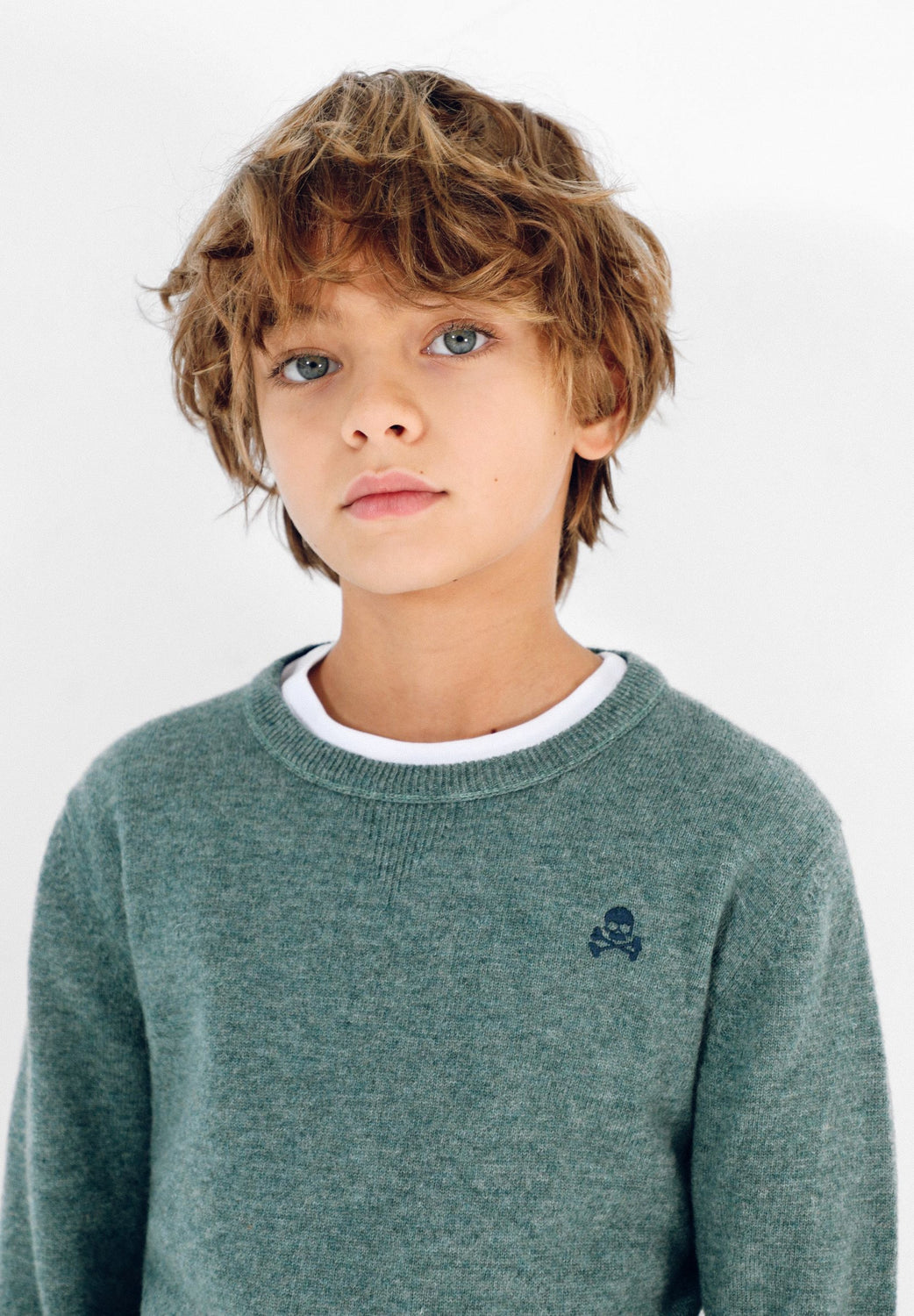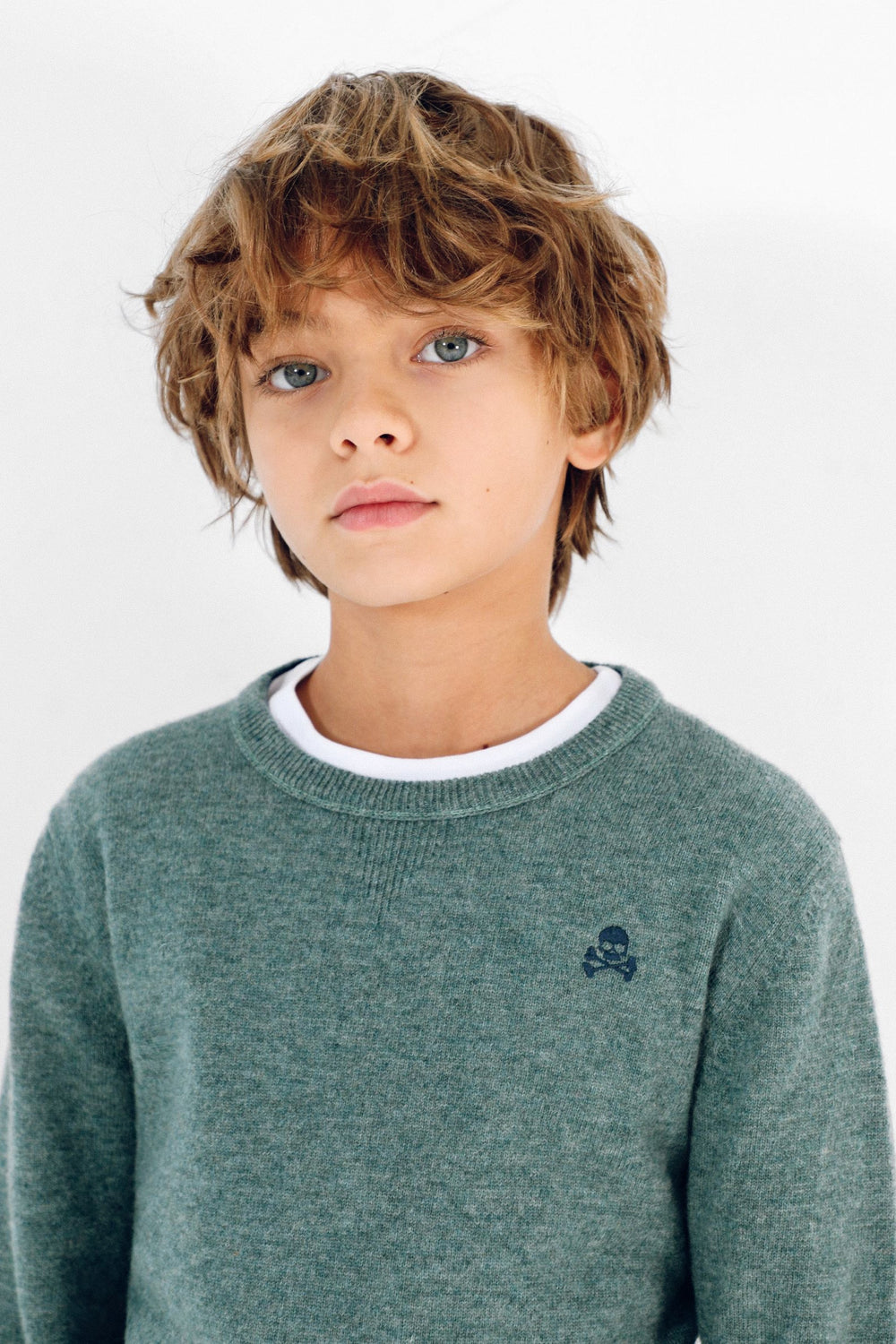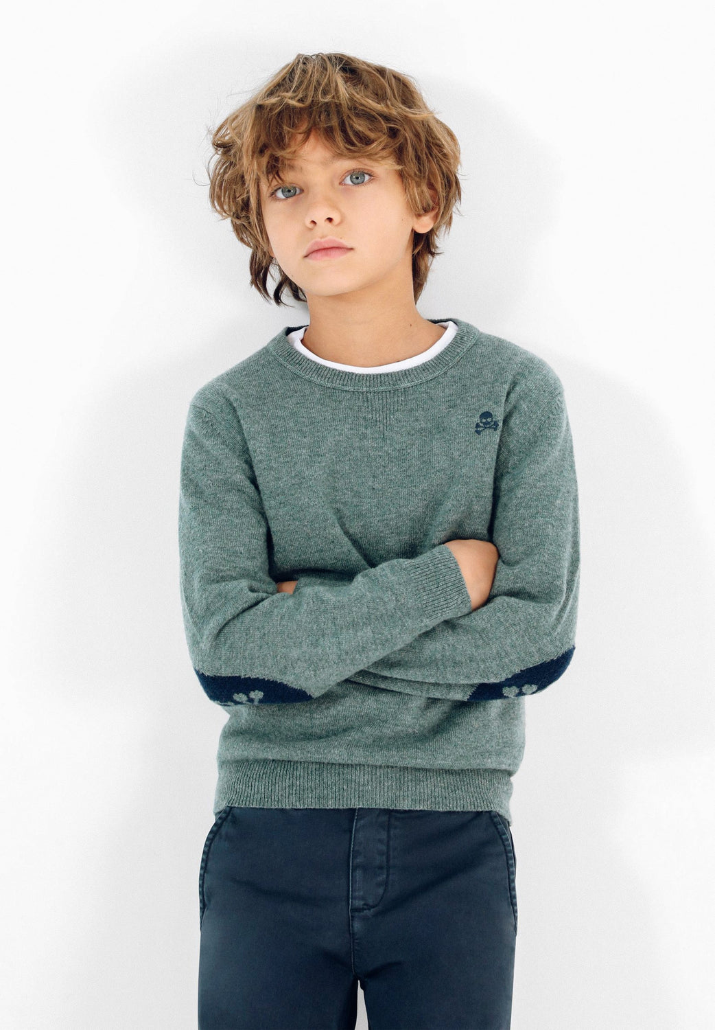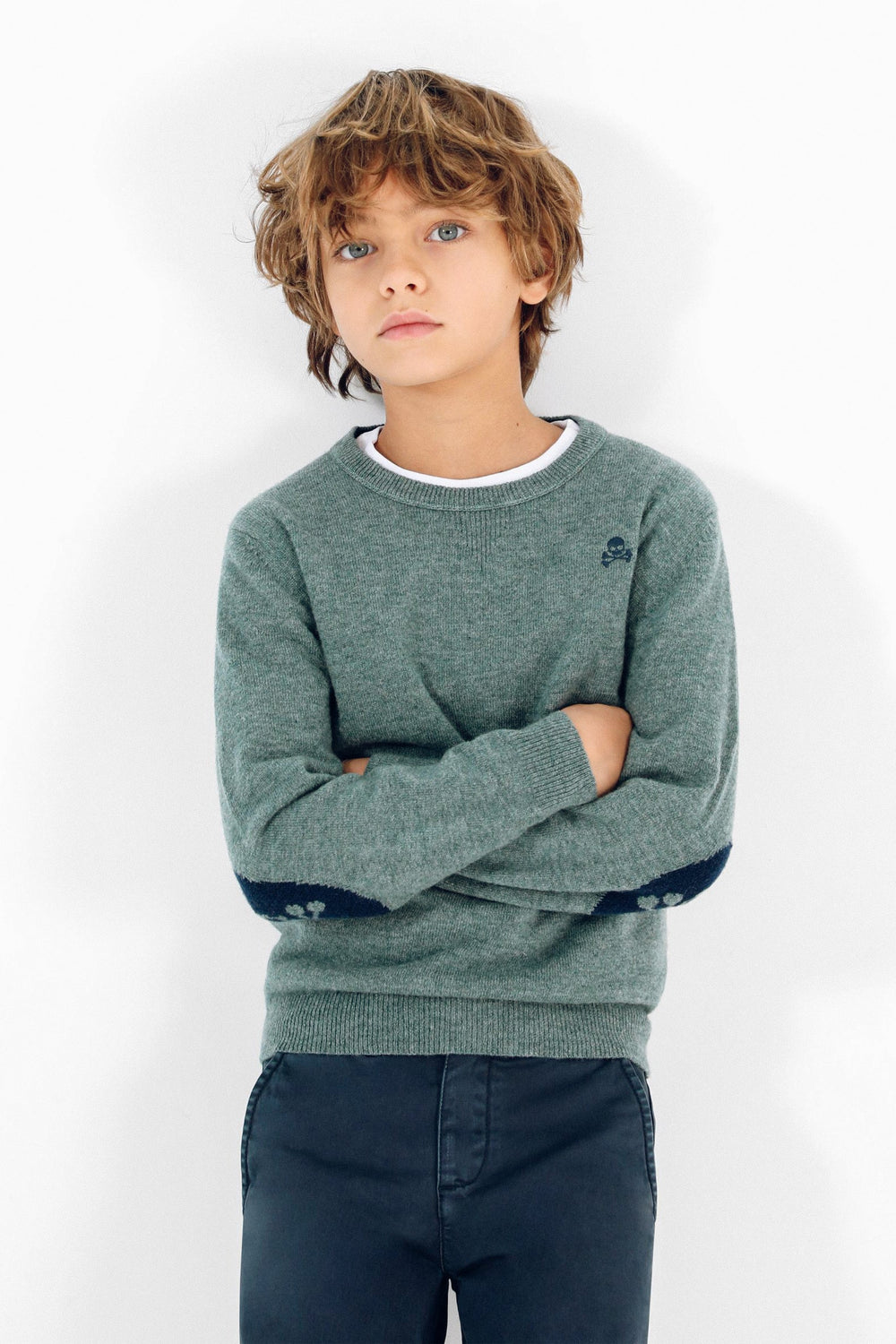 Jersey confeccionado en tejido mezcla de lana. Corte Regular Fit, cuello de pico y manga larga. Detalle de coderas con calavera y calavera a contraste en el pecho.
