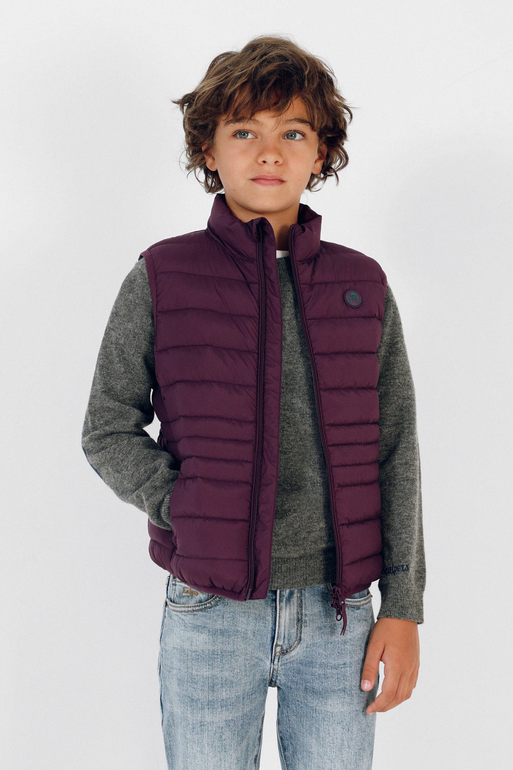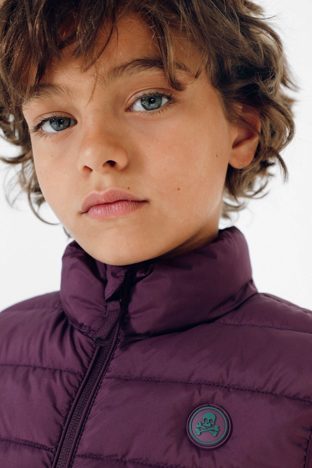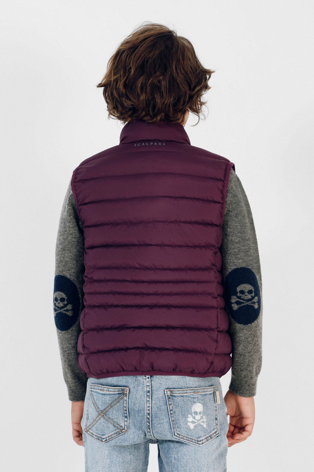 Chaleco sin mangas confeccionado en poliéster reciclado. Corte recto, cuello subido y cierre con cremallera de doble carro. Tiene bolsillos con cremallera laterales y presenta como detalle la calavera engomada en el pecho.
