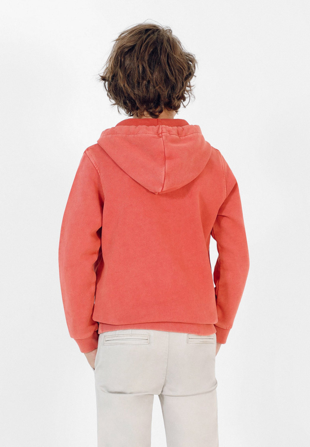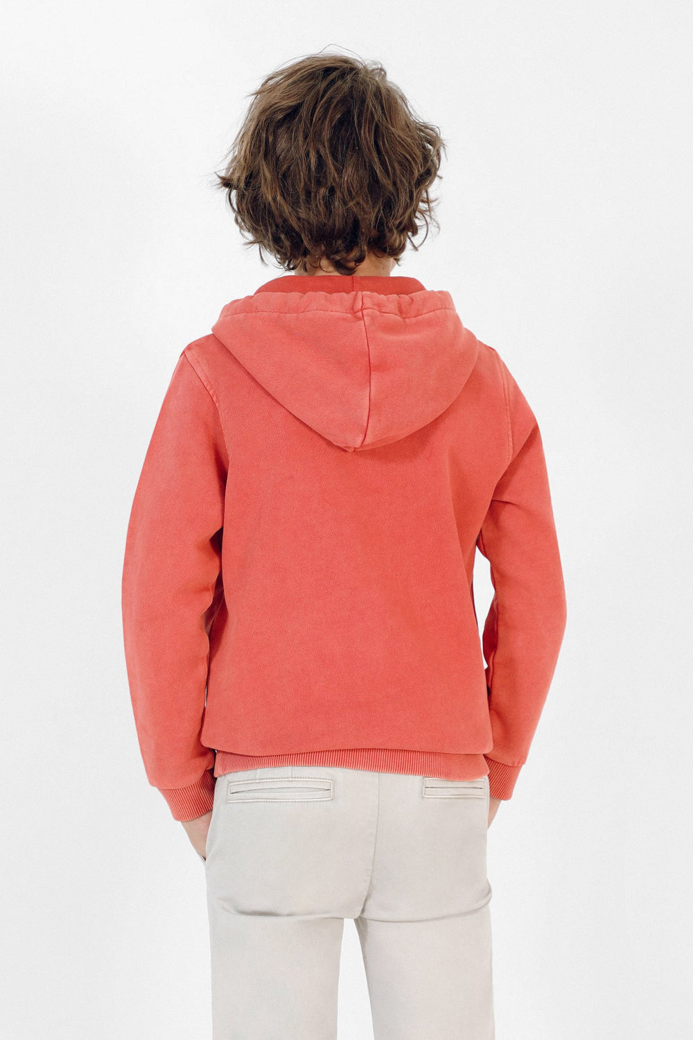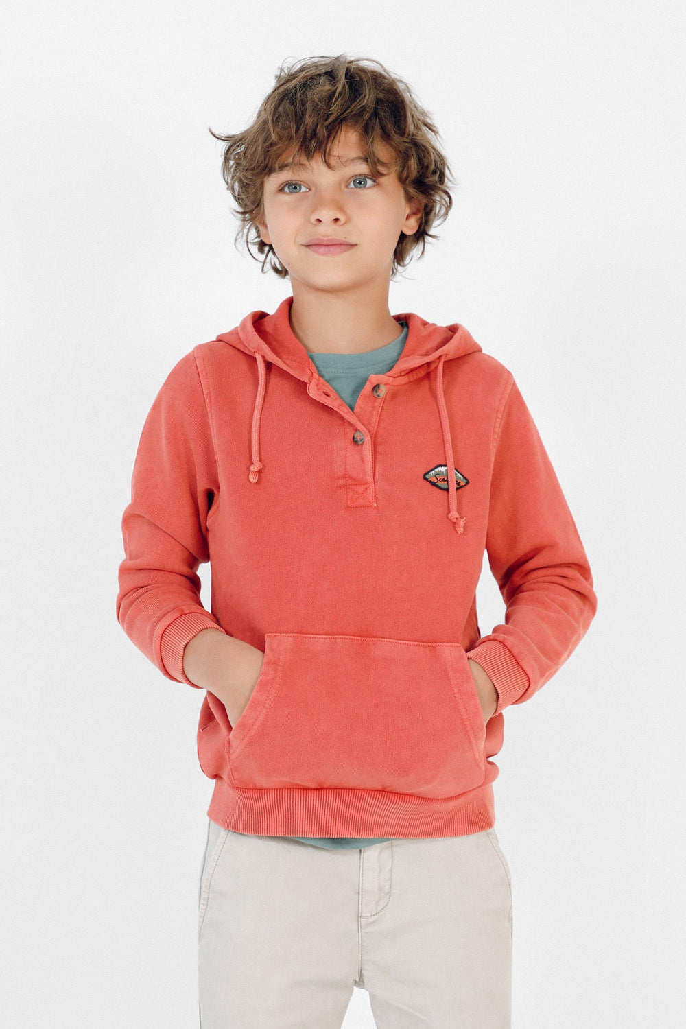 Sudadera confeccionada en tejido 100% algodón lavado. Corte Regular Fit, cuello con capucha con cordones y cierre con botones. Bolsillo canguro y manga larga.