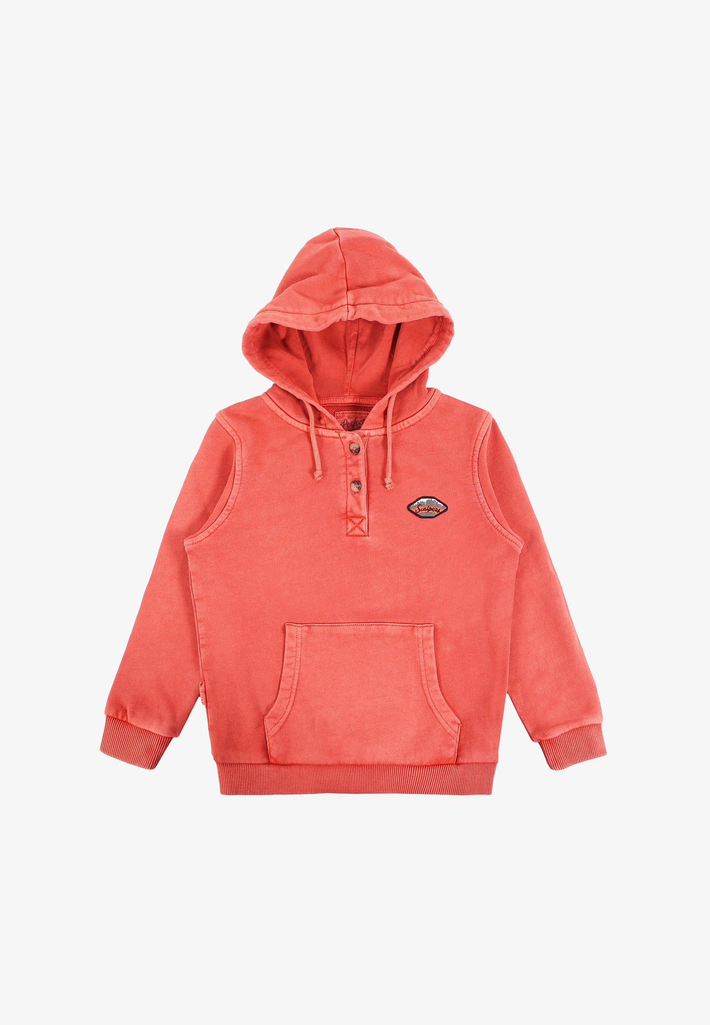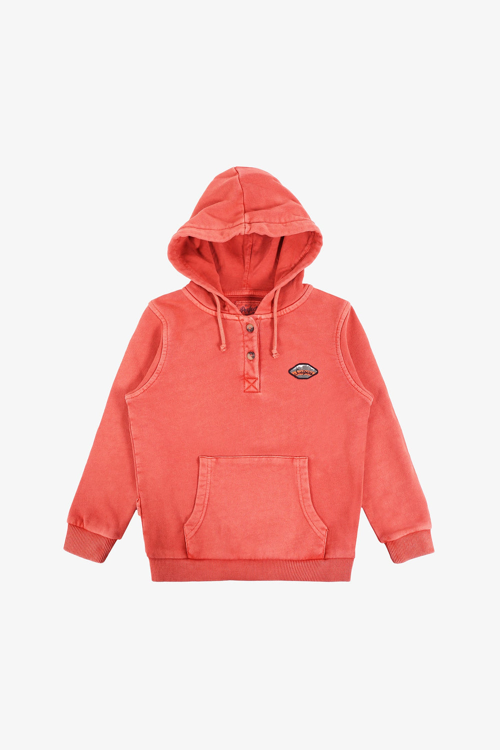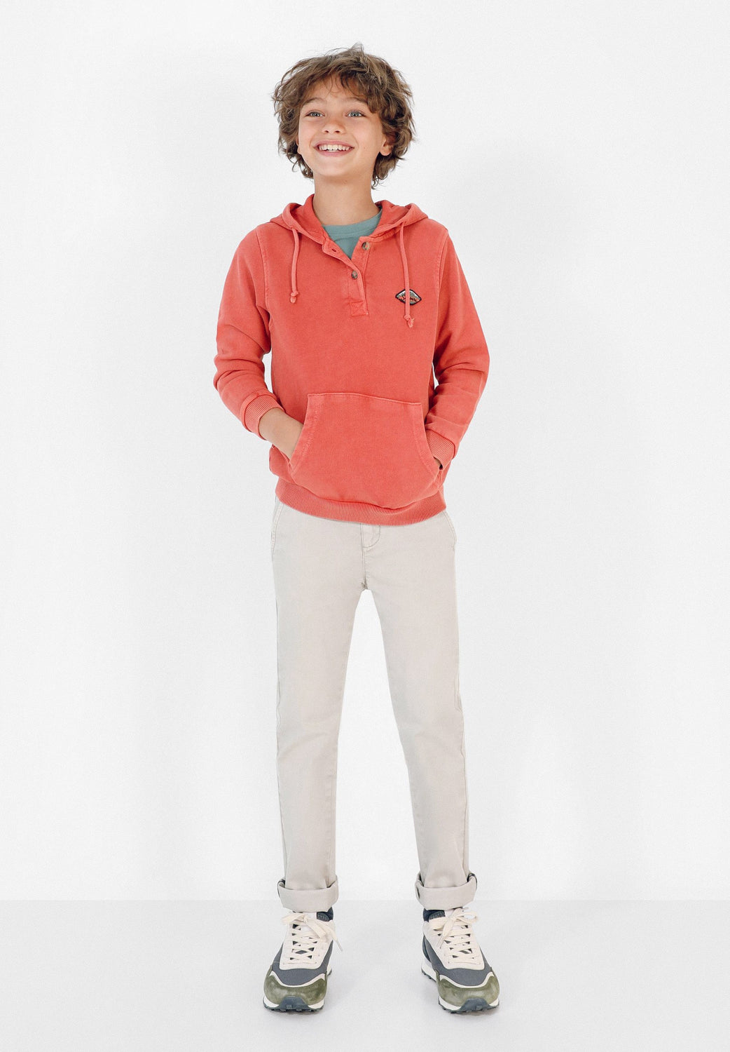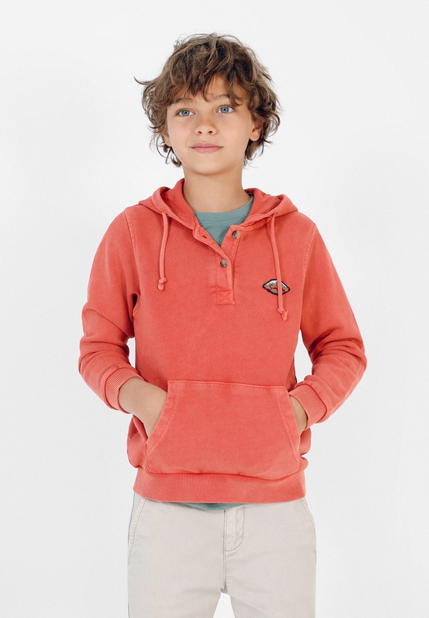 Sudadera confeccionada en tejido 100% algodón lavado. Corte Regular Fit, cuello con capucha con cordones y cierre con botones. Bolsillo canguro y manga larga.