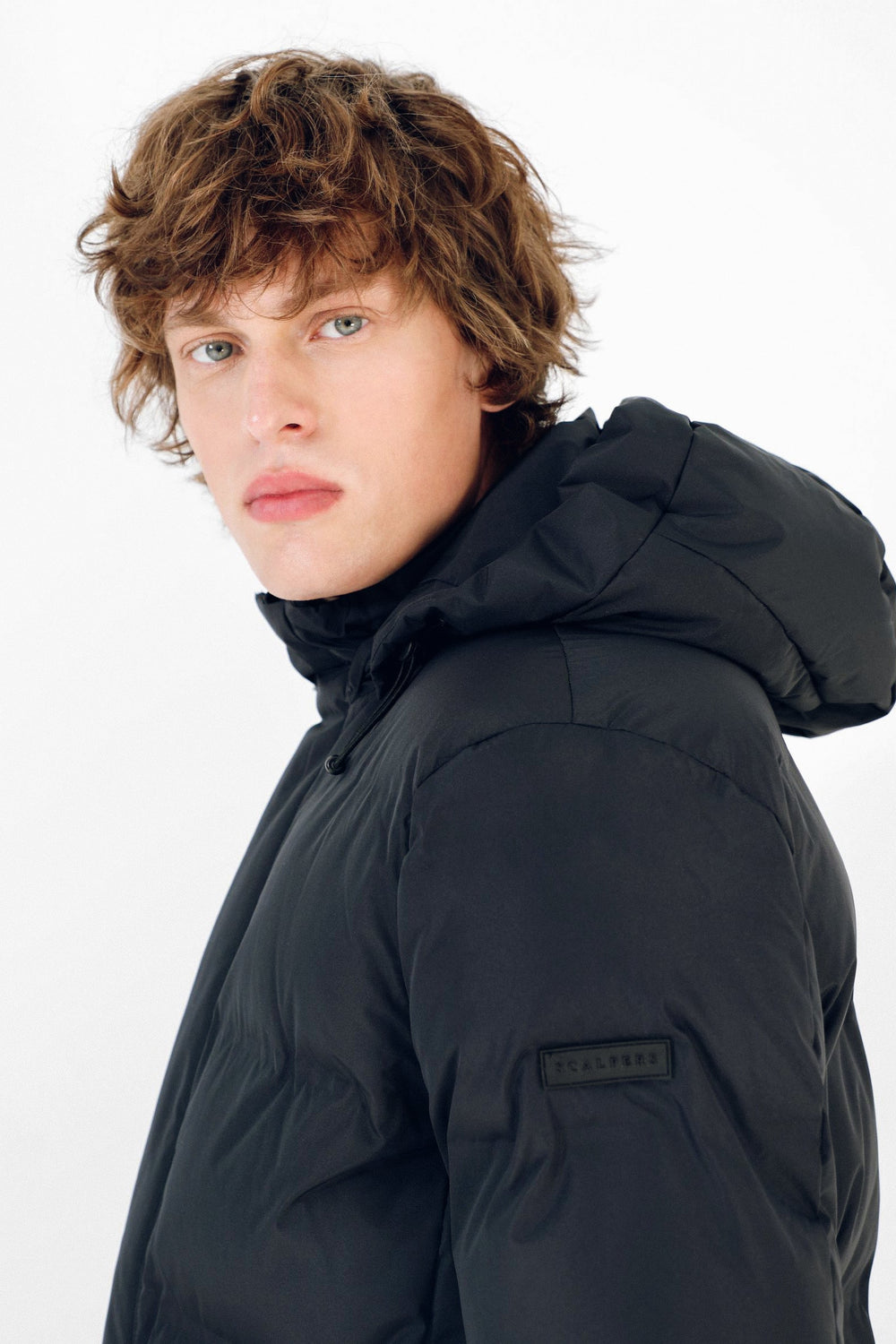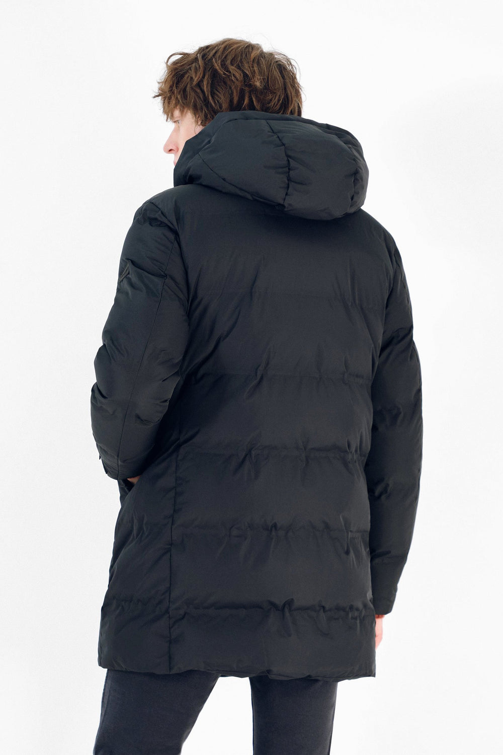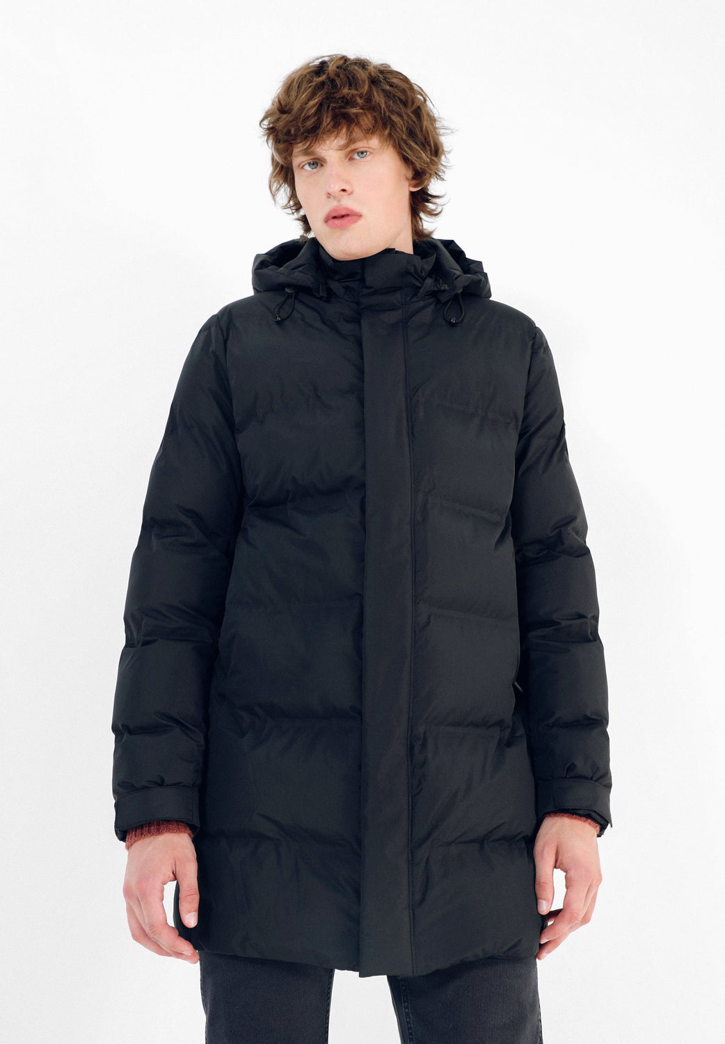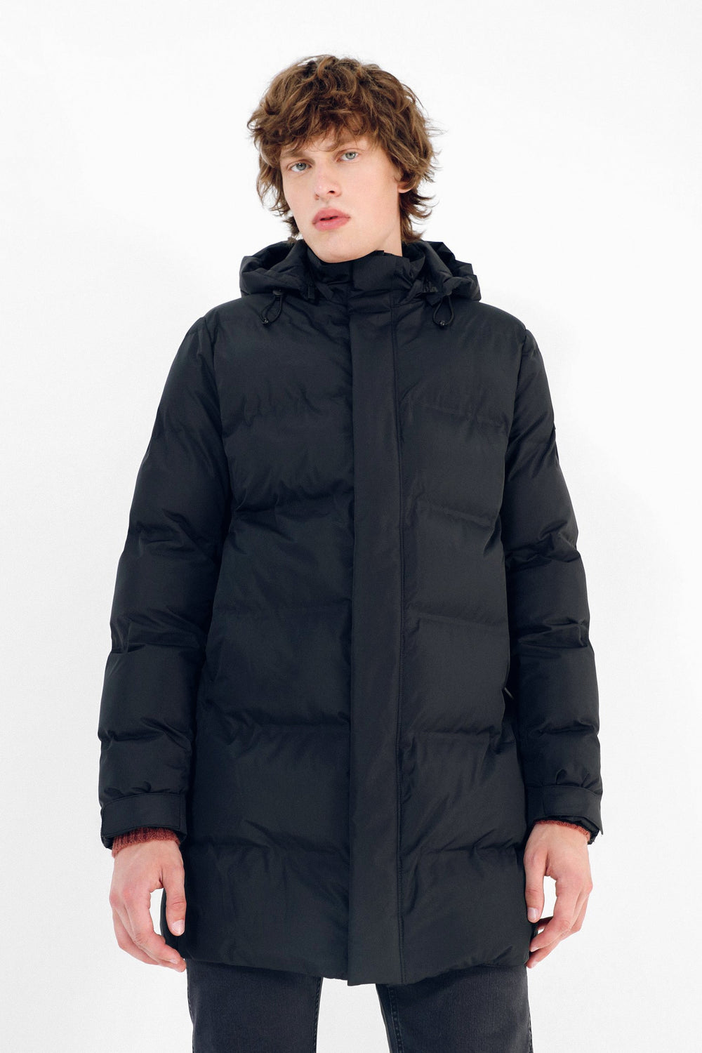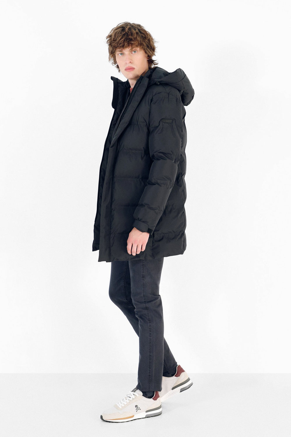 Abrigo largo acolchado confeccionado en tejido 100% poliéster reciclado. Corte Regular Fit, cuello con capucha y cierre con cremallera de doble carro. Manga larga y bolsillos laterales e interiores.