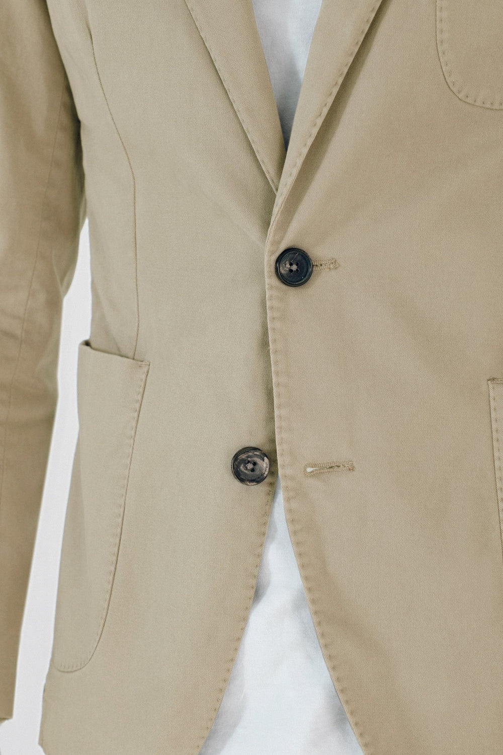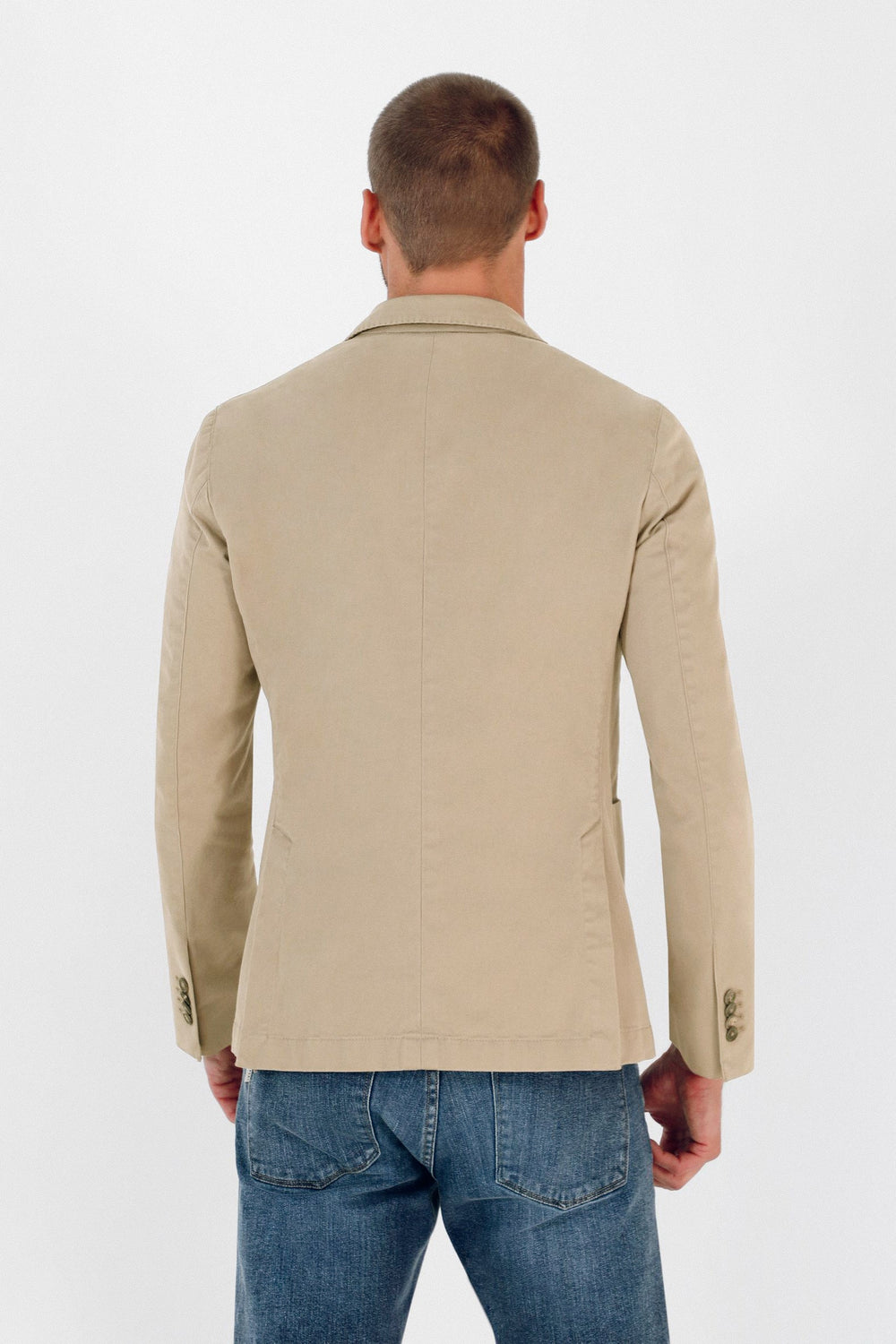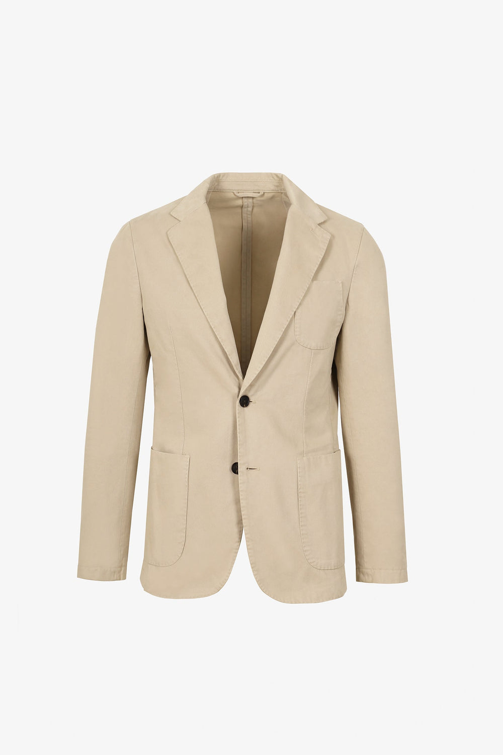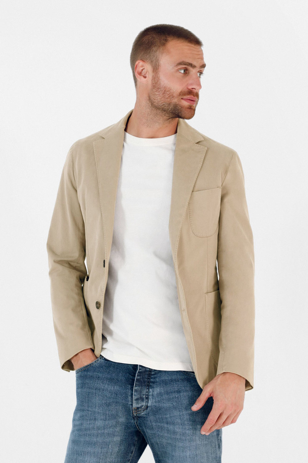 Americana confeccionada en tejido 100% algodón. Corte Regular Fit, cuello con solapas y cierre con botones. Manga larga terminada en puño con botones y bolsillos de parche.