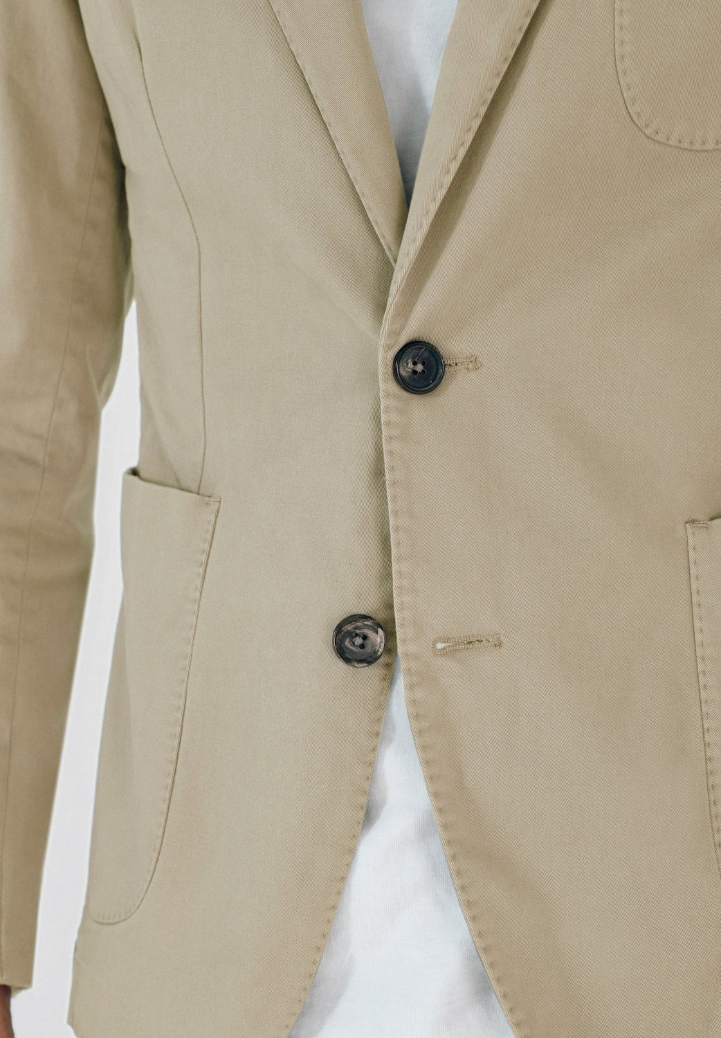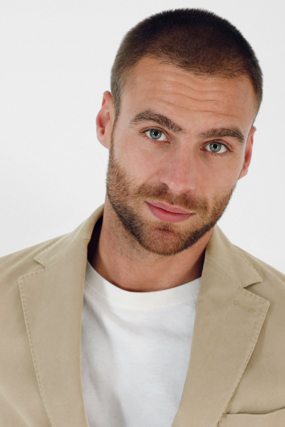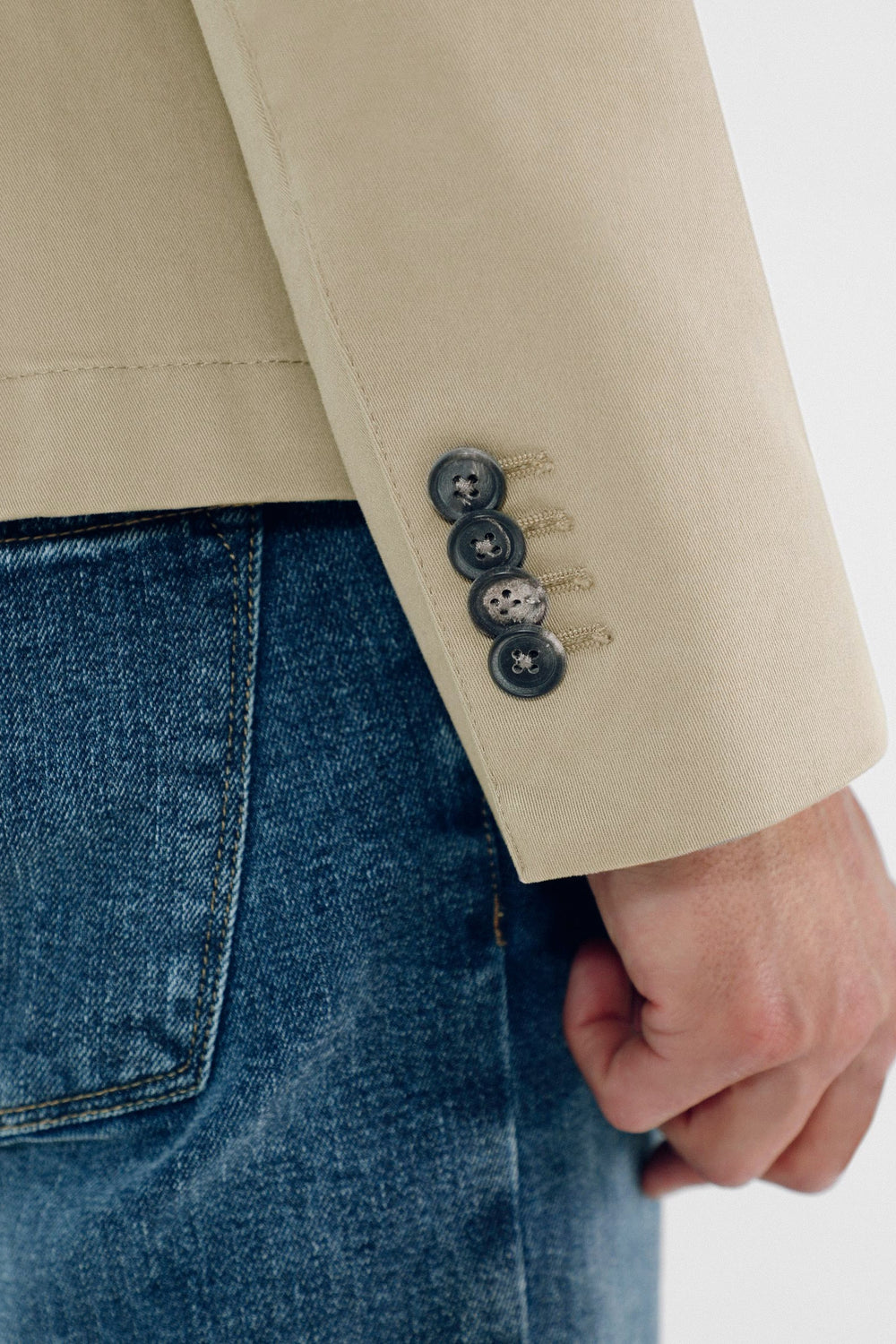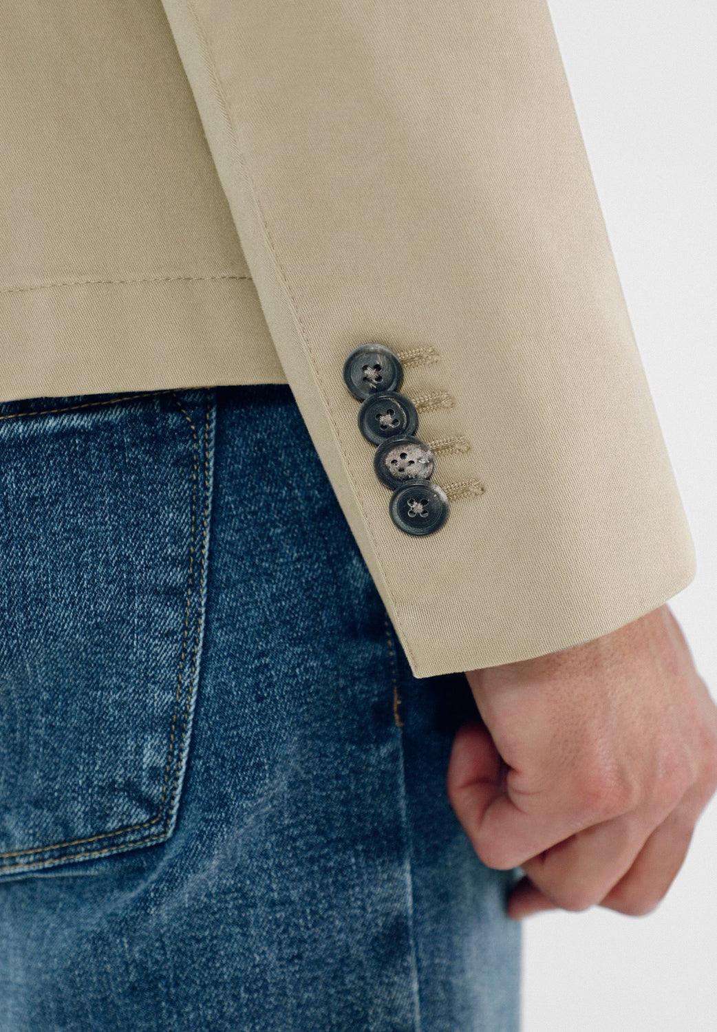 Americana confeccionada en tejido 100% algodón. Corte Regular Fit, cuello con solapas y cierre con botones. Manga larga terminada en puño con botones y bolsillos de parche.
