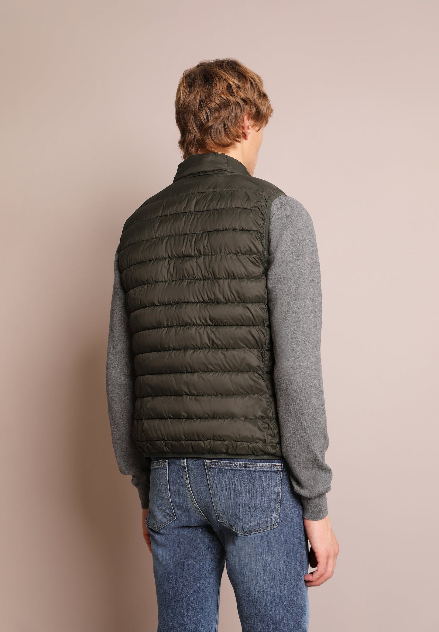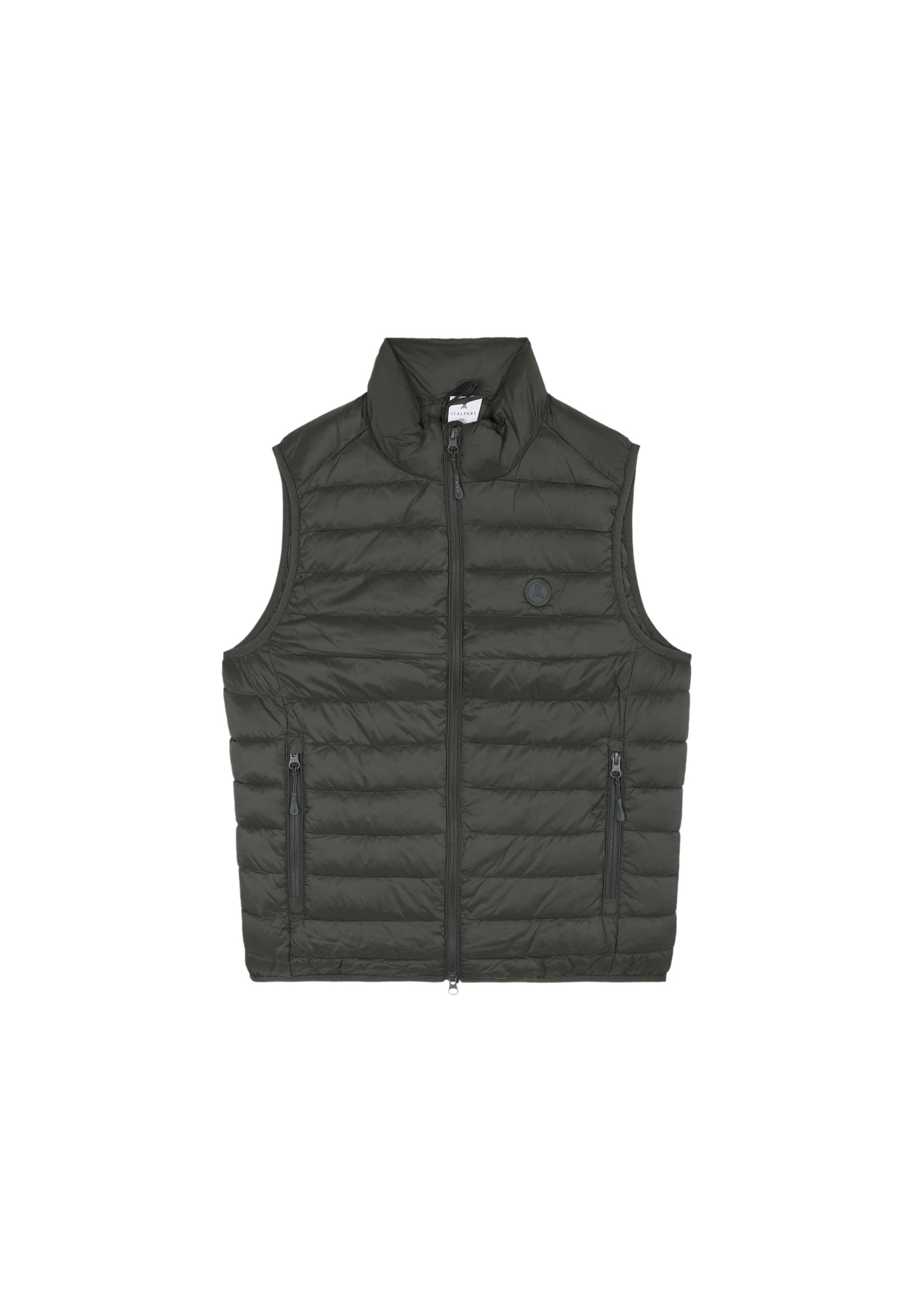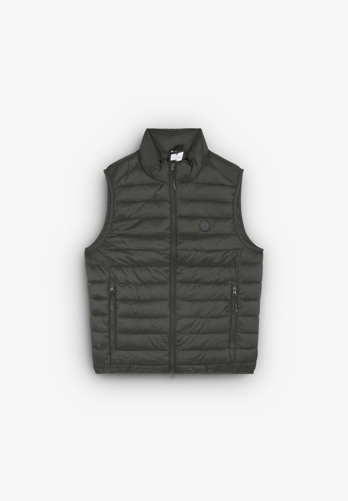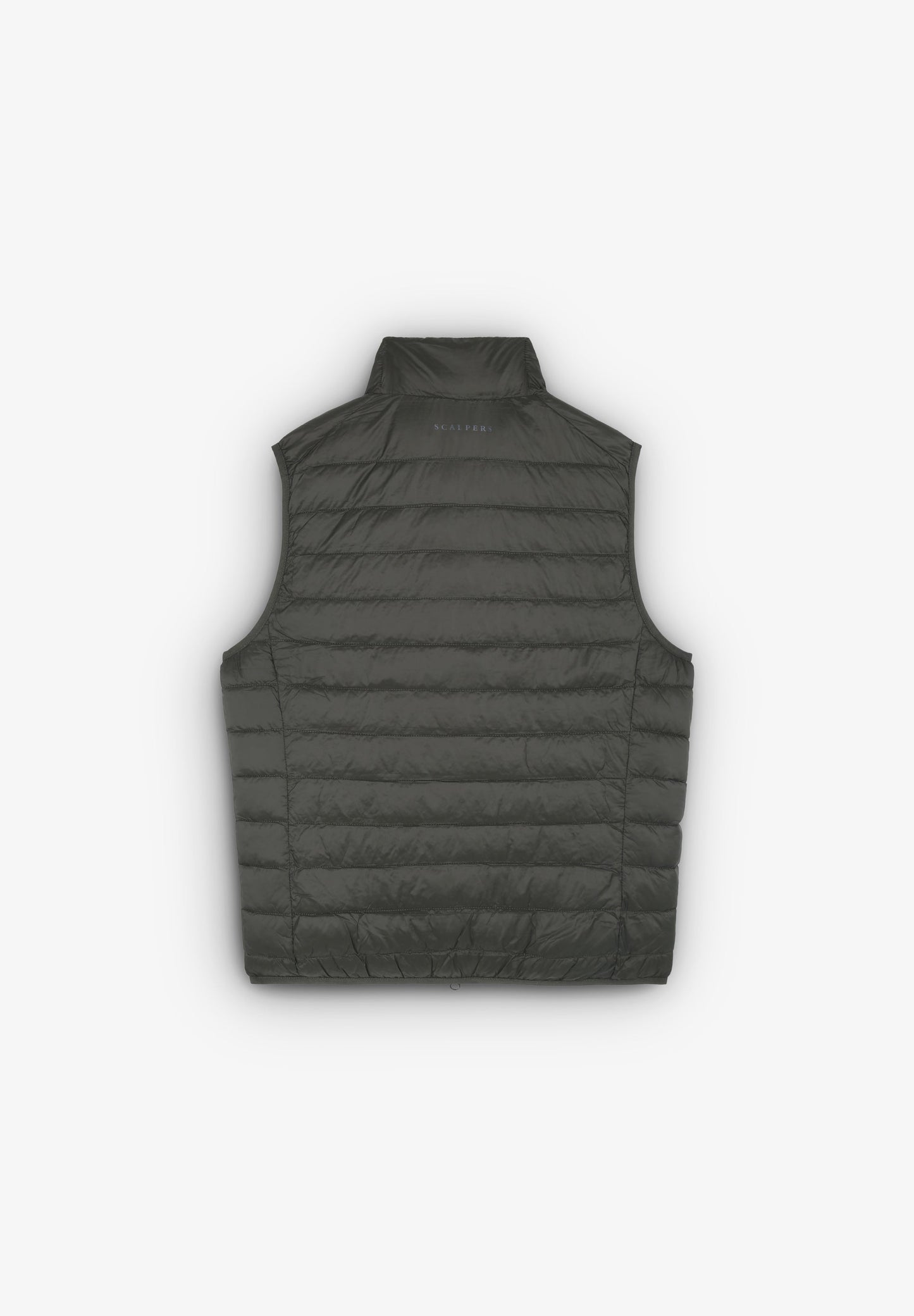 Parka acolchado confeccionado en tejido de nailon y poliéster reciclado water repellent. Corte Slim Fit, cuello subido y cierre con cremallera de doble carro. Sin mangas con sisa elástica. Bolsillos con cremallera y bolsillo interior. Detalle de parche de goma en pecho.