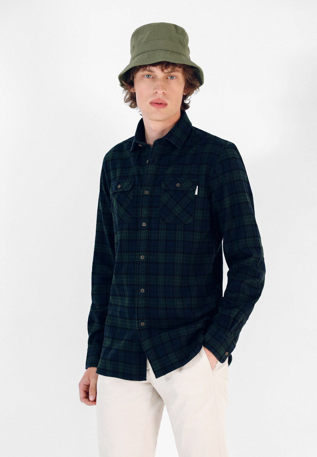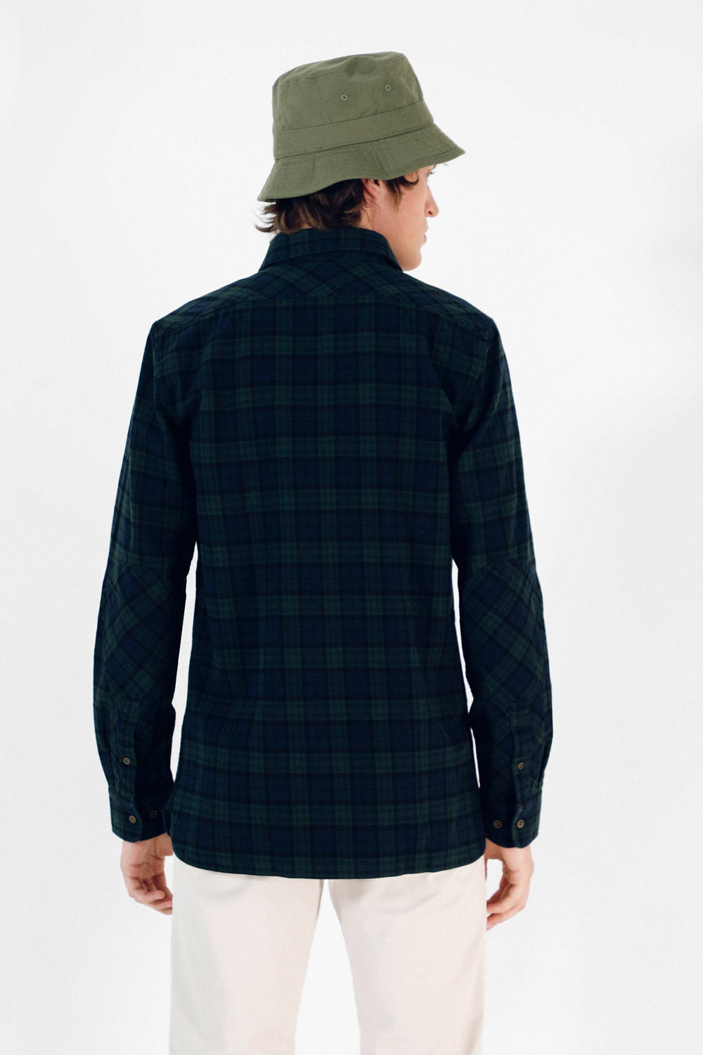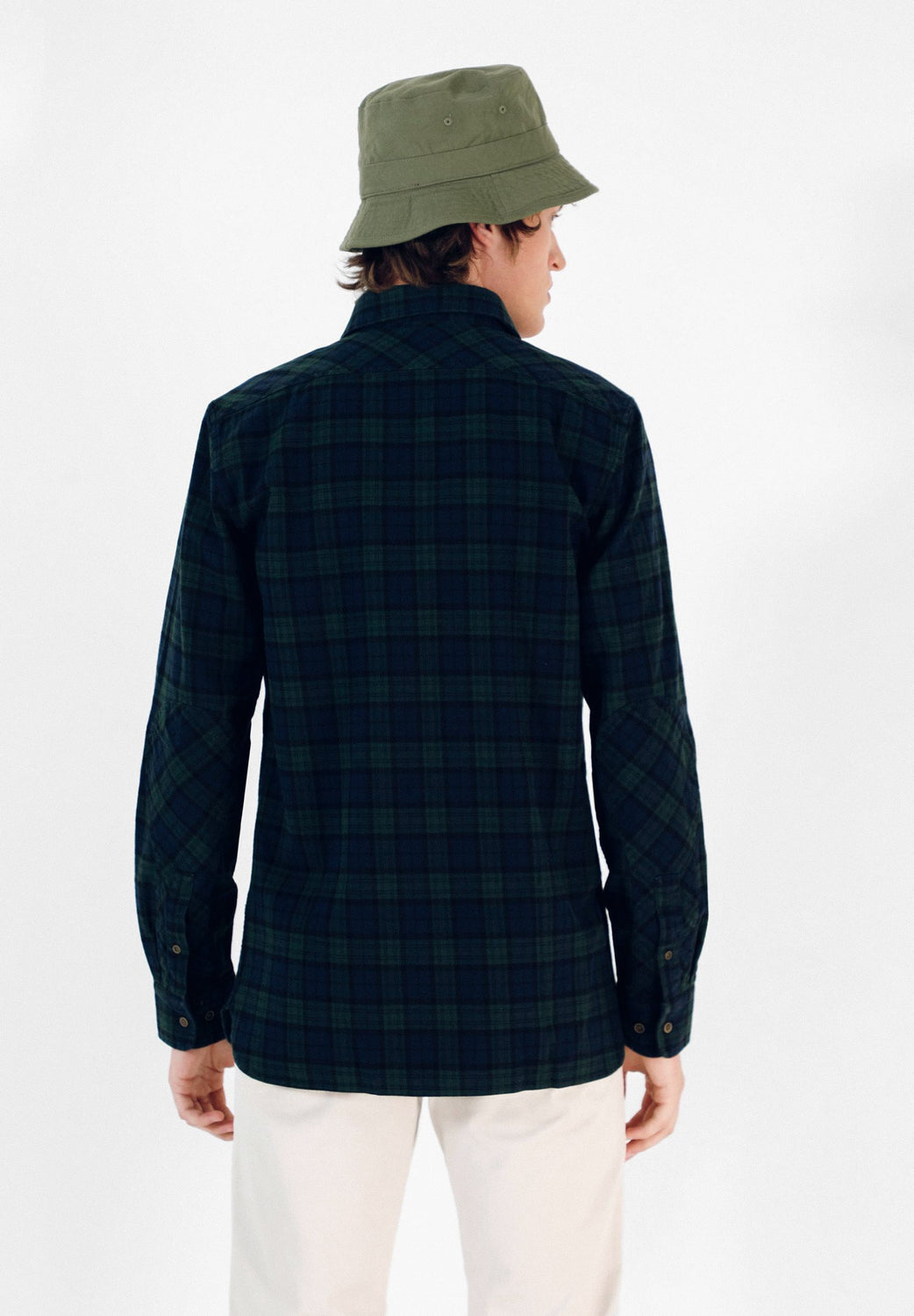 Camisa de cuadros confeccionada en tejido 100% algodón orgánico. Corte Regular Fit, cuello italiano y cierre con botones. Manga larga terminada en puño. Bolsillos de plastrón con tapeta y botón.