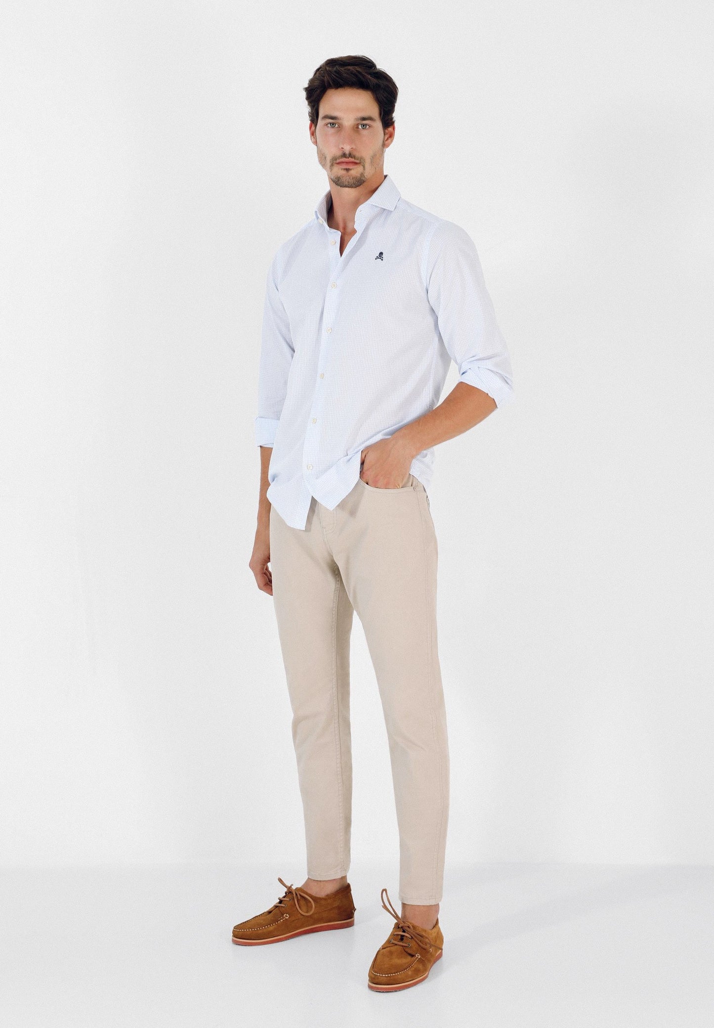 Camisa de cuadros mini confeccionada en tejido 100% algodón. Corte Regular Fit, cuello cutaway y cierre con botones. Manga larga terminada en puño simple y detalle de calavera bordada en el pecho.