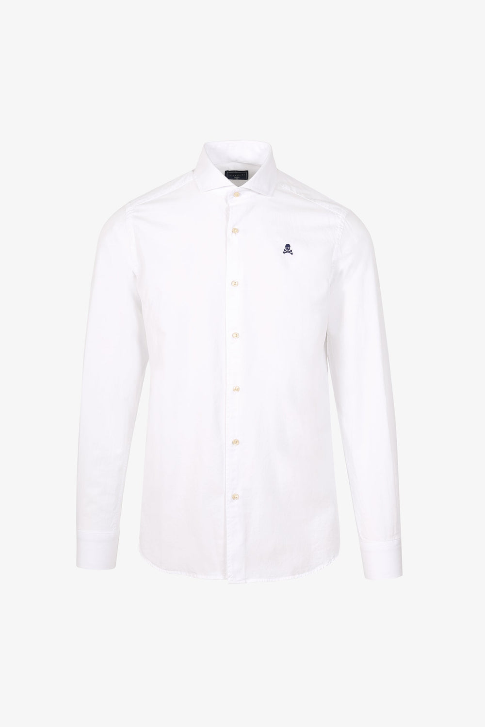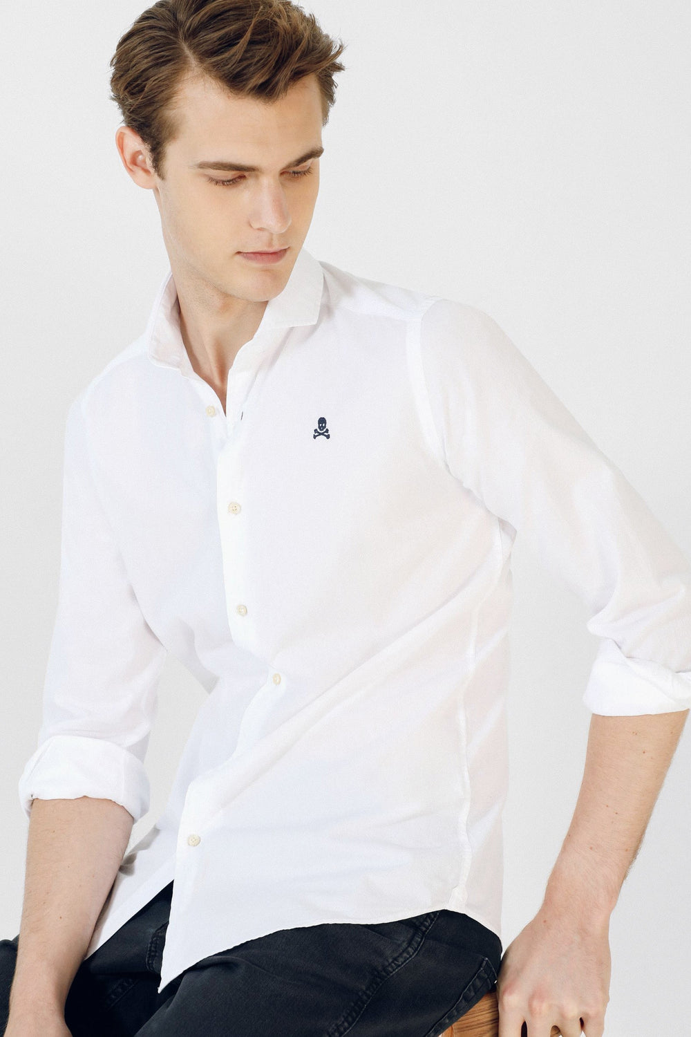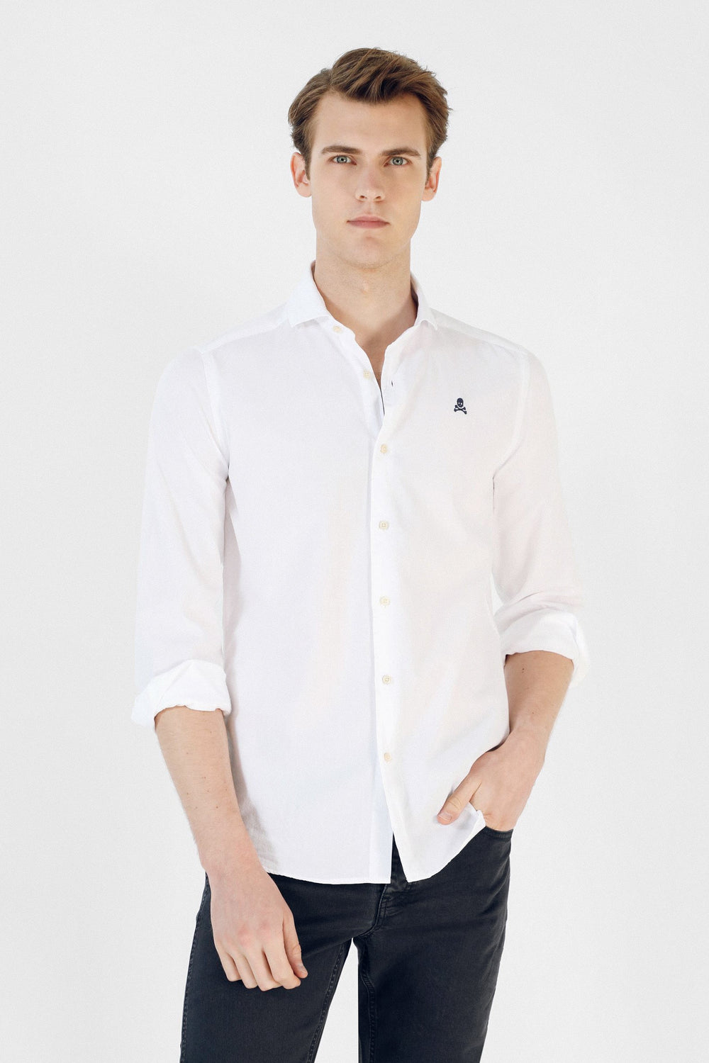 Camisa confeccionada en tejido 100% algodón con estructura. Corte Regular Fit, cuello cutaway y cierre con botones. Manga larga terminada en puño simple y detalle de calavera bordada en el pecho.