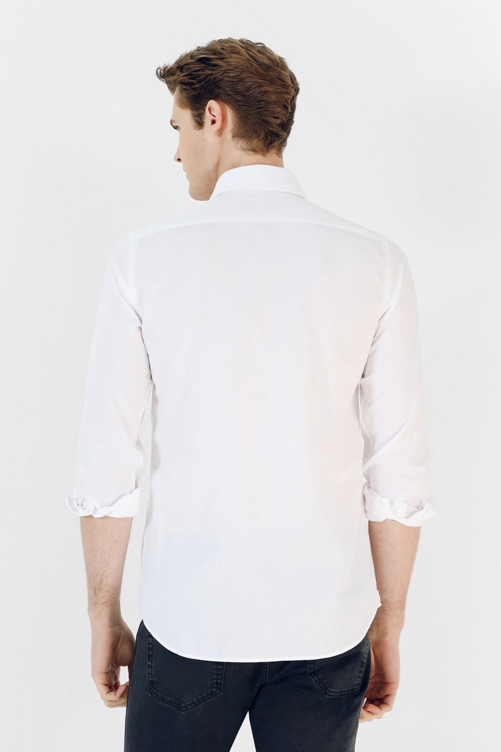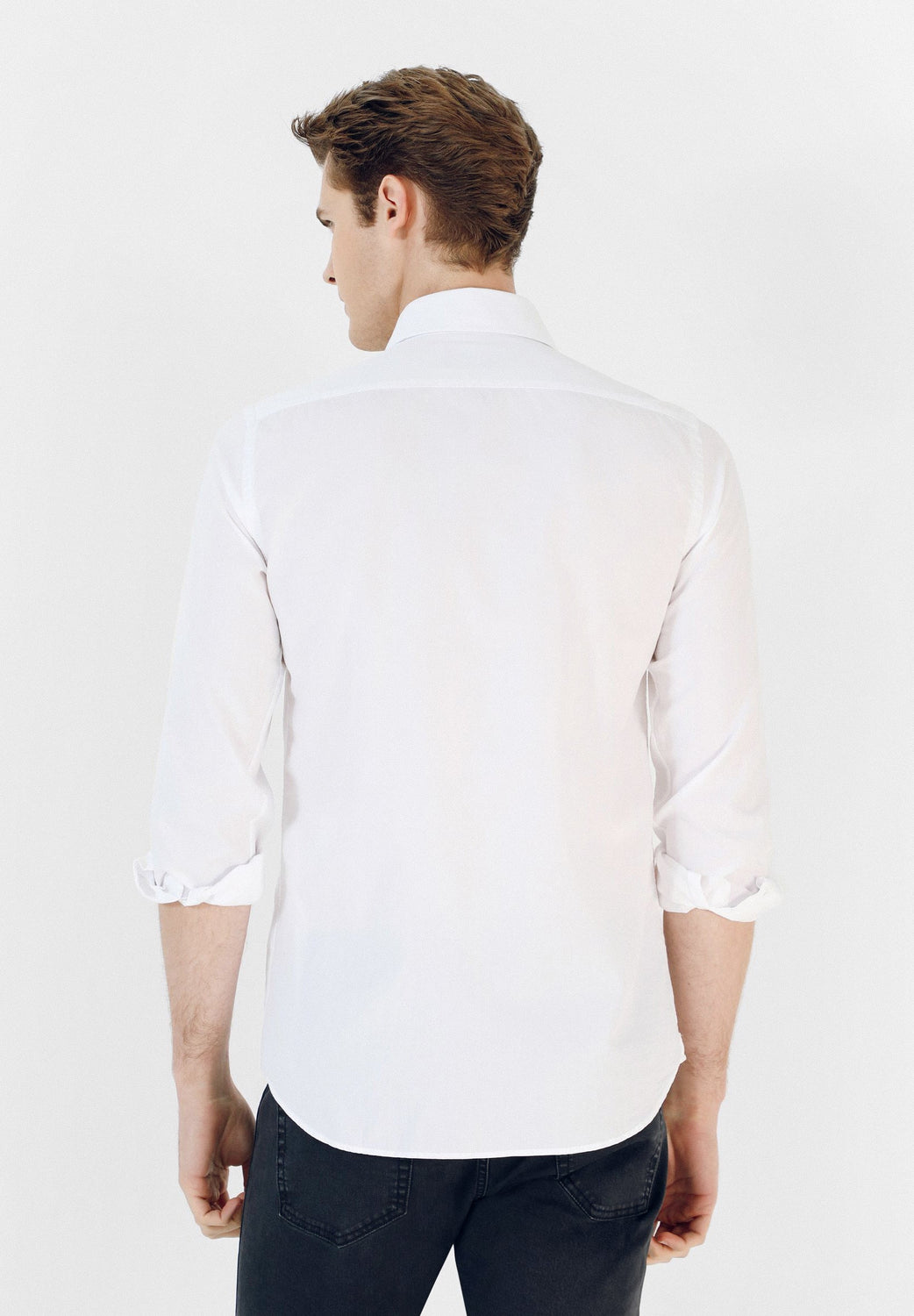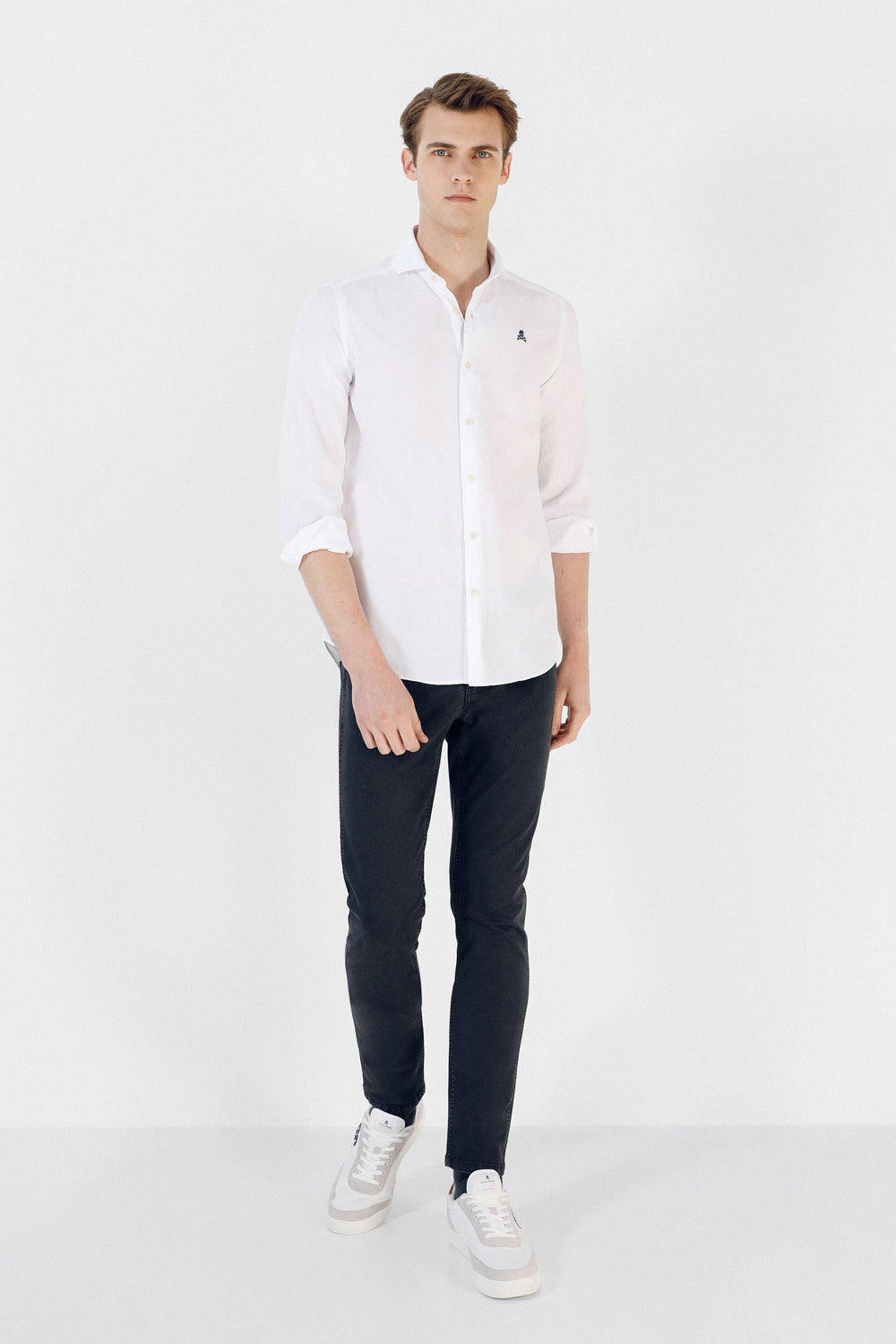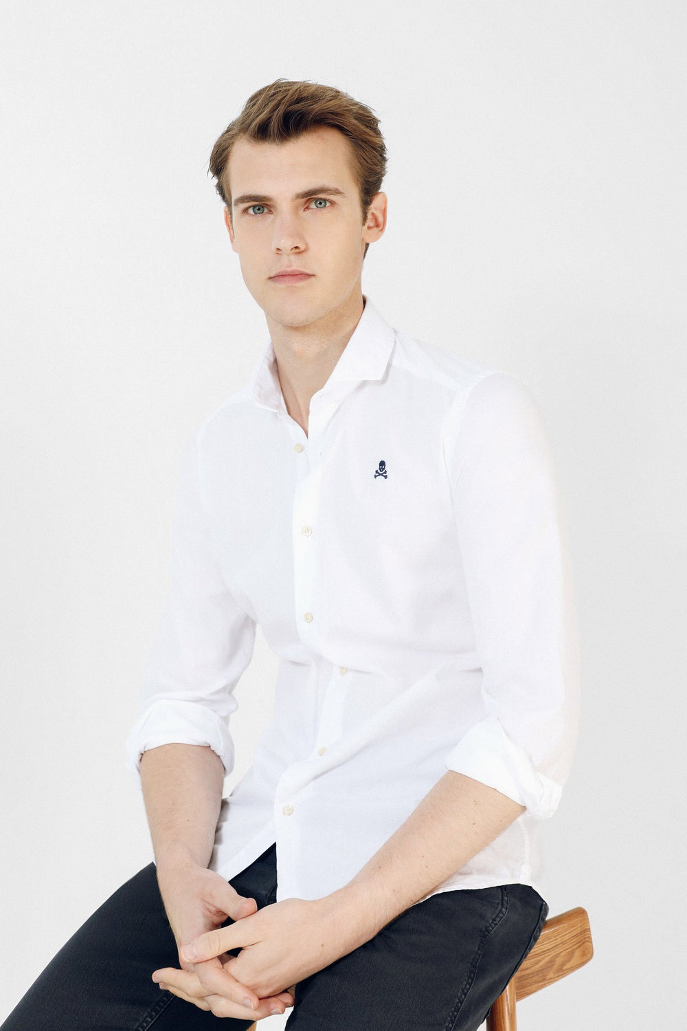 Camisa confeccionada en tejido 100% algodón con estructura. Corte Regular Fit, cuello cutaway y cierre con botones. Manga larga terminada en puño simple y detalle de calavera bordada en el pecho.