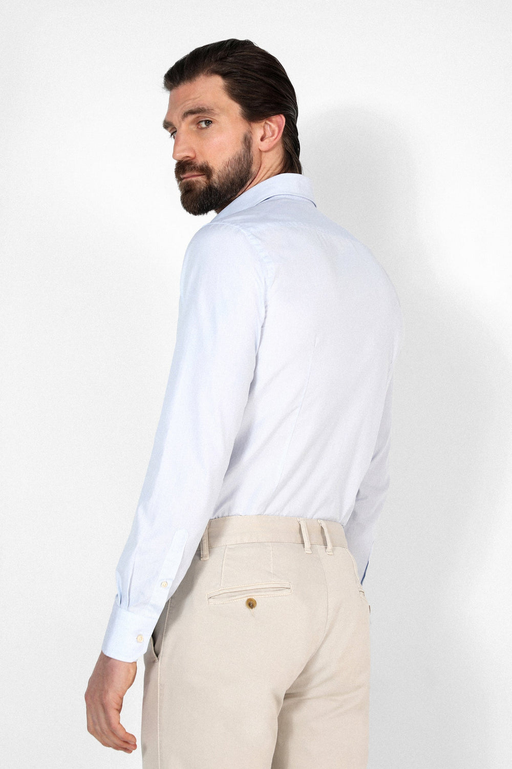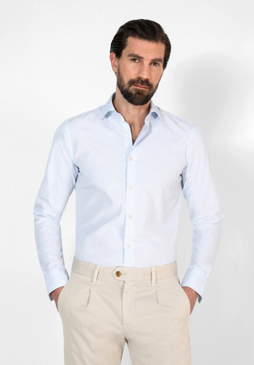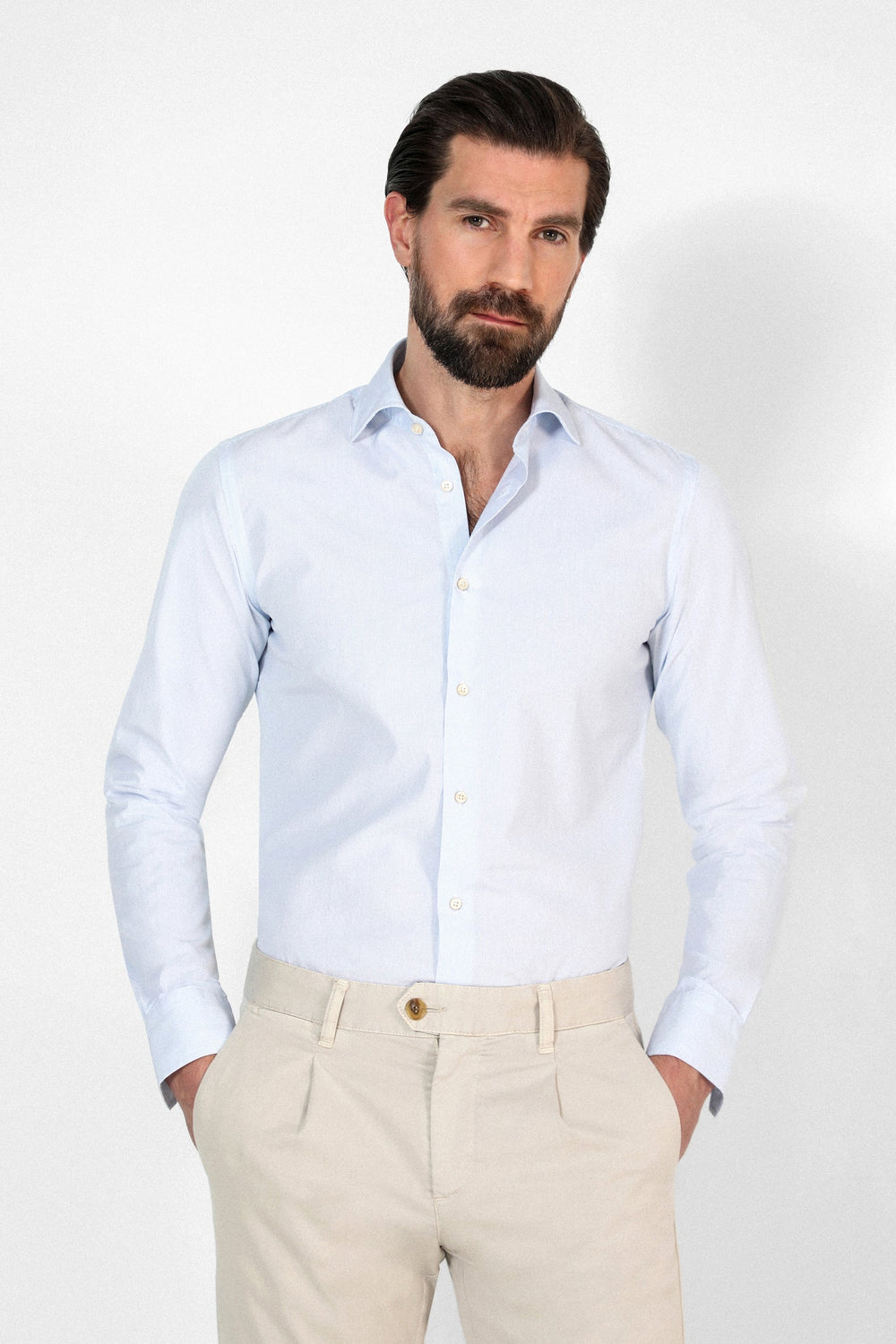 Camisa de vestir confeccionada en tejido 100% algodón. Corte Slim Fit, cuello clásico y cierre con botones. Manga larga terminada en puño con botones.