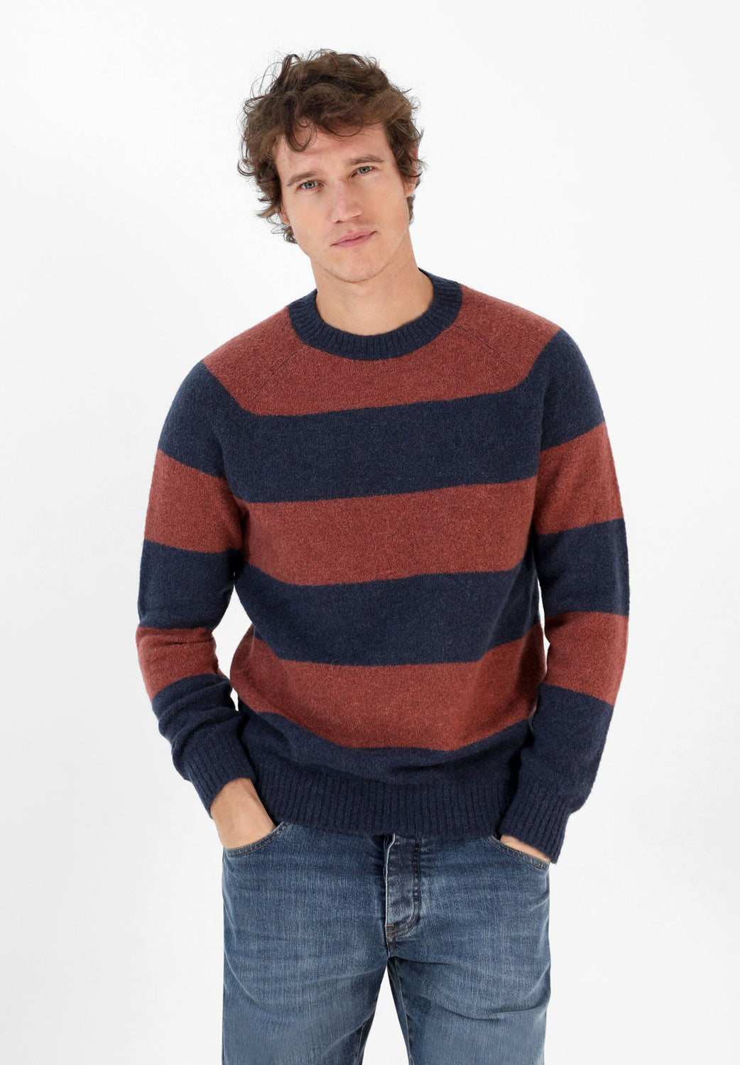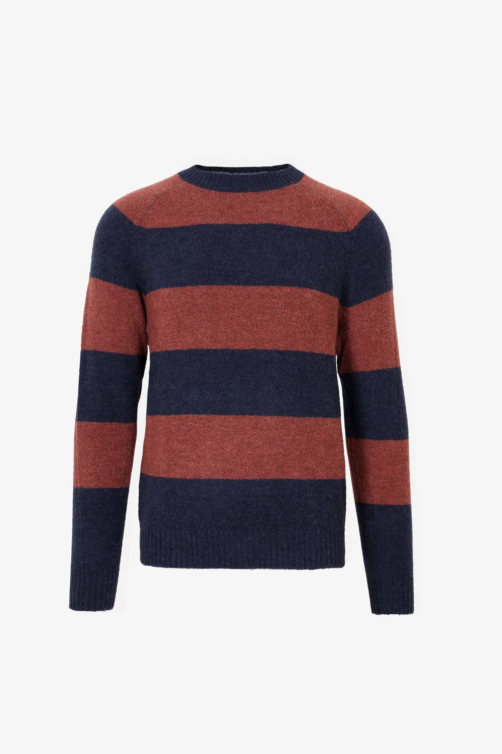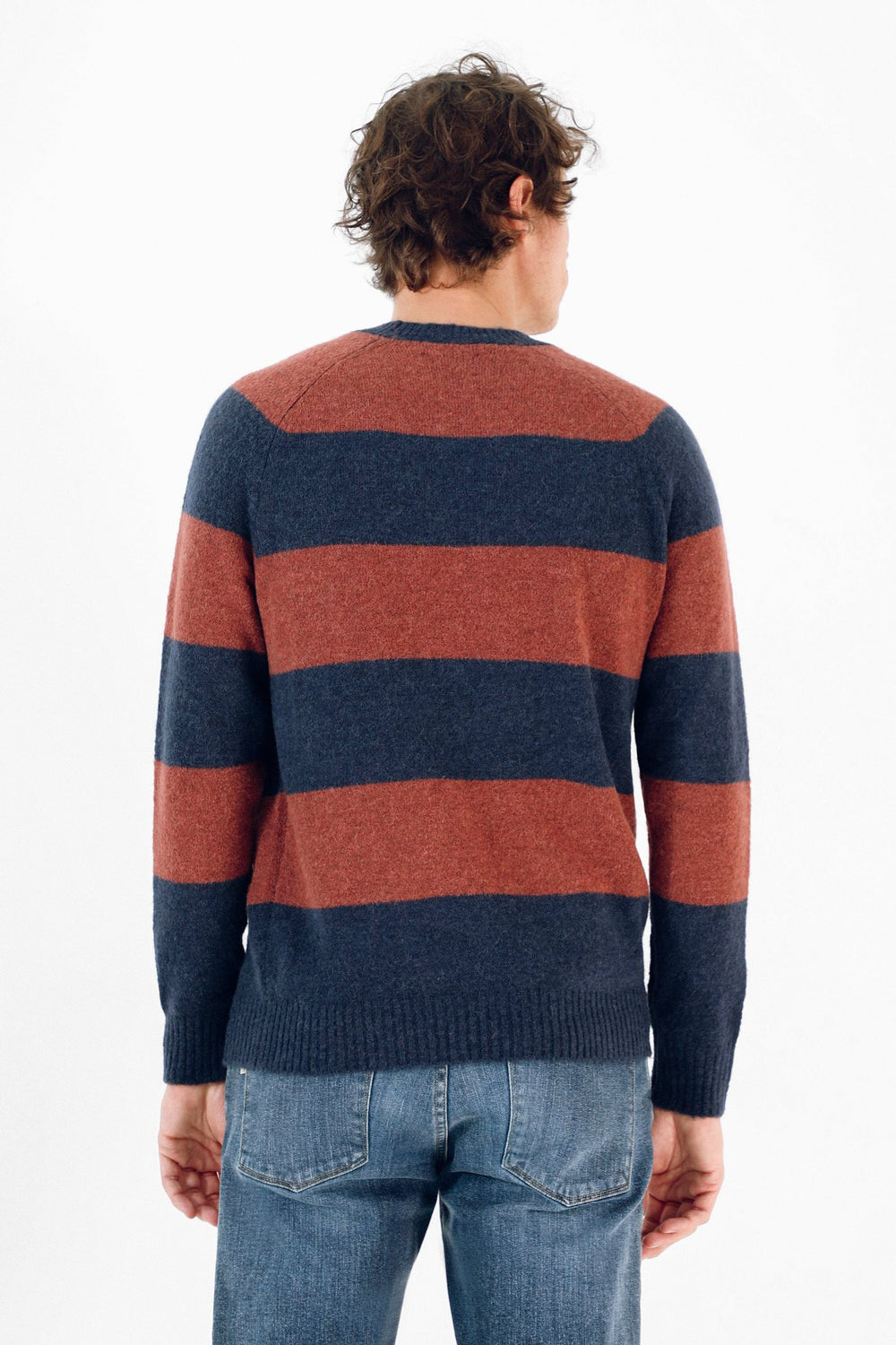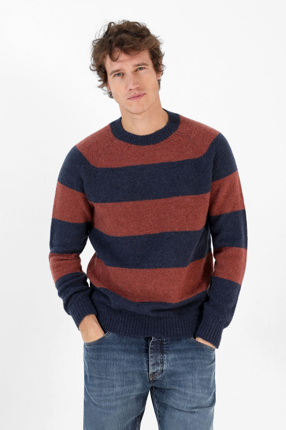 Jersey de rayas anchas confeccionada en tejido mezcla de lana y alpaca. Corte Regular Fit, cuello redondo y manga larga ranglan. Detalle de etiqueta latera
