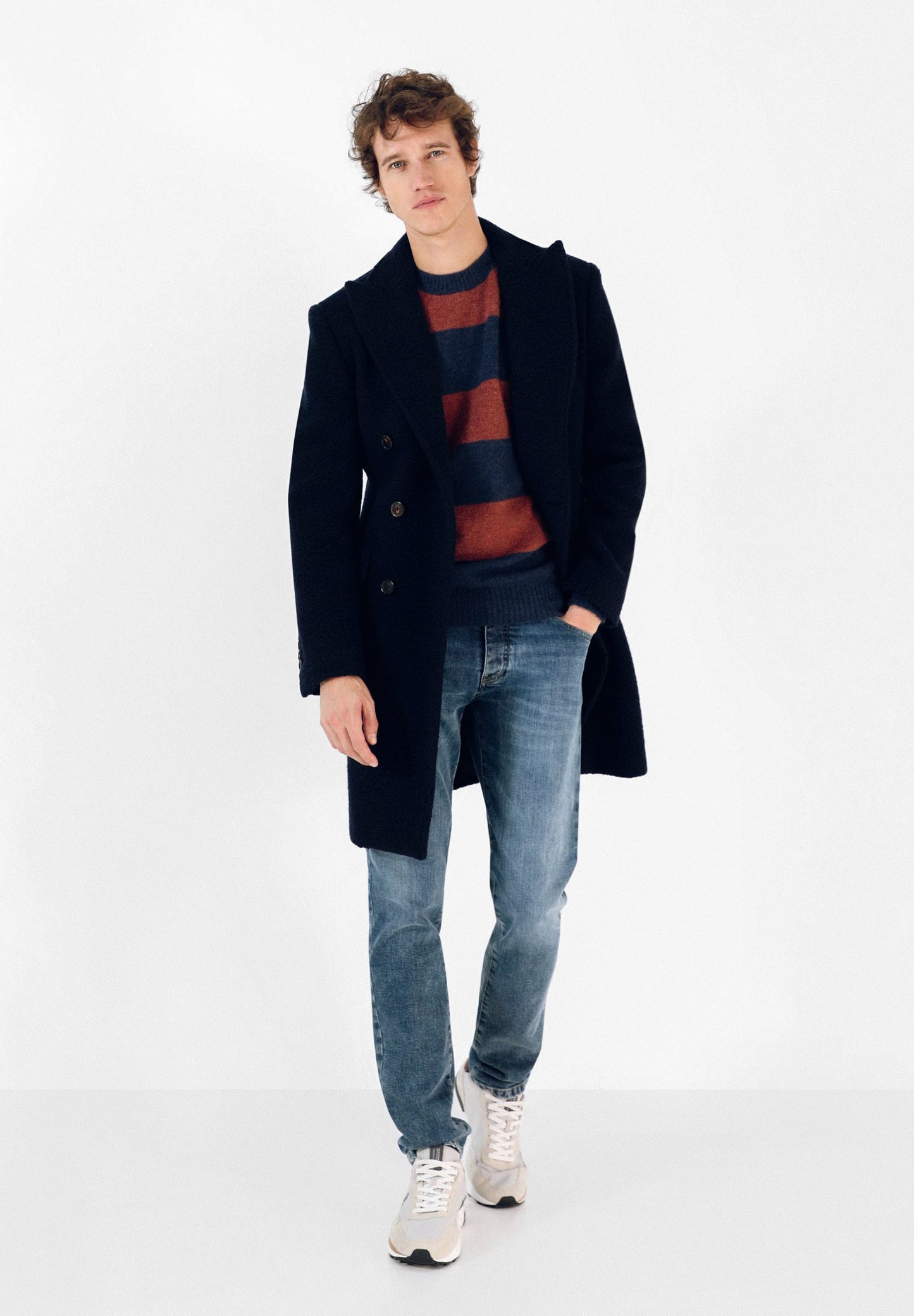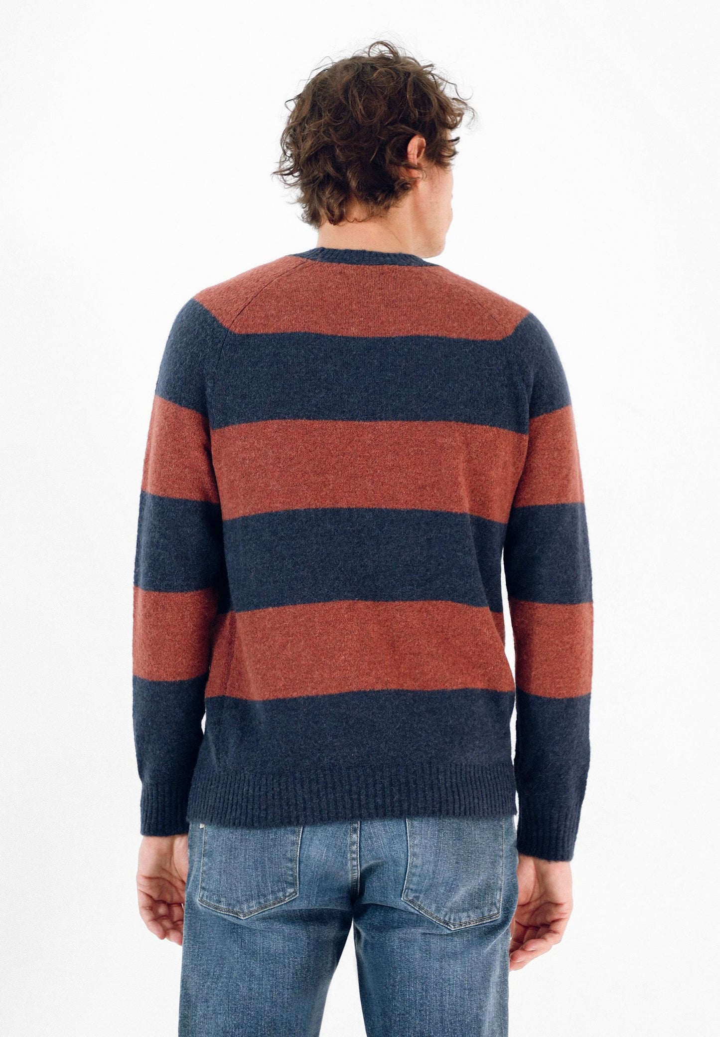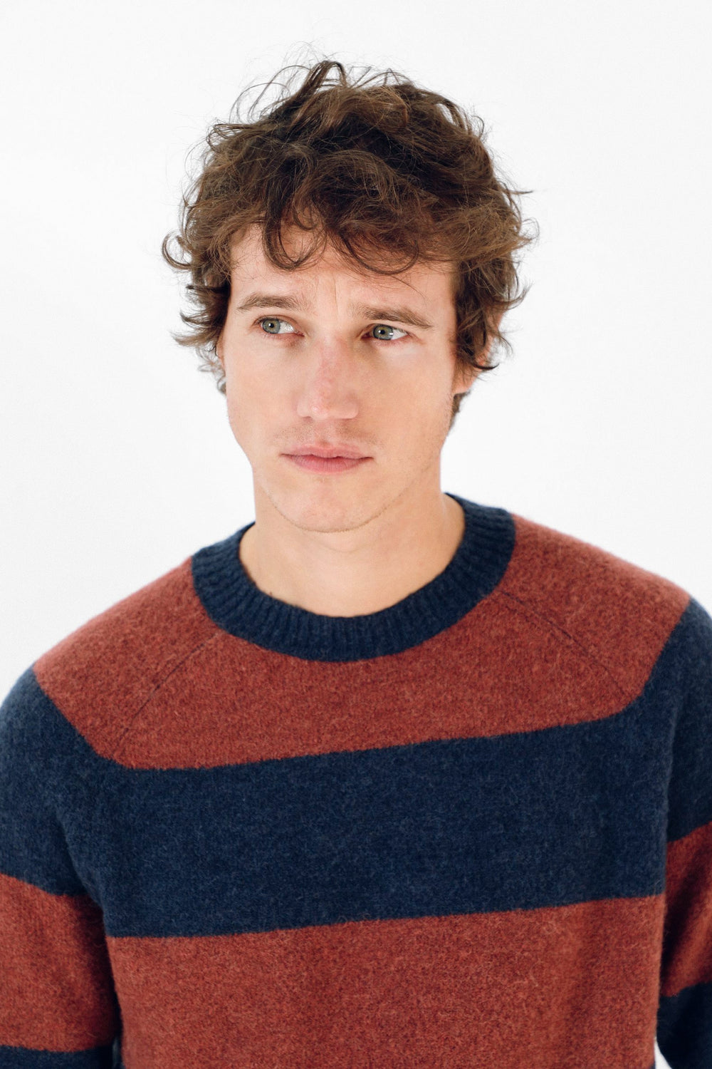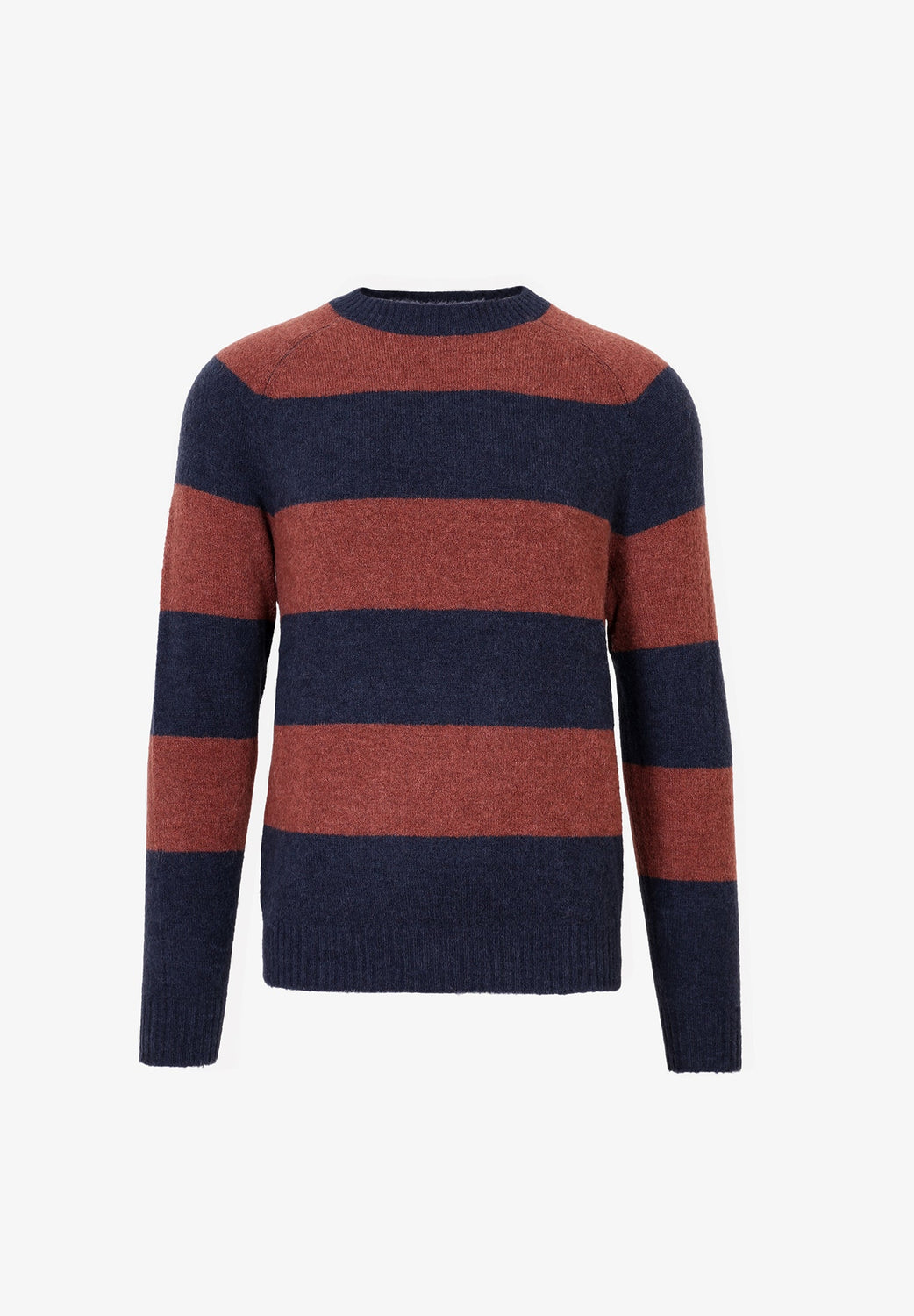 Jersey de rayas anchas confeccionada en tejido mezcla de lana y alpaca. Corte Regular Fit, cuello redondo y manga larga ranglan. Detalle de etiqueta latera