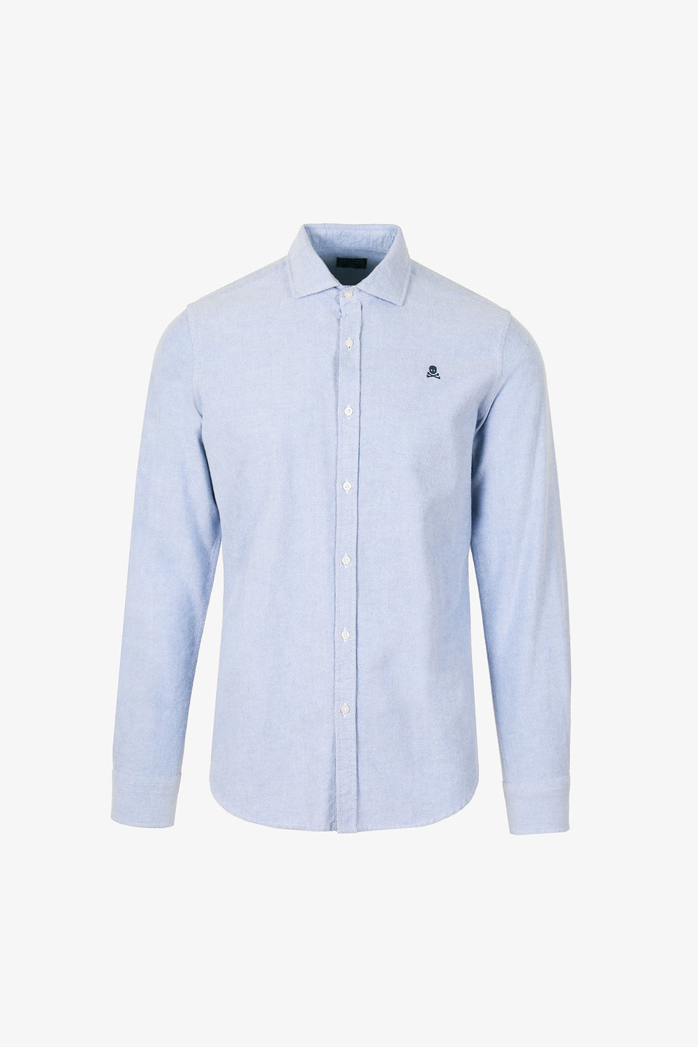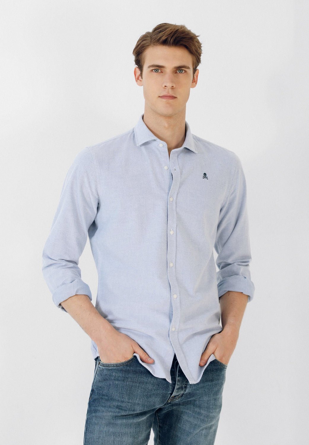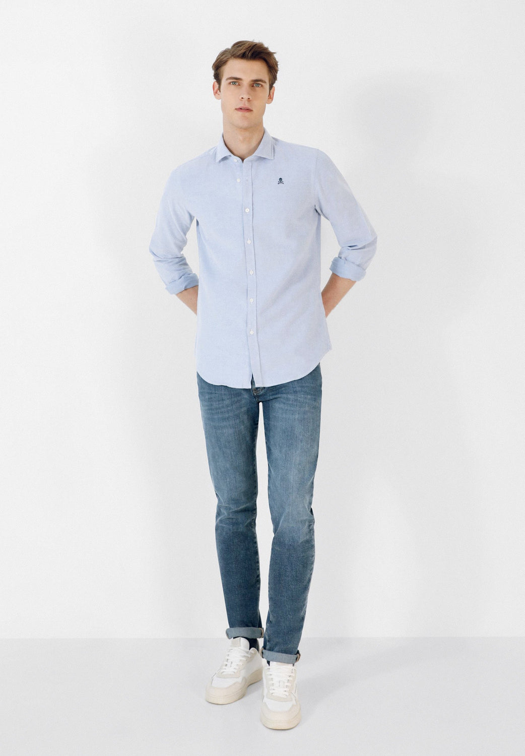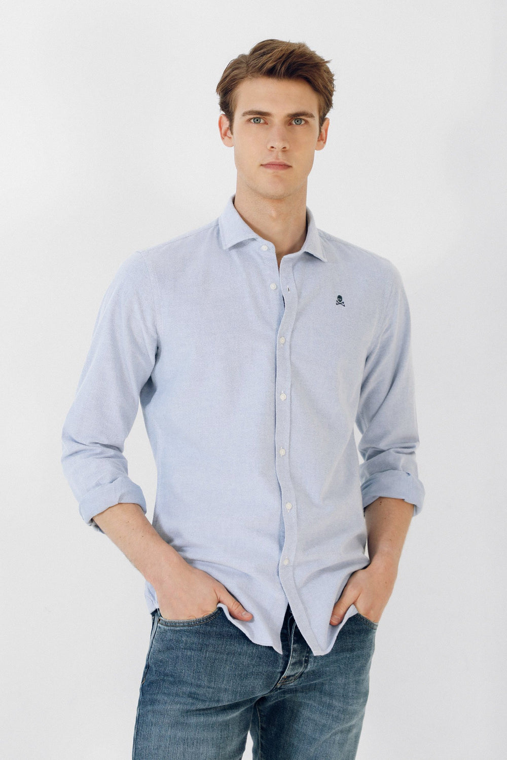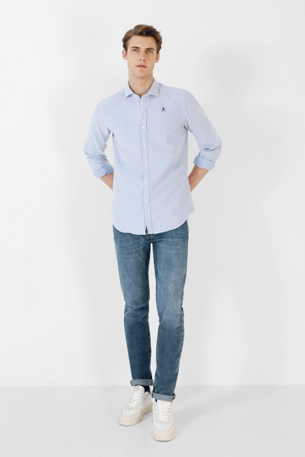 Camisa de rayas confeccionada en tejido oxford 100% algodón orgánico perchado. Corte Slim Fit, cuello italiano y cierre con botones. Manga larga terminada en puño con botones y detalle de calavera a contraste.