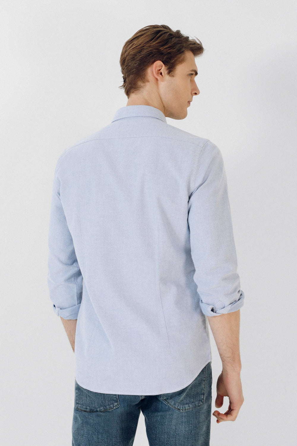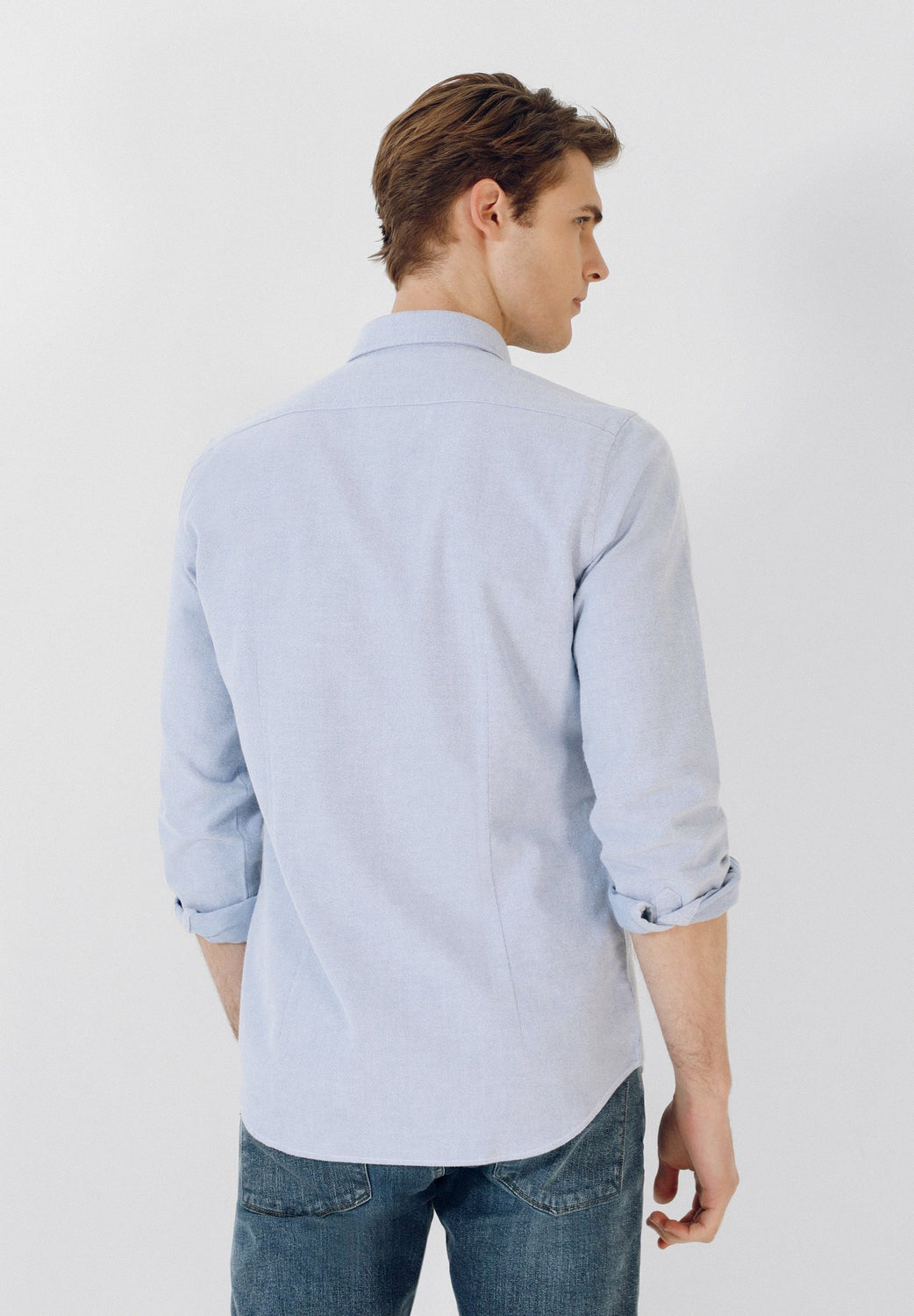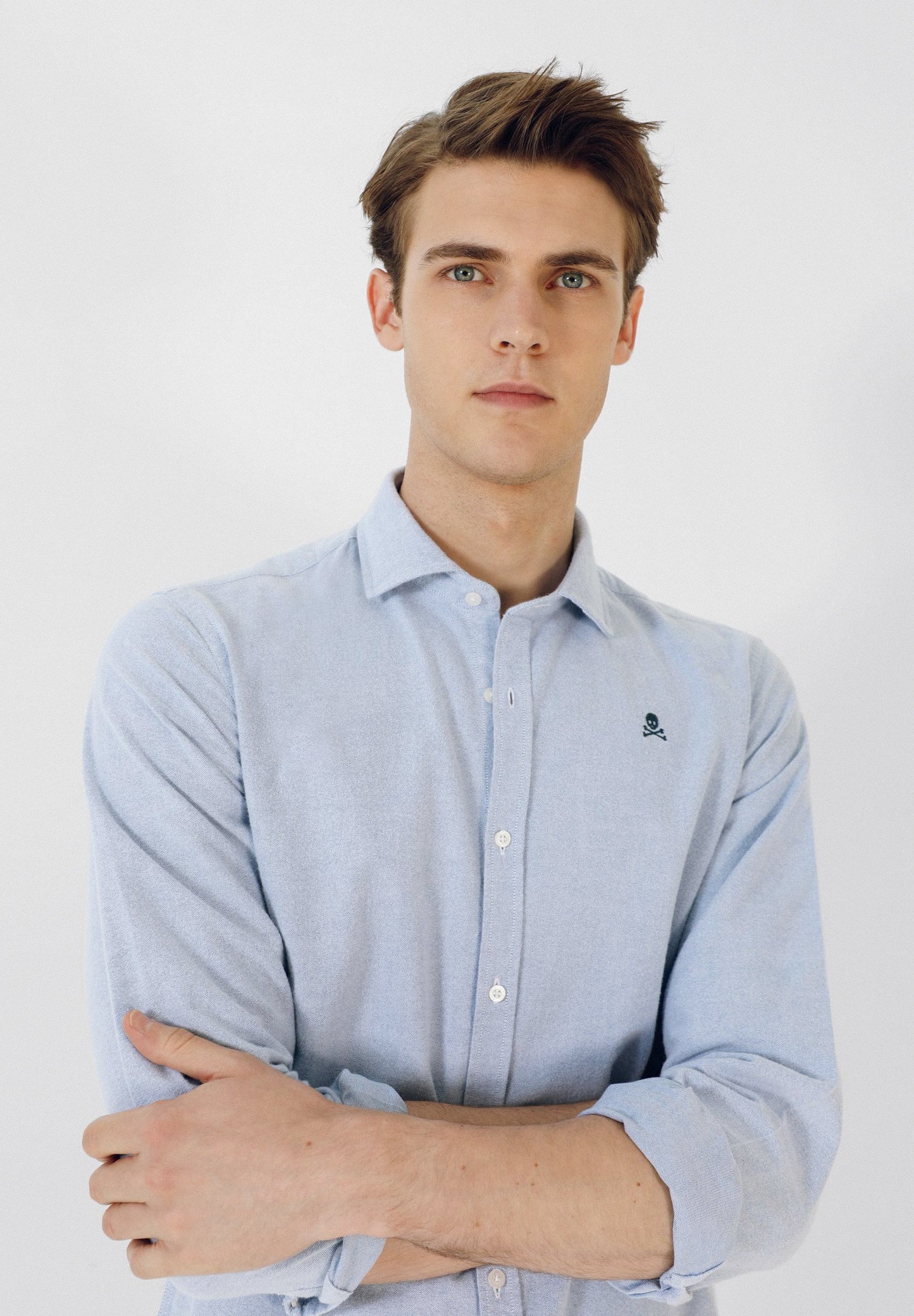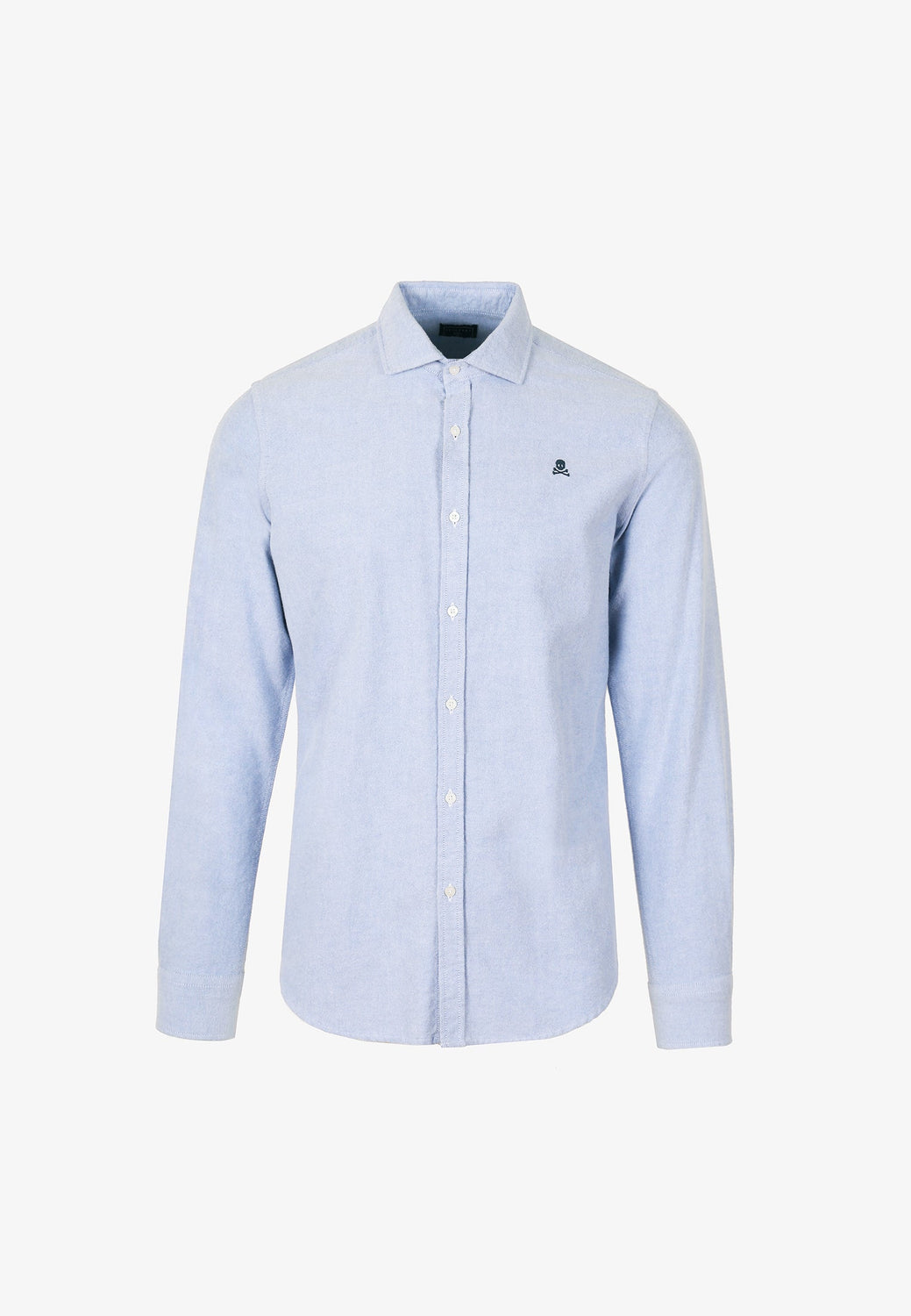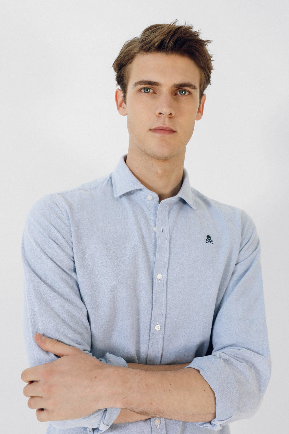 Camisa de rayas confeccionada en tejido oxford 100% algodón orgánico perchado. Corte Slim Fit, cuello italiano y cierre con botones. Manga larga terminada en puño con botones y detalle de calavera a contraste.