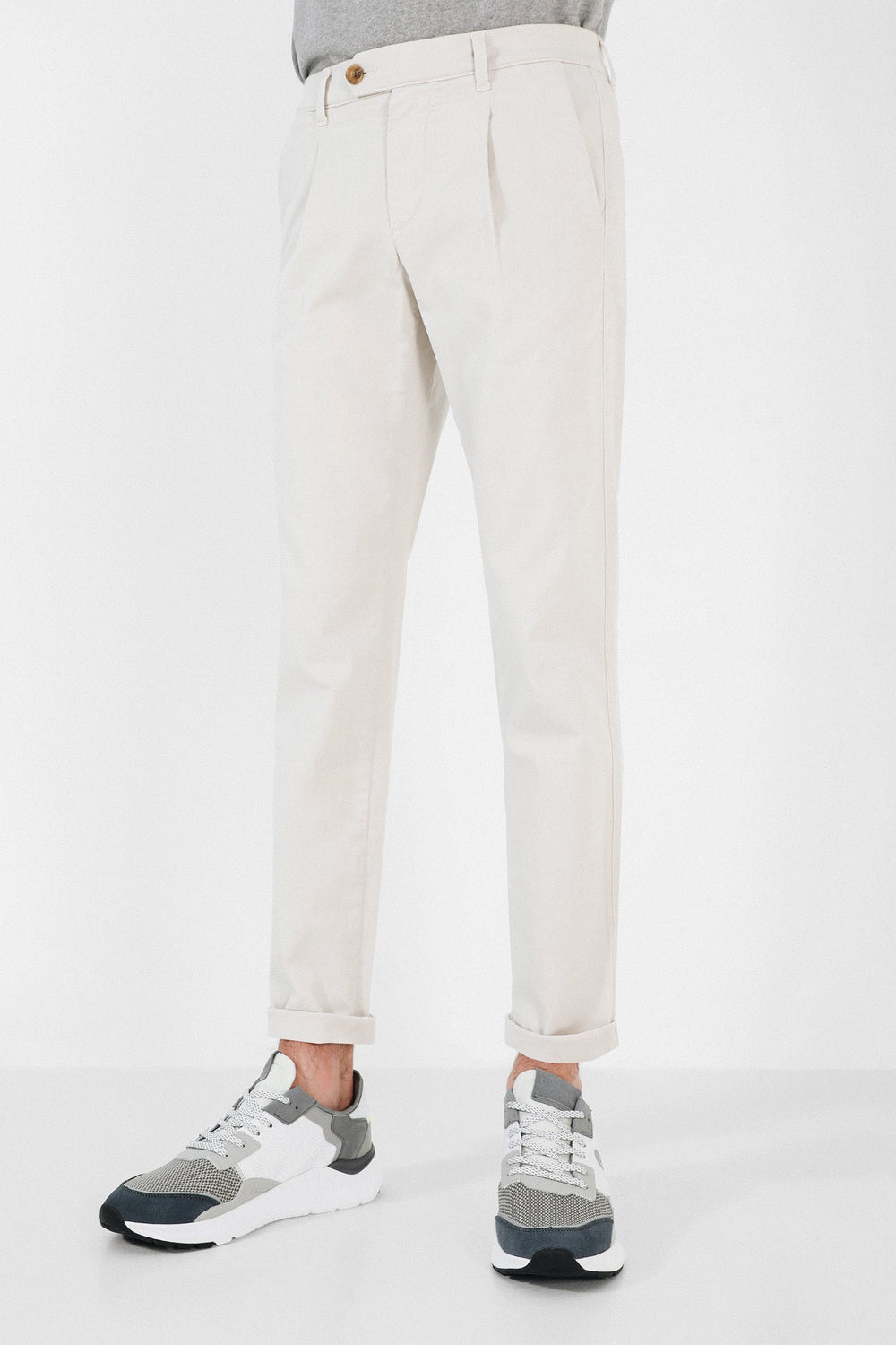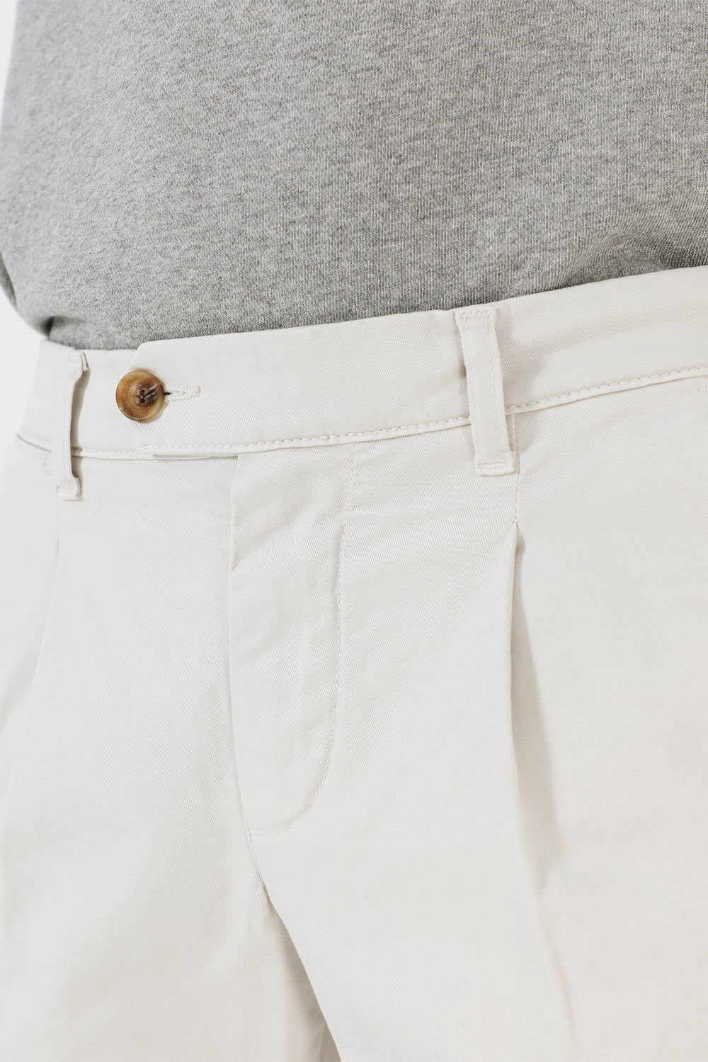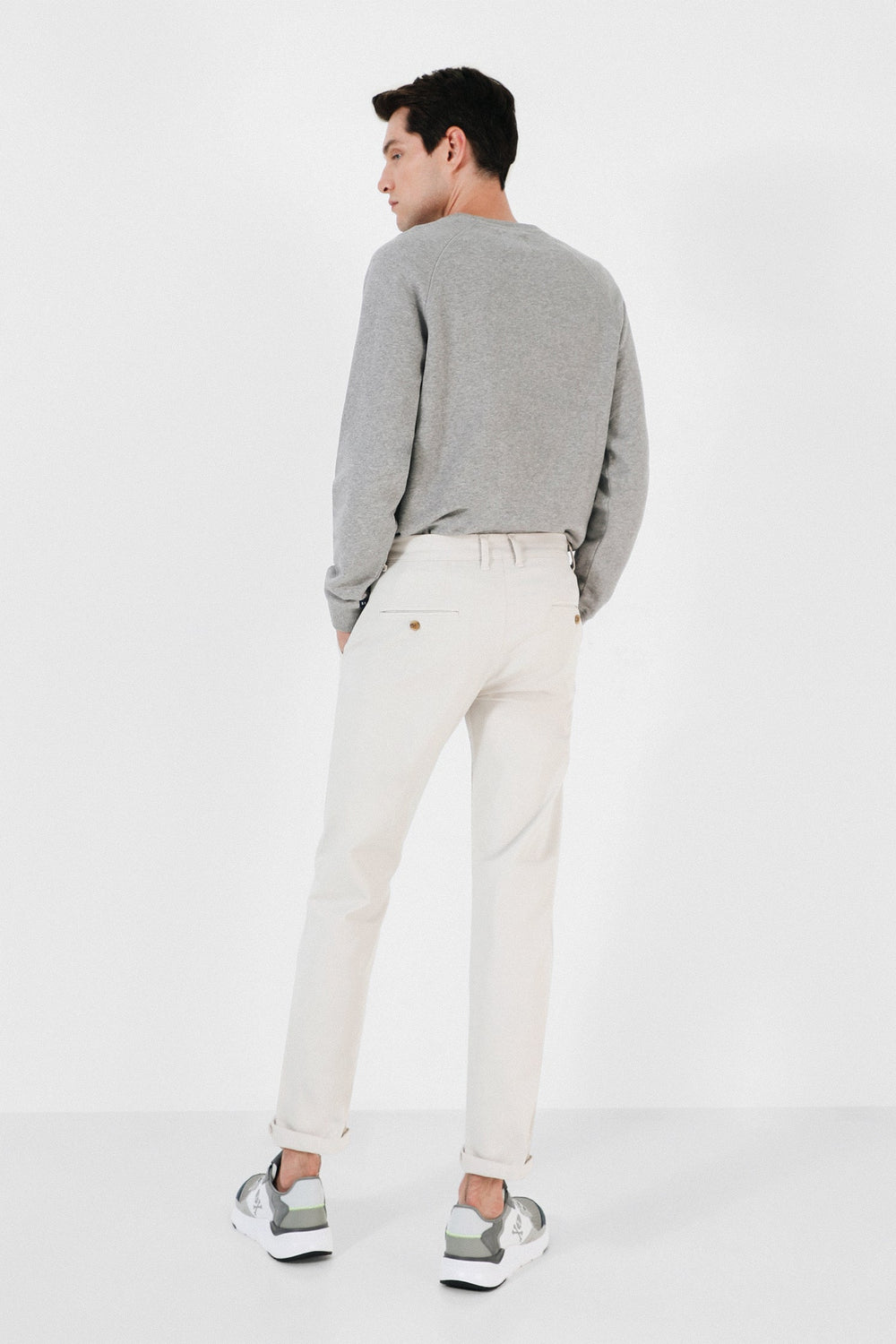 Pantalón chino confeccionado en tejido de algodón garment dyed. Corte Regular Fit con pinzas, cierre con cremallera oculta por tapeta y botón con cinturilla que prolonga. Bolsillos laterales y traseros. Tiene trabillas.
