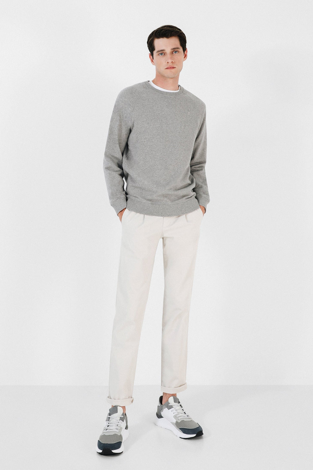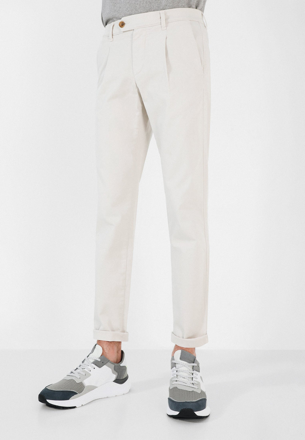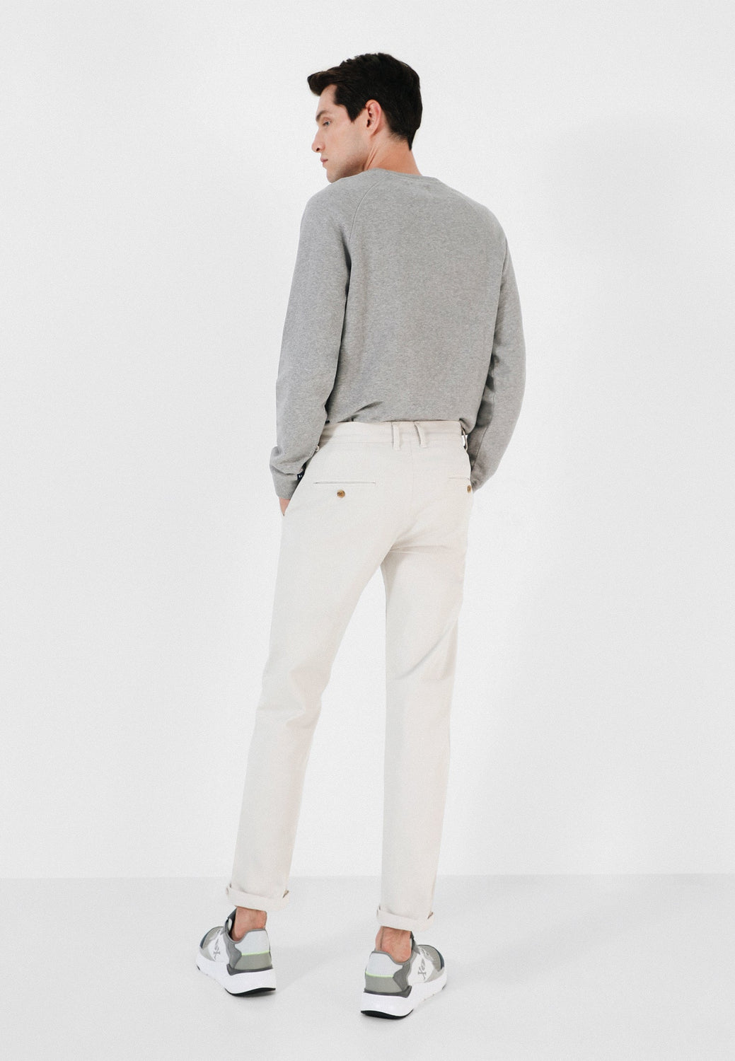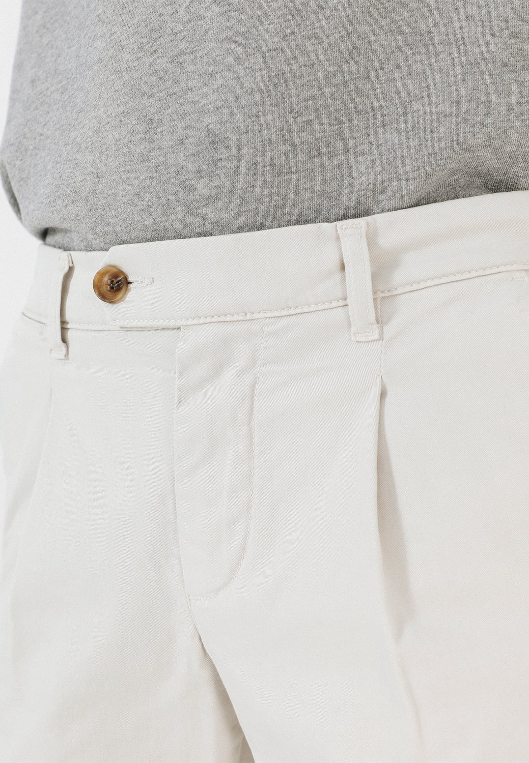 Pantalón chino confeccionado en tejido de algodón garment dyed. Corte Regular Fit con pinzas, cierre con cremallera oculta por tapeta y botón con cinturilla que prolonga. Bolsillos laterales y traseros. Tiene trabillas.