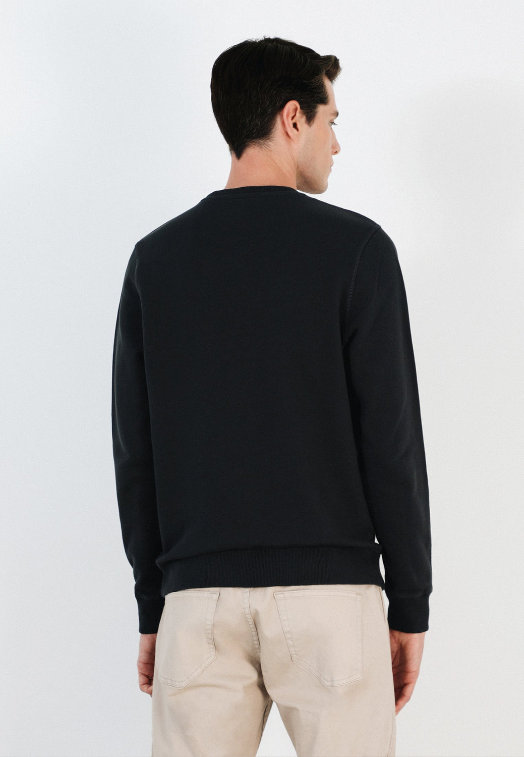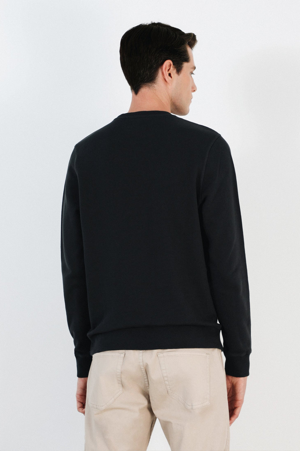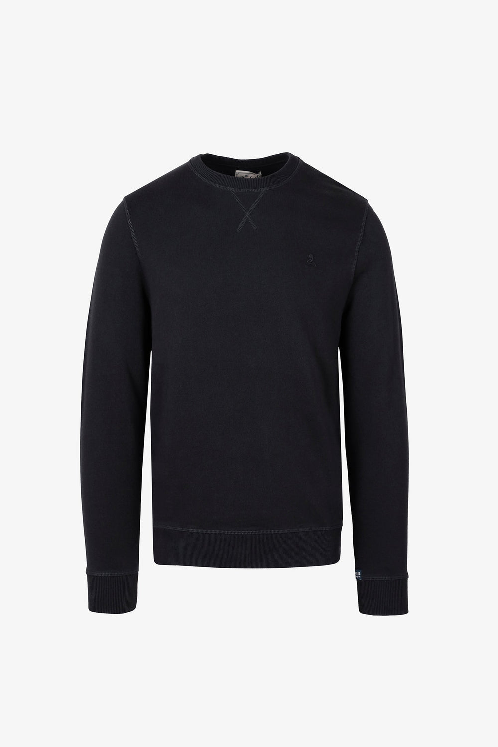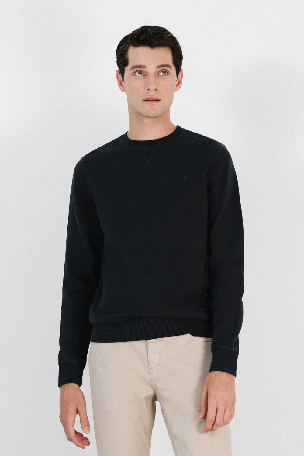 Sudadera confeccionada en tejido 100% algodón orgánico con lavado stone wash. Corte Regular Fit, cuello redondo y manga larga terminada en rib. Detalle de cosido en cruz en el cuello, etiqueta decorativa en puño y calavera bordada a tono en el pecho.