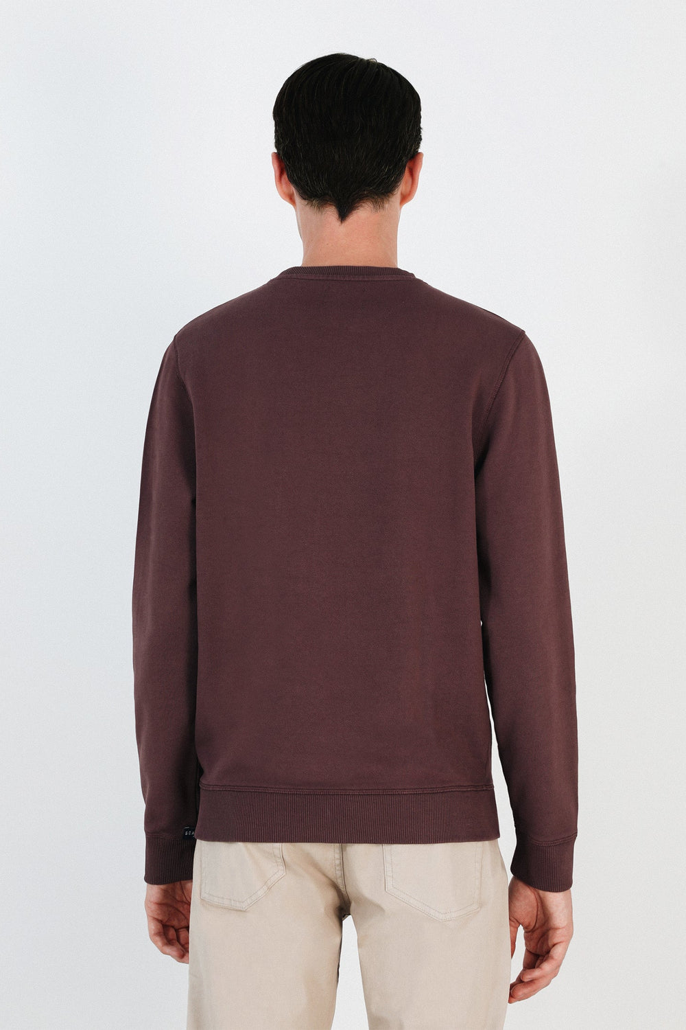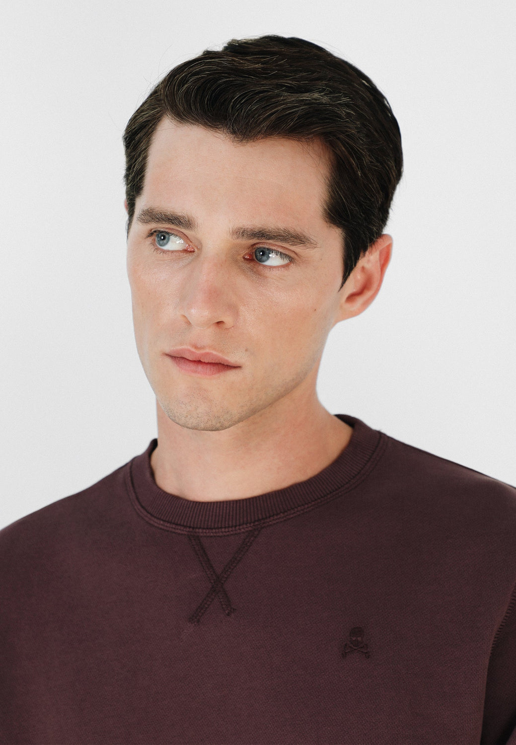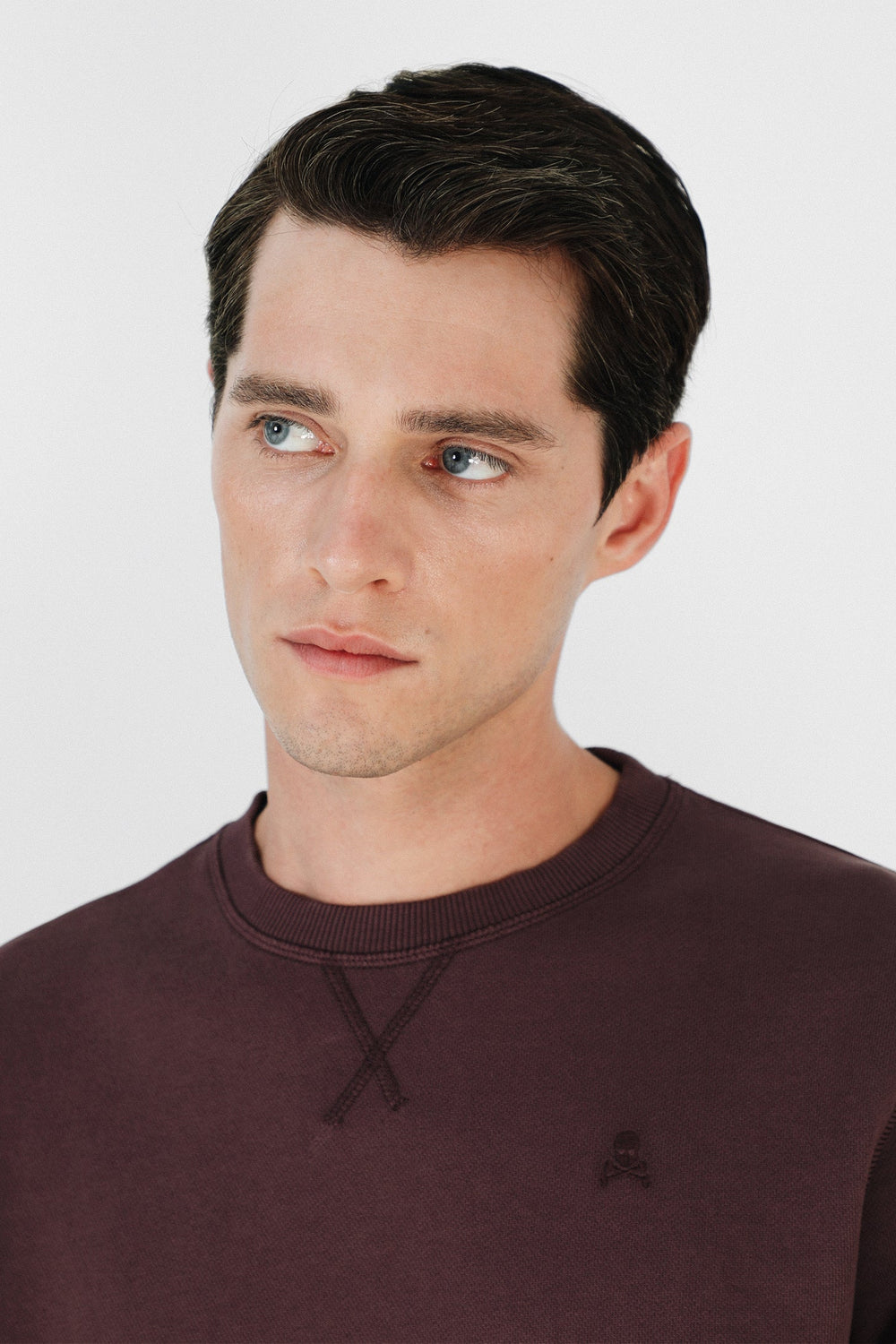 Sudadera confeccionada en tejido 100% algodón orgánico con lavado stone wash. Corte Regular Fit, cuello redondo y manga larga terminada en rib. Detalle de cosido en cruz en el cuello, etiqueta decorativa en puño y calavera bordada a tono en el pecho.