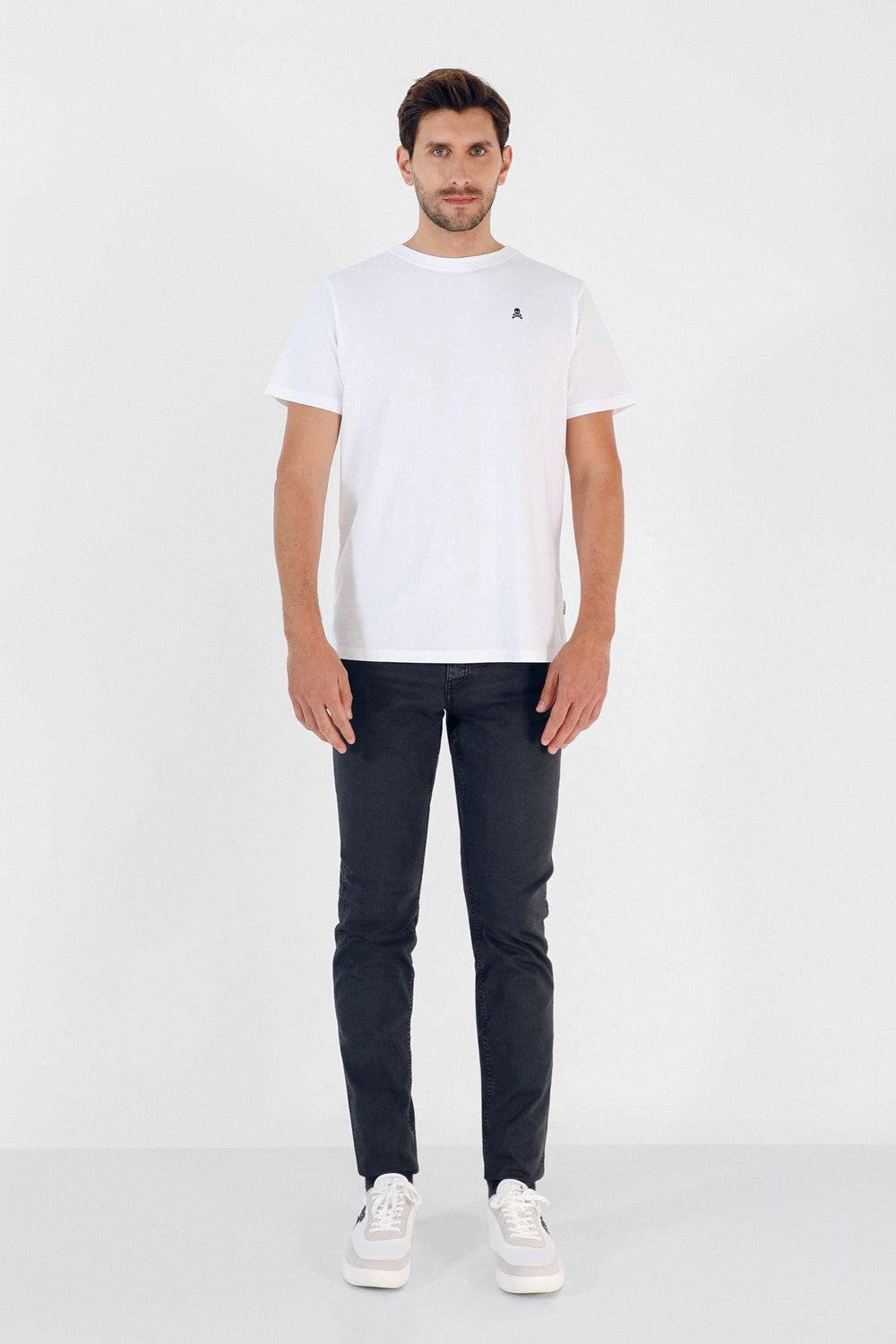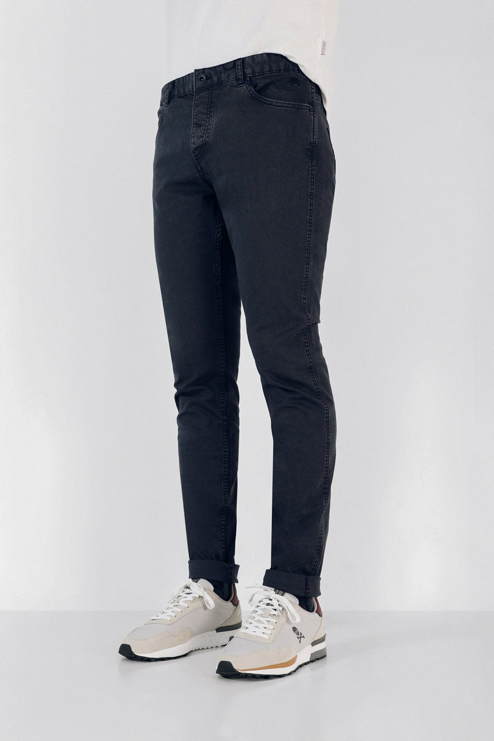 Pantalón confeccionado en tejido de algodón garment dyed. Corte Slim Fit, cierre con botón y cremallera. Cinco bolsillos y trabillas Logo bordado en el bolsillo.