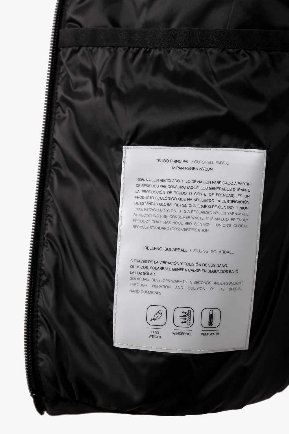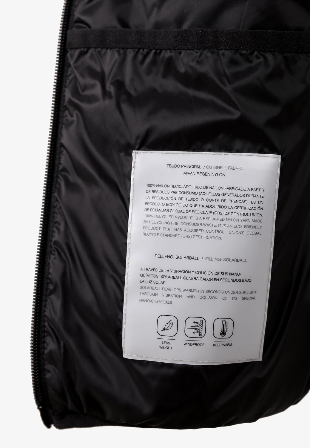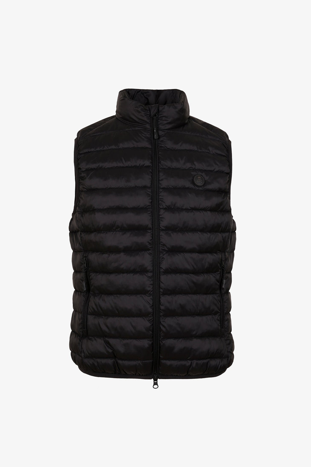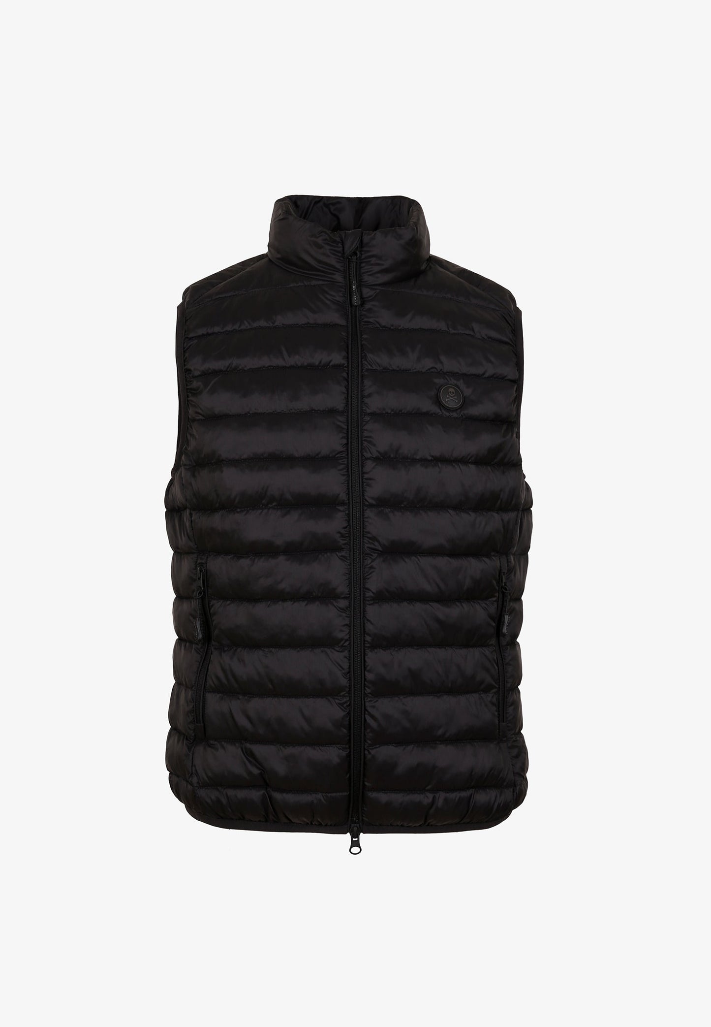 Chaleco acolchado confeccionado en tejido de nailon y poliéster reciclado water repellent. Corte Slim Fit, cuello subido y cierre con cremallera de doble carro. Sin mangas con sisa elástica. Bolsillos con cremallera y bolsillo interior. Detalle de parche de goma en pecho. Incluye bolsa para guardarlo.