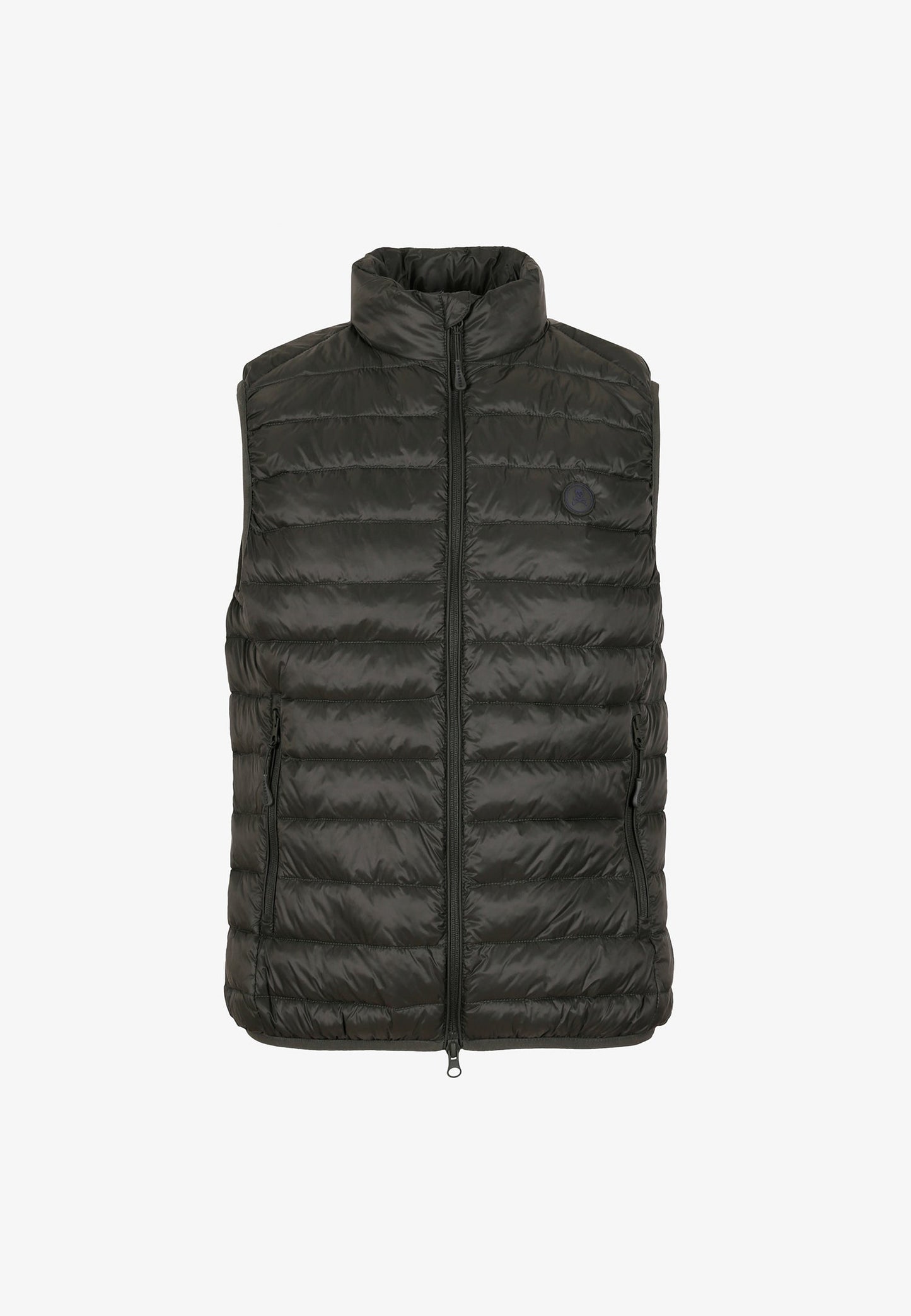 Chaleco acolchado confeccionado en nailon con relleno de poliéster reciclado. Corte Slim Fit, cuello subido y cierre con cremallera de doble carro. Bolsillos laterales y detalle de parche de calavera.