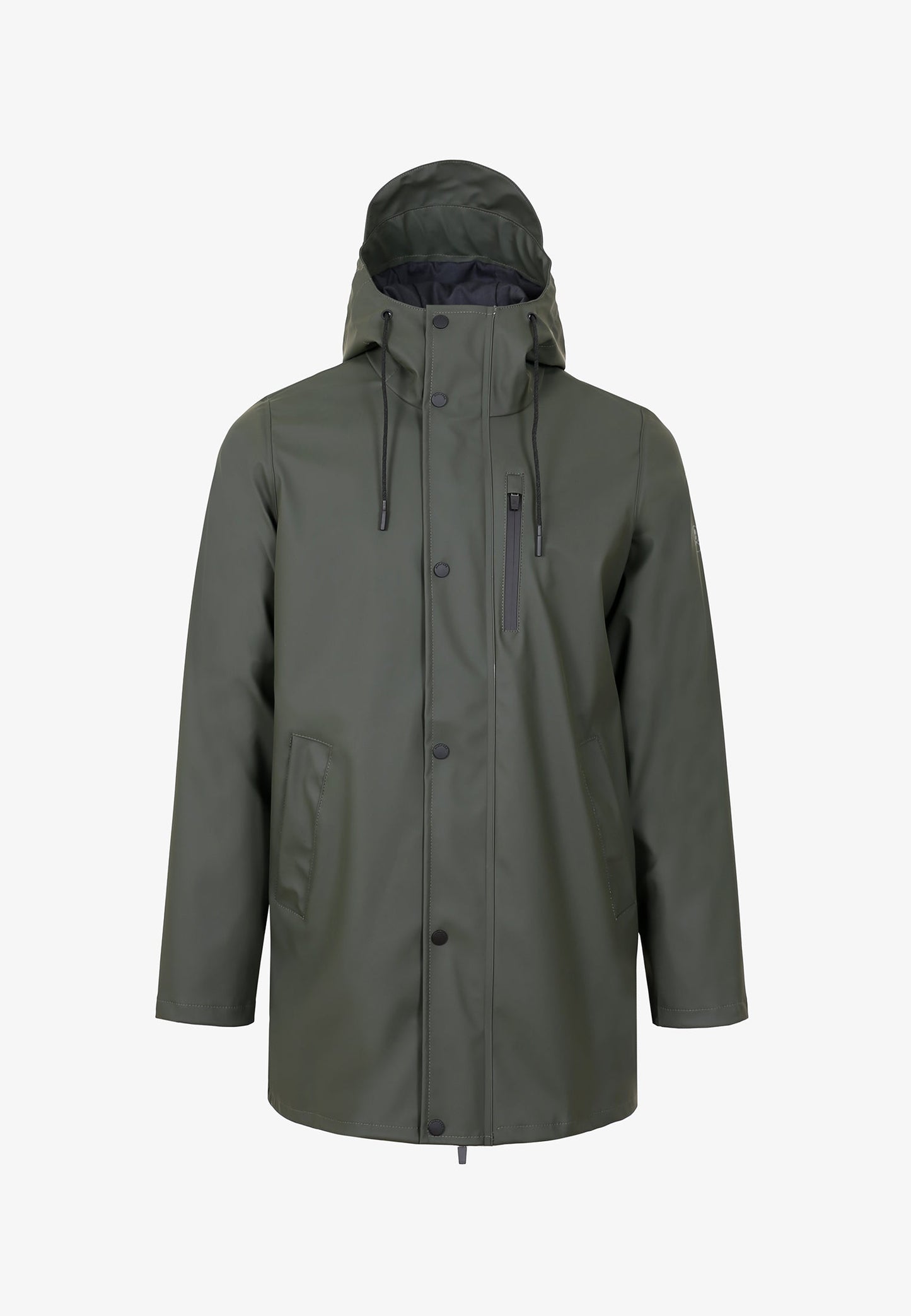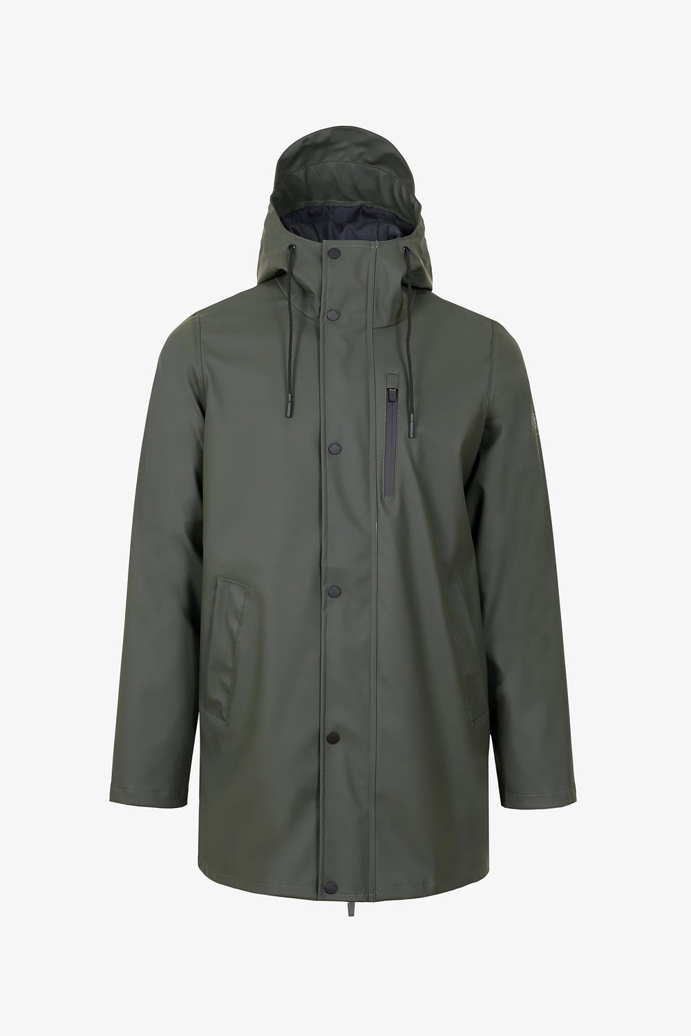 Chaquetón impermeable. Corte Regular Fit, cuello con capucha ajustable y cierre con cremallera de doble carro termosellada y botones automáticos. Manga larga terminada en puño con botones automáticos. Bolsillos de cremallera en pecho e insertados en cintura. Abertura trasera.