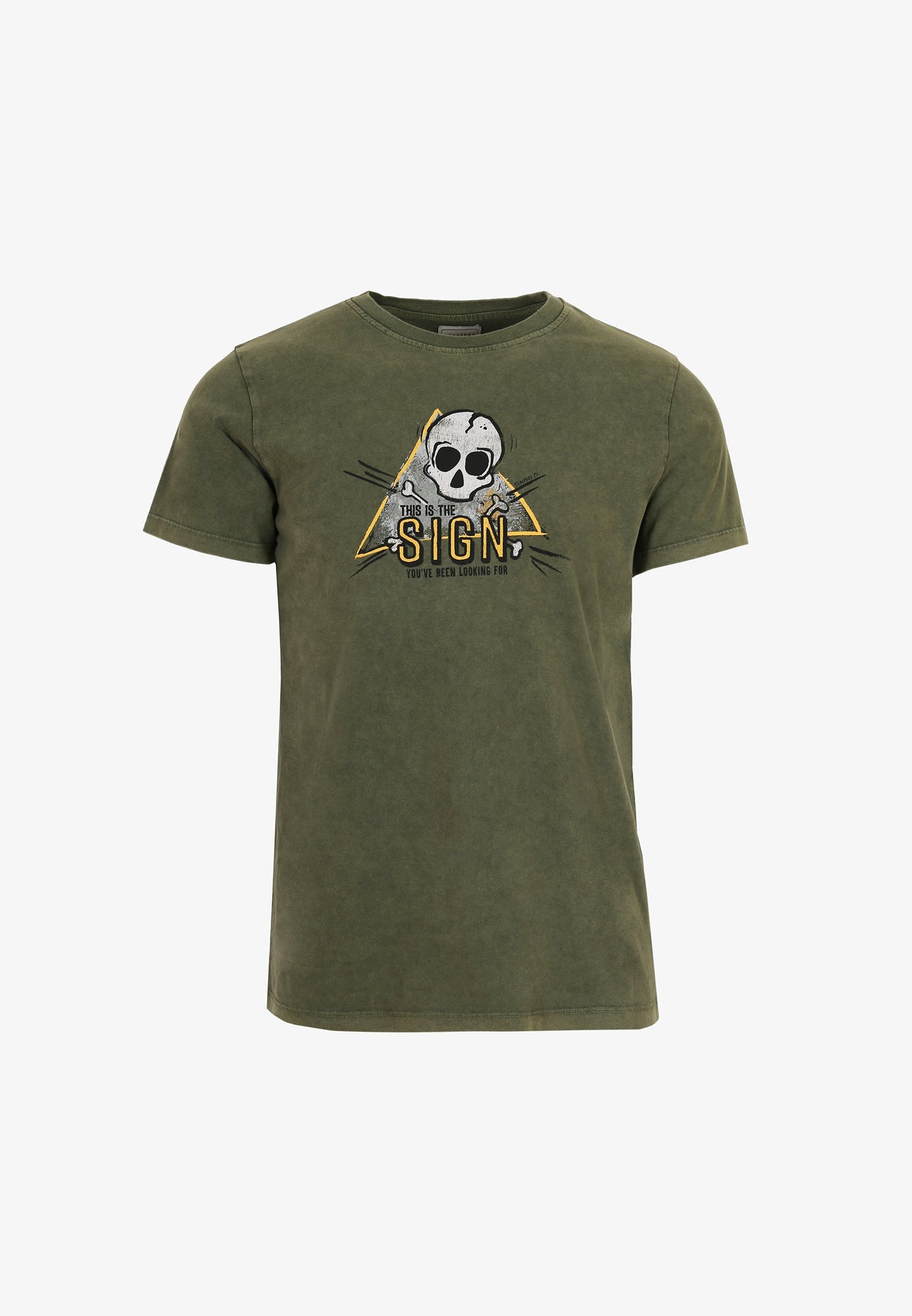 Camiseta lavada confeccionada en tejido 100% algodón reciclado. Corte Regular Fit, cuello redondo y manga corta. Detalle de print delantero.