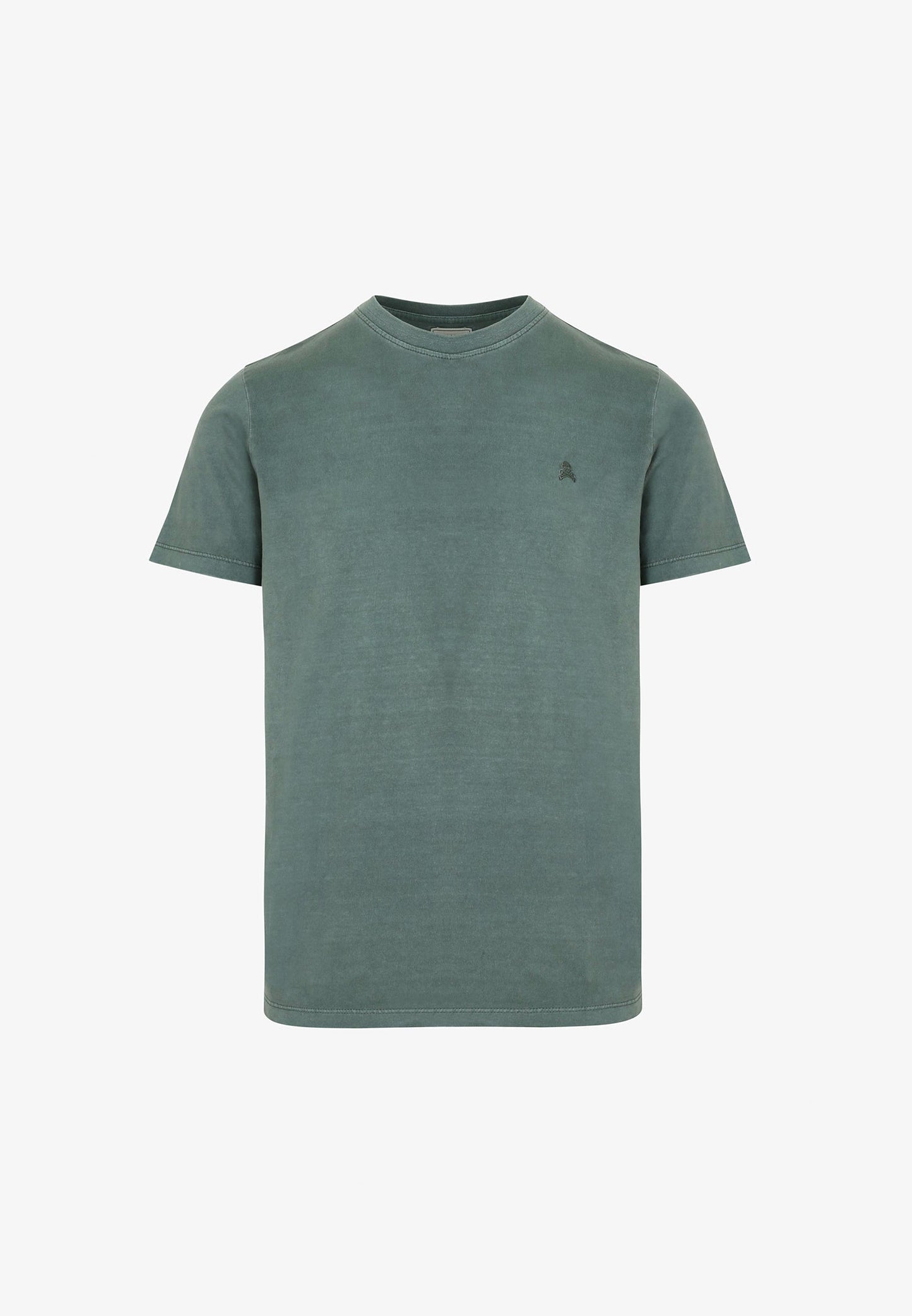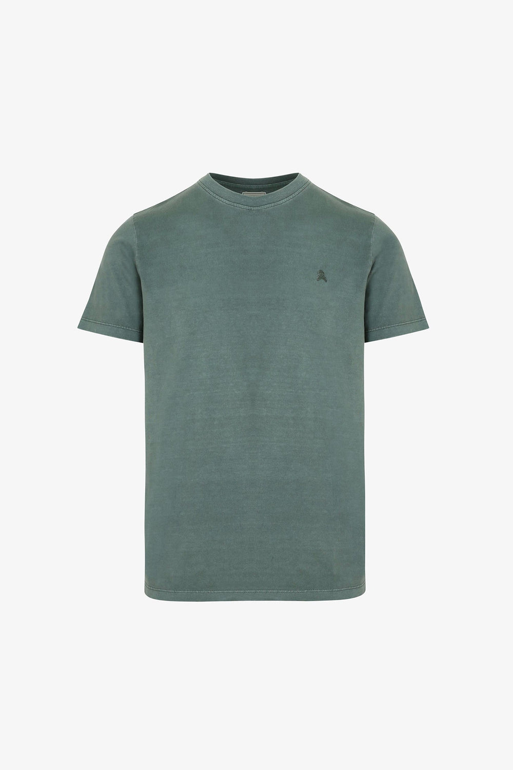 Camiseta básica confeccionada en tejido 100% algodón garment dyed. Corte Regular Fit, cuello redondo y manga corta. Detalle de calavera bordada a tono en el pecho.