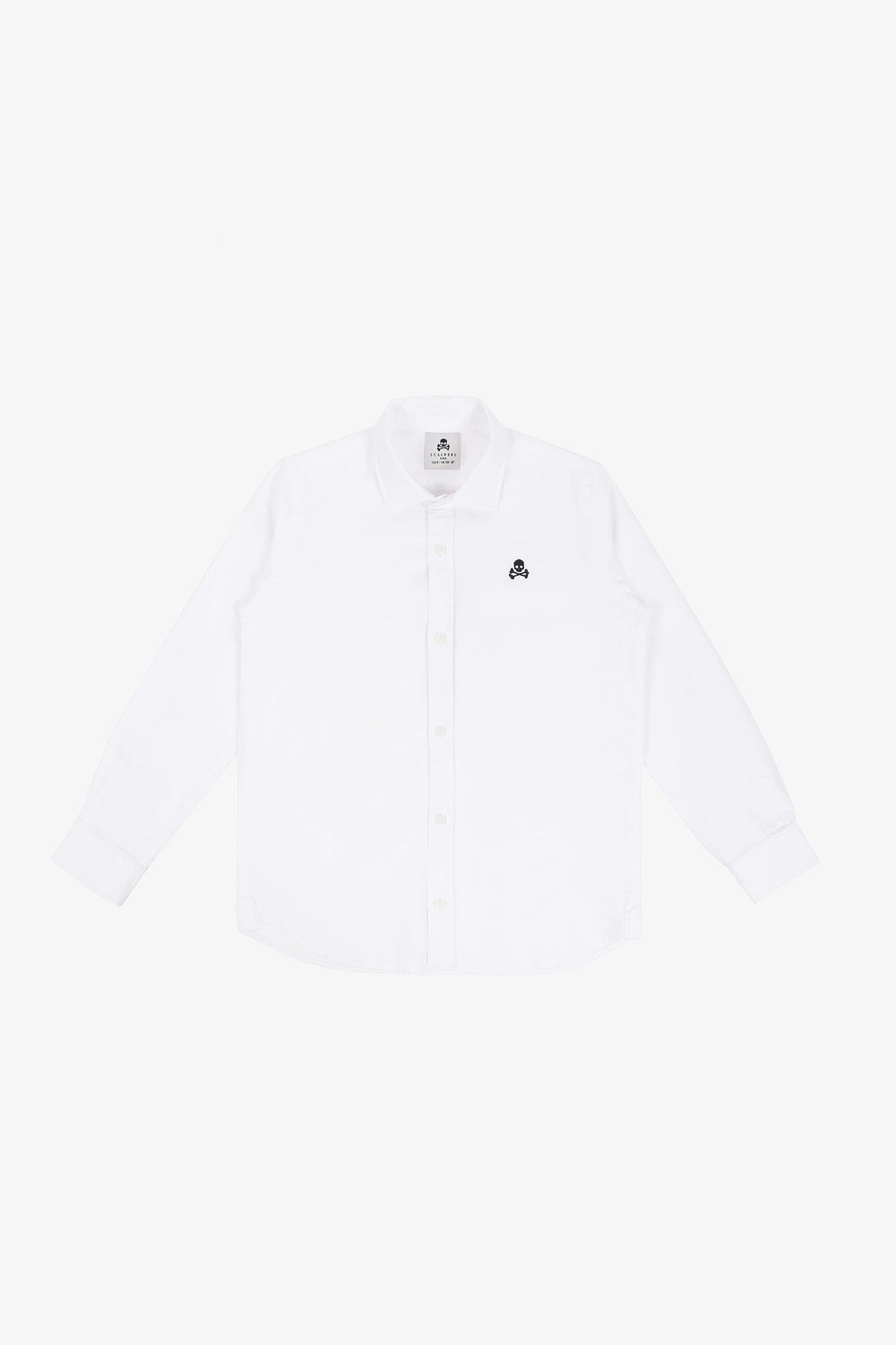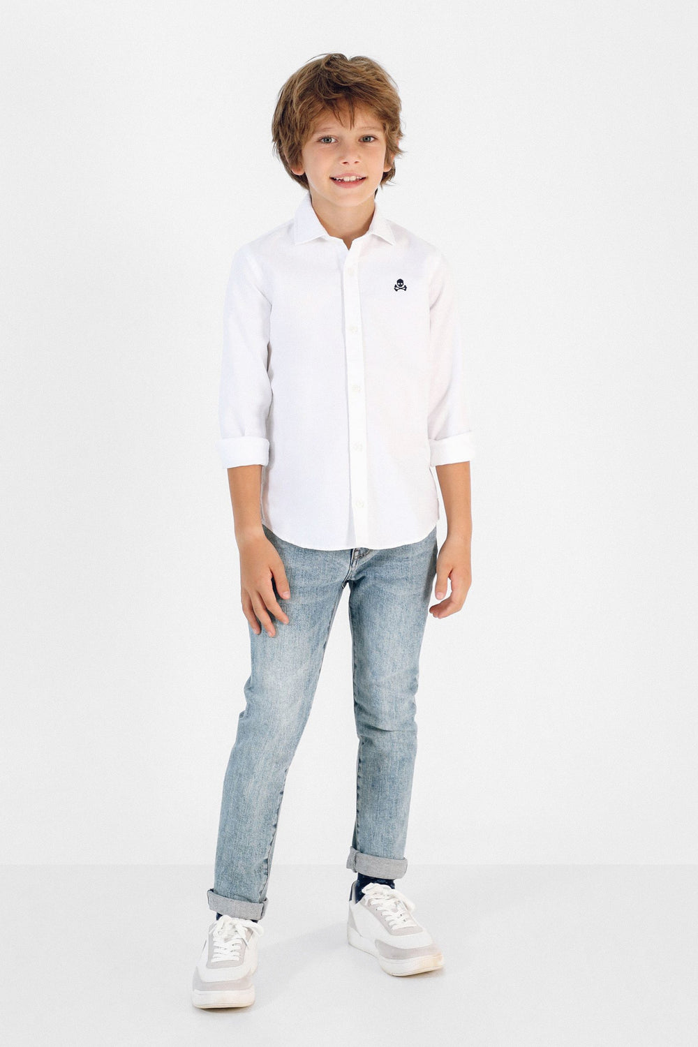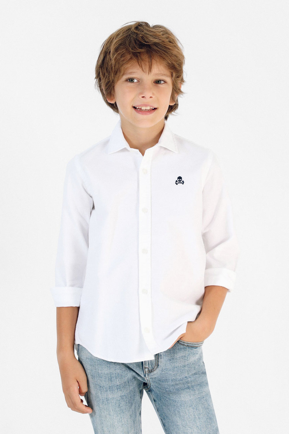 Camisa confeccionada en tejido 100% algodón orgánico. Corte Regular Fit, cuello clásico y cierre con botones. Manga larga terminada en puño doble y detalle de calavera bordada a contraste.