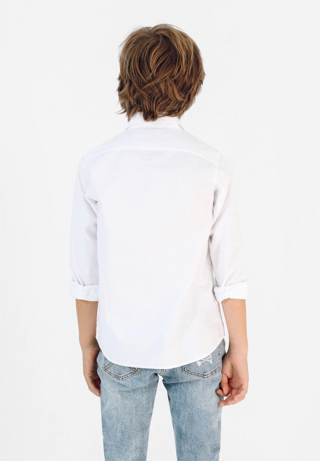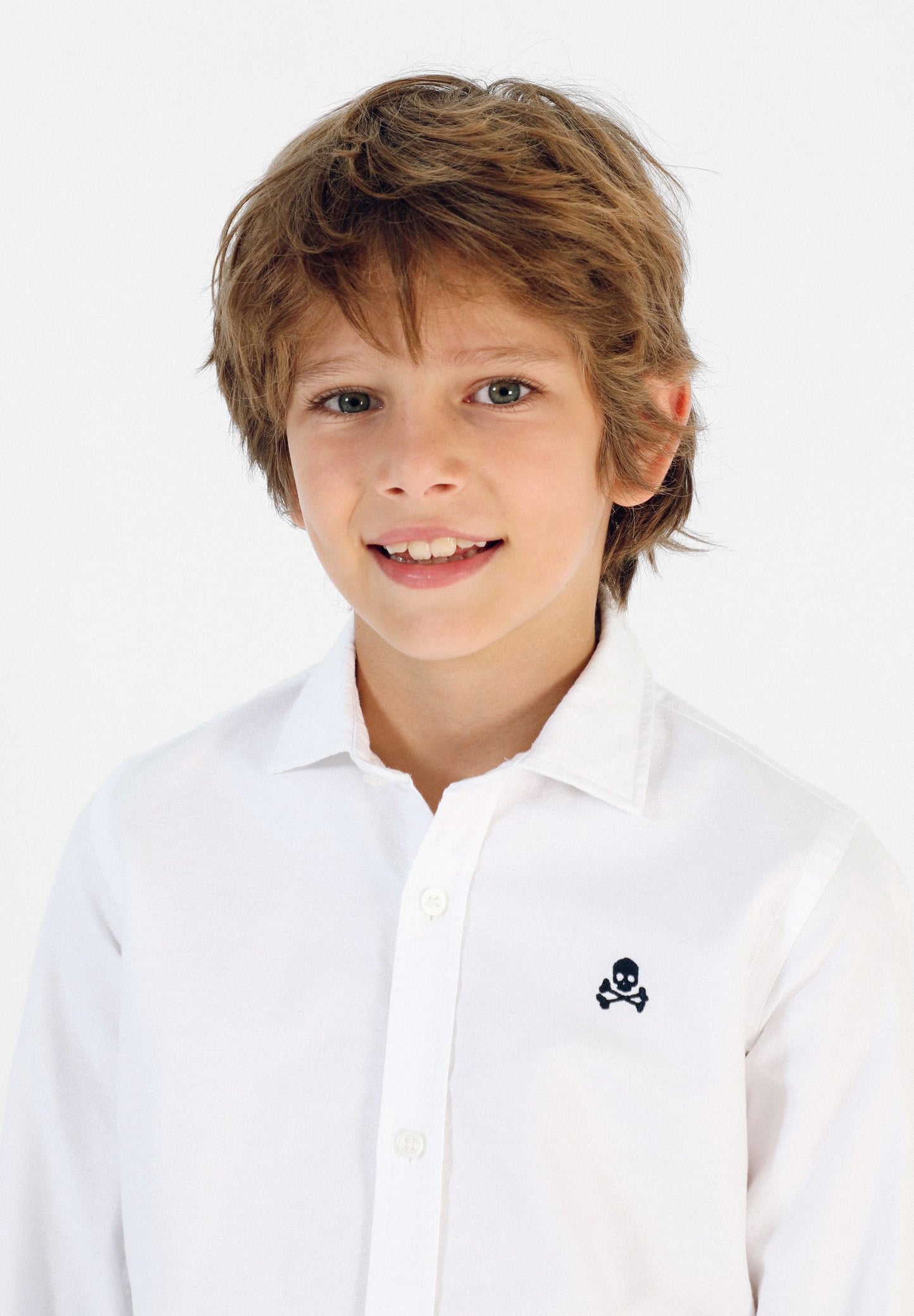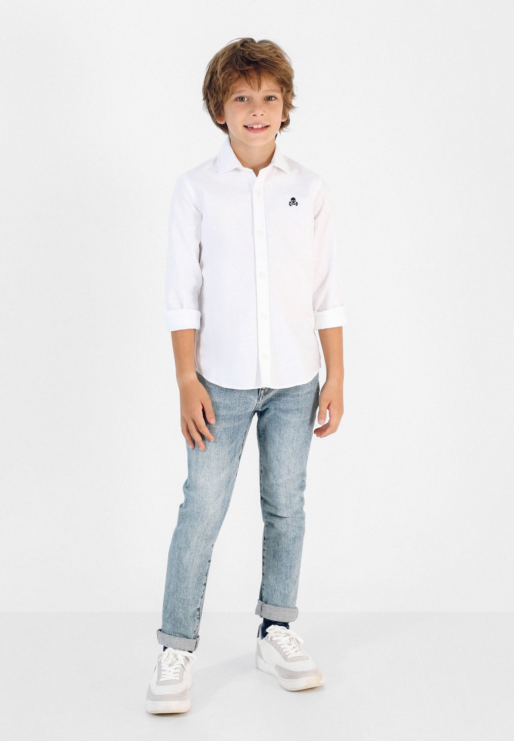 Camisa confeccionada en tejido 100% algodón orgánico. Corte Regular Fit, cuello clásico y cierre con botones. Manga larga terminada en puño doble y detalle de calavera bordada a contraste.